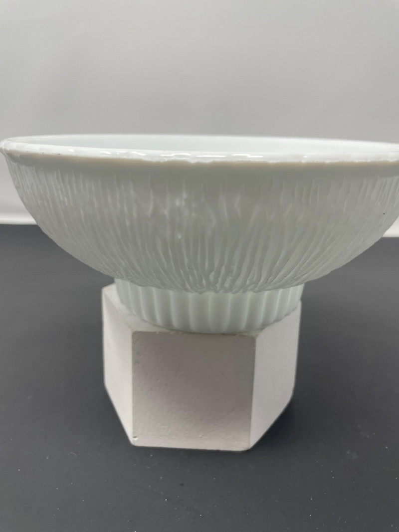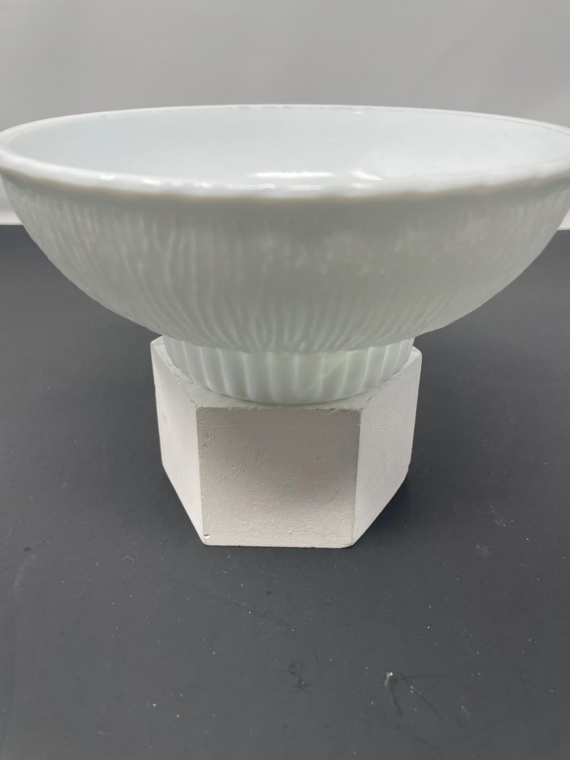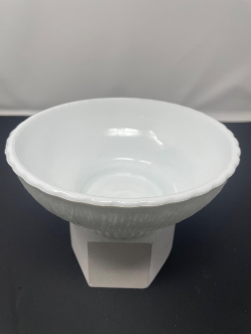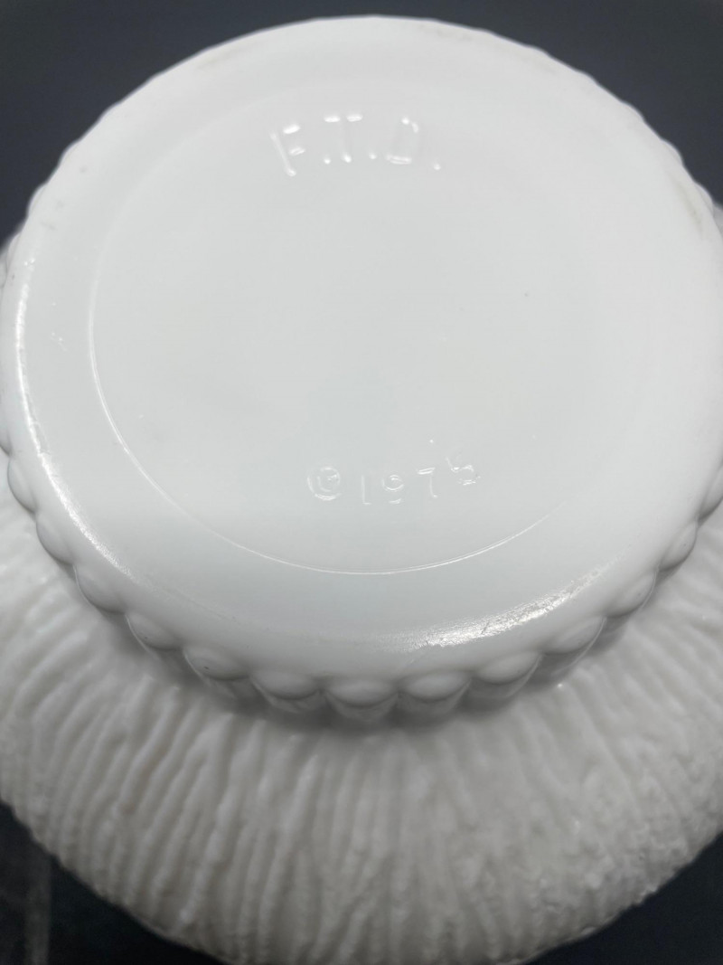 Mid-Century Modernist or Postmodernist Hand-Blown art Glass Vases. The milky, opaque white color and organic, biomorphic shapes are characteristic of several notable designers and manufacturer Vintage 1975 FTD Milk White Footed Planter or Bowl. Design: Features a ribbed or "tree root" textured surface on the exterior with a scalloped ed