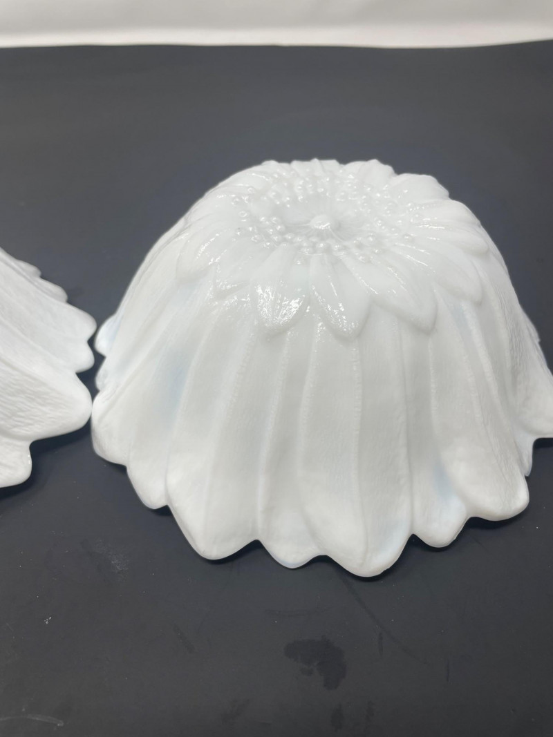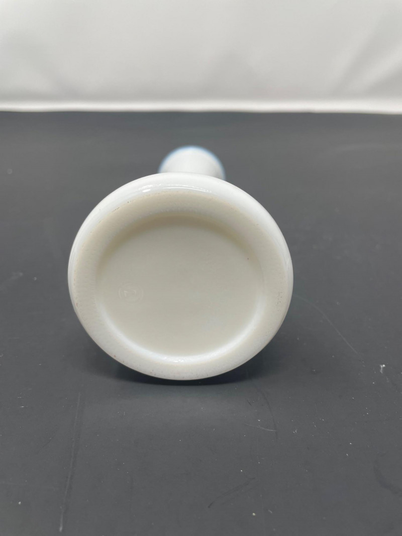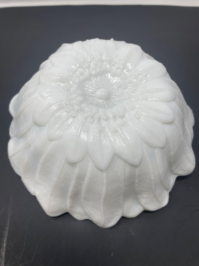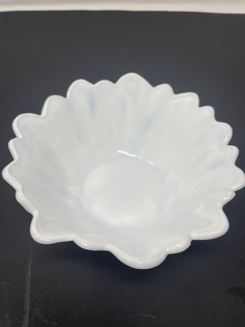 Mid-Century Modernist or Postmodernist Hand-Blown art Glass Vases. The milky, opaque white color and organic, biomorphic shapes are characteristic of several notable designers and manufacturer Vintage 1975 FTD Milk White Footed Planter or Bowl. Design: Features a ribbed or "tree root" textured surface on the exterior with a scalloped ed
