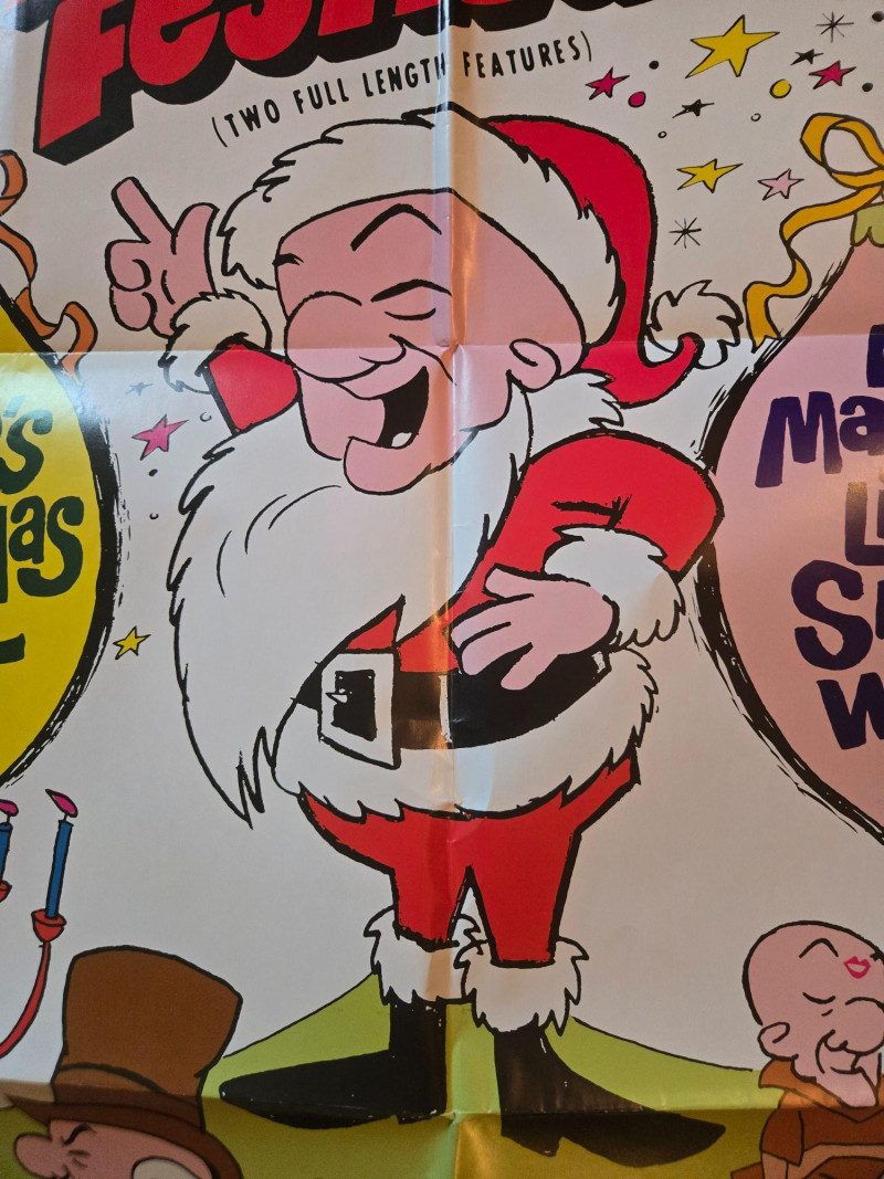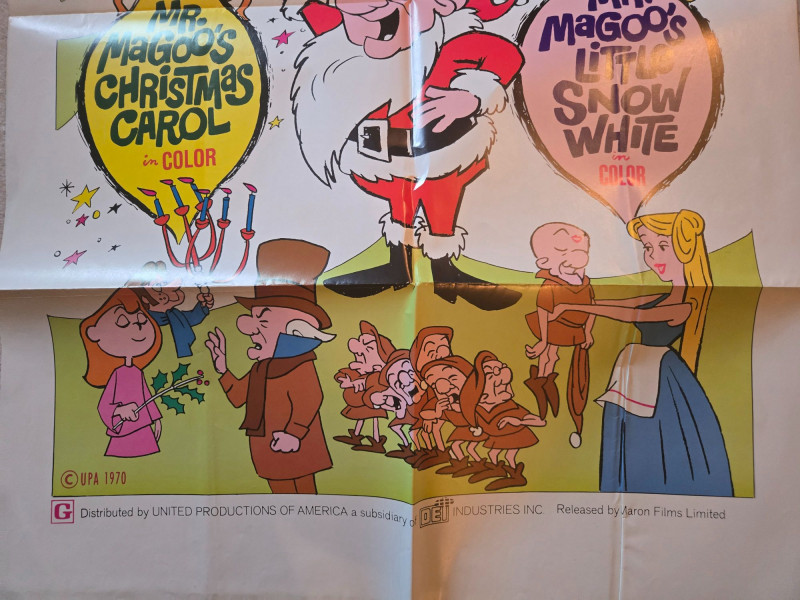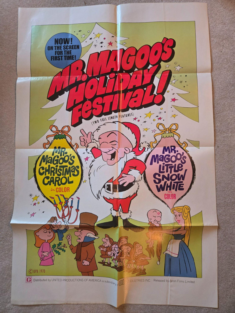 A bright, nostalgic vintage‑style movie poster for “Mr. Magoo’s Holiday Festival!” (1970), celebrating two beloved full‑length animated features: Mr. Magoo’s Christmas Carol and Mr. Magoo’s Little Snow White. This decorative reprint captures the cheerful, whimsical charm of classic UPA animation and mid‑century holiday entertainment. The poster bursts with festive color, featuring Mr. Magoo dressed as Santa at the center, surrounded by lively characters from both films. Stylized Christmas trees, stars, and bold typography create a joyful, eye‑catching layout that radiates vintage holiday spirit. It’s a perfect blend of nostalgia, animation history, and seasonal charm. Features Mr. Magoo’s Christmas Carol (Color) Features Mr. Magoo’s Little Snow White (Color) © UPA 1970 Distributed by United Productions of America (a subsidiary of Decca Industries Inc.) Released by Auron Films Limited Poster appears clean and well‑preserved based on the provided image Visible creases, please see in the photos UnframedLarge “Mr. Magoo’s Holiday Special” Movie Poster