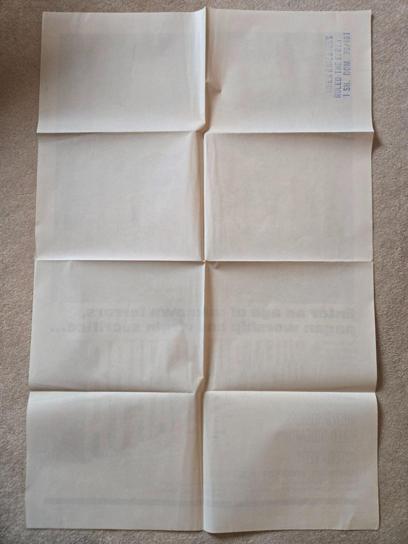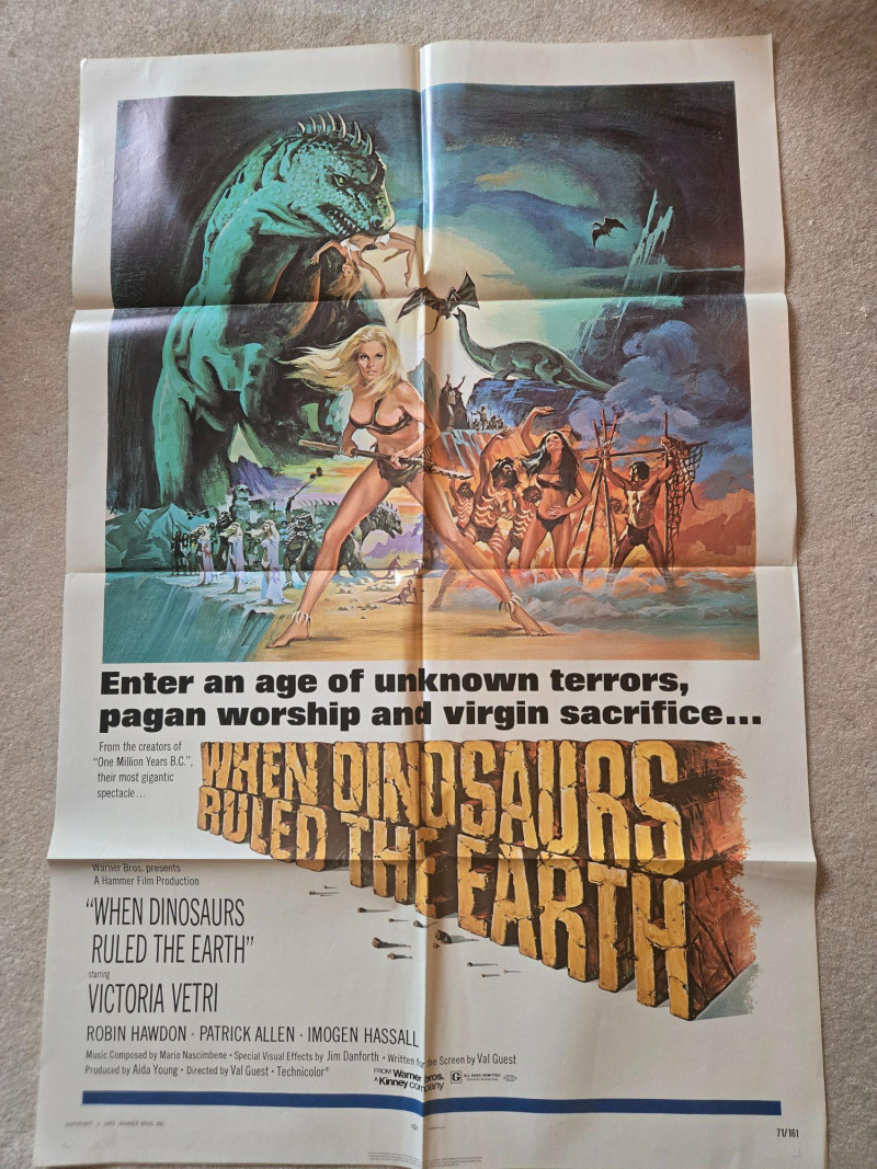 A dramatic, high‑impact vintage‑style movie poster for “When Dinosaurs Ruled the Earth” (1970), Hammer Films’ prehistoric spectacle known for its imaginative creature effects and bold adventure themes. This decorative reprint captures the film’s blend of fantasy, danger, and visual grandeur. The poster bursts with dynamic artwork: a massive green dinosaur lunging toward a fleeing figure, a heroine in primitive costume readying her weapon, and a chaotic backdrop of erupting volcanoes and storm‑lit skies. Flying reptiles, tribal figures, and swirling action complete the composition, creating a vivid tableau of prehistoric peril. The bold title treatment and tagline emphasize the film’s epic, mythic tone. Starring Victoria Vetri With Robin Hawdon, Patrick Allen, Imogen Hassall Directed by Val Guest Written for the screen by Val Guest Produced by Aida Young Special Visual Effects by Jim Danforth Music by Mario Nascimbene A Hammer Film Production Released by Warner Bros. Presented in Technicolor Visible creases, please see photos Unframed“When Dinosaurs Ruled the Earth” Movie Poster