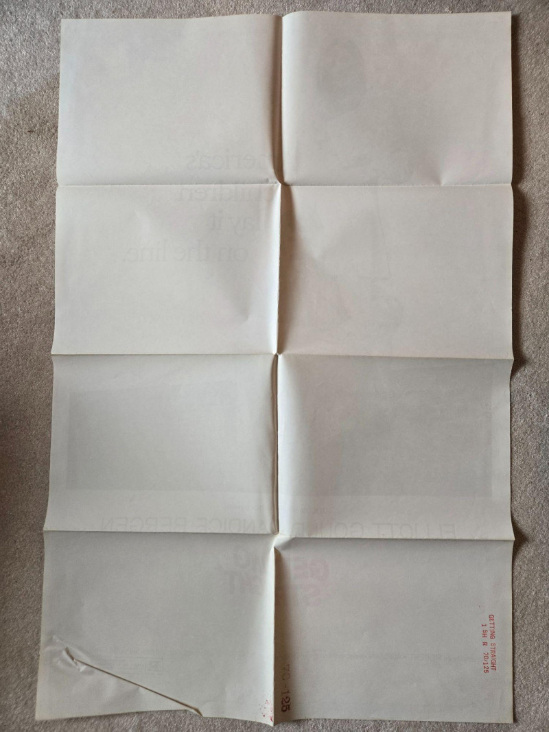 A bold, era‑defining vintage‑style movie poster for “Getting Straight” (1970), the counterculture campus drama starring Elliott Gould and Candice Bergen. This decorative reprint captures the film’s raw energy, generational tension, and the social upheaval of the early 1970s. The poster features a striking photograph of the two leads—Gould seated against a brick wall with his trademark intensity, and Bergen standing above him holding books, embodying the film’s blend of activism, romance, and academic rebellion. The soft peach background and clean typography give the design a distinctly early‑70s aesthetic, emphasizing the film’s themes of youth, protest, and personal conviction. Starring Elliott Gould & Candice Bergen Screenplay by Robert Kaufman Based on the novel by Ken Kolb Music by Ronald Stein Produced & Directed by Richard Rush A Columbia Pictures release Rated R Visible creases, see photos Unframed“Getting Straight” w/ Elliott Gould & Candice Bergen Movie Poster