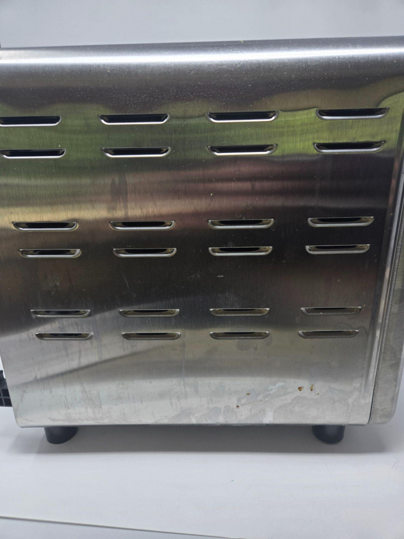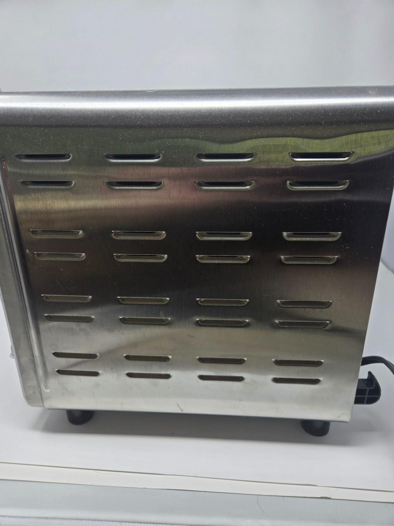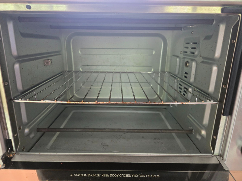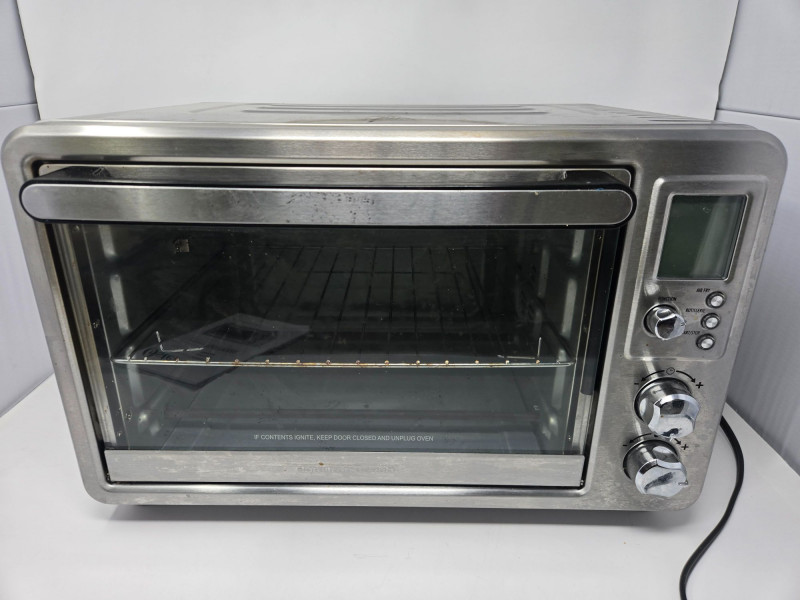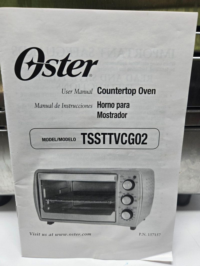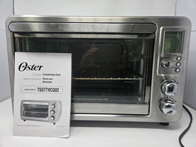 A stainless‑steel Oster countertop oven, model TSSTTVCG02, featuring a clear glass door, interior wire rack, and three side‑mounted control knobs for temperature, function, and timer settings. The unit includes its original user manual, offering full operating instructions and specifications. This compact oven is suitable for toasting, baking, reheating, and small‑batch cooking, making it a versatile addition to kitchens, offices, dorms, or accessory cooking spaces. Oven needs a good a cleaning, but well‑maintained with no visible dents or damage. Interior rack and controls are intact. As with all pre‑owned appliances, expect normal signs of use.Oster Counter Top Oven