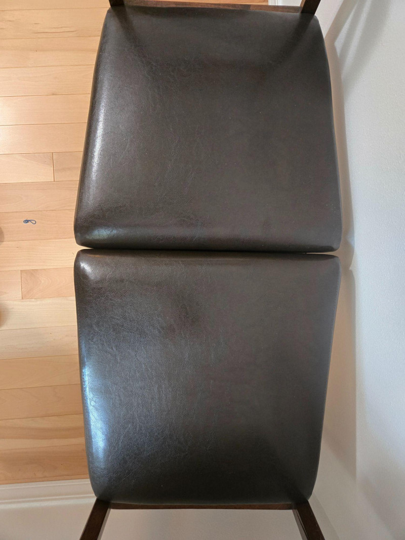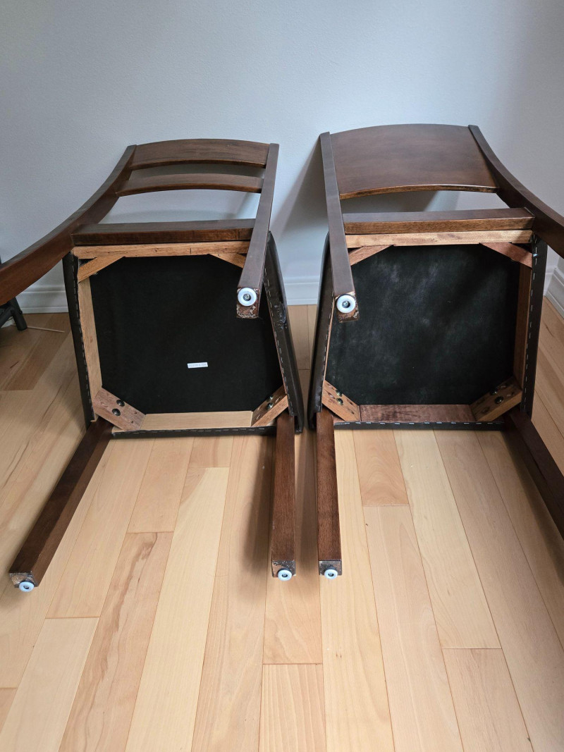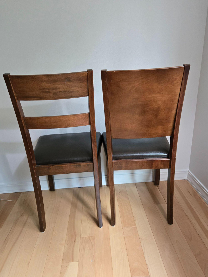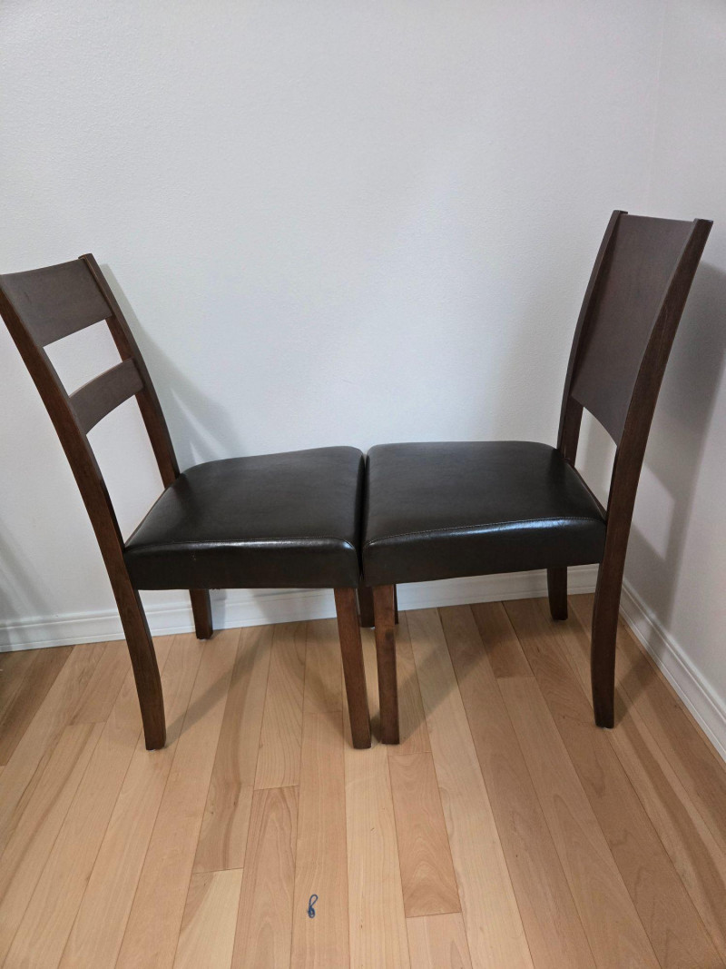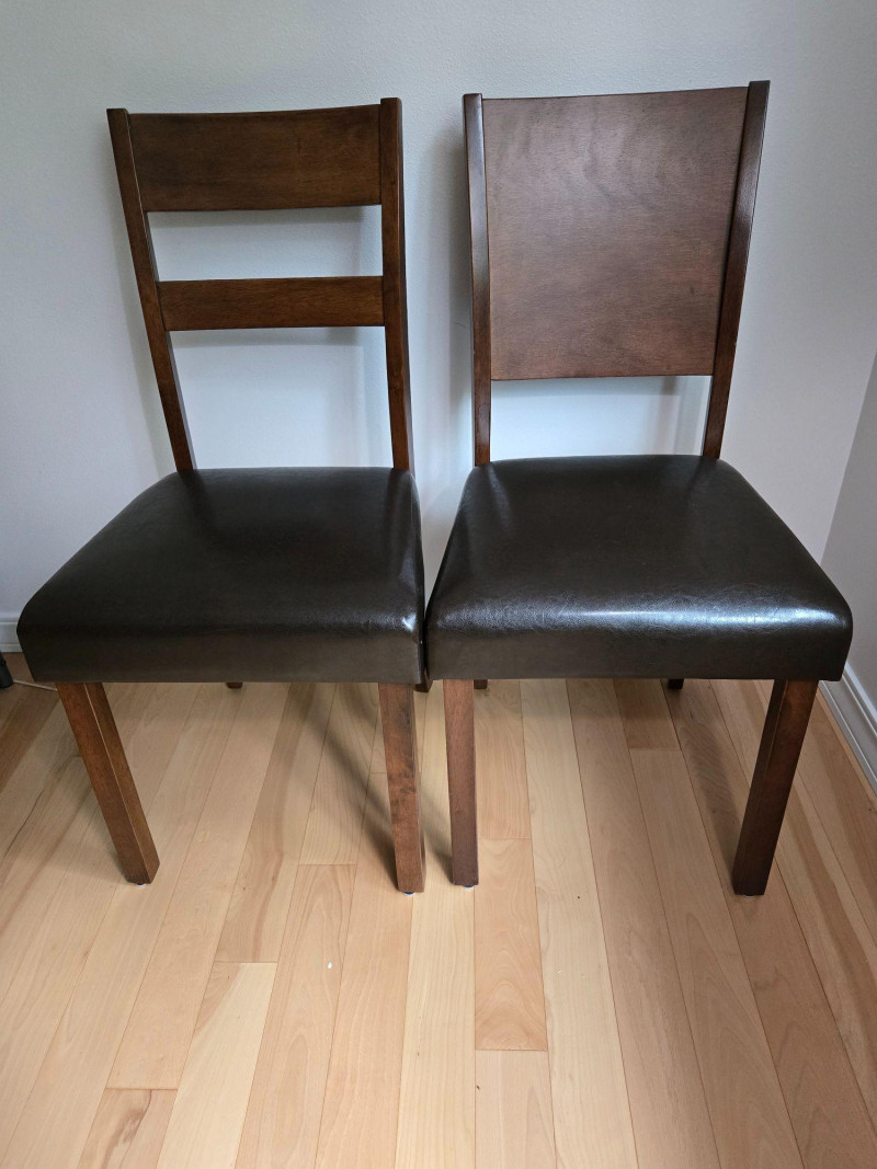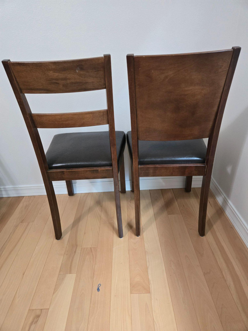 Approx 36"t to top of back of chair, 18"t to top of seat, 18"d & w. A pair of well‑crafted wooden chairs featuring dark faux‑leather cushioned seats and two distinct backrest designs. One chair includes a double‑slat back, while the other has a solid panel back, giving the pair a complementary but not identical look. Both chairs offer sturdy construction, comfortable seating, and a warm wood finish suitable for dining areas, offices, or accent seating. (As listed on your lot page) Approx. 36" tall to top of back 18" seat height 18" deep 18" wide Both chairs are clean and structurally sound with no major visible flaws. As with all pre‑owned furniture, expect normal signs of use. Pair of Well-Crafted Chairs