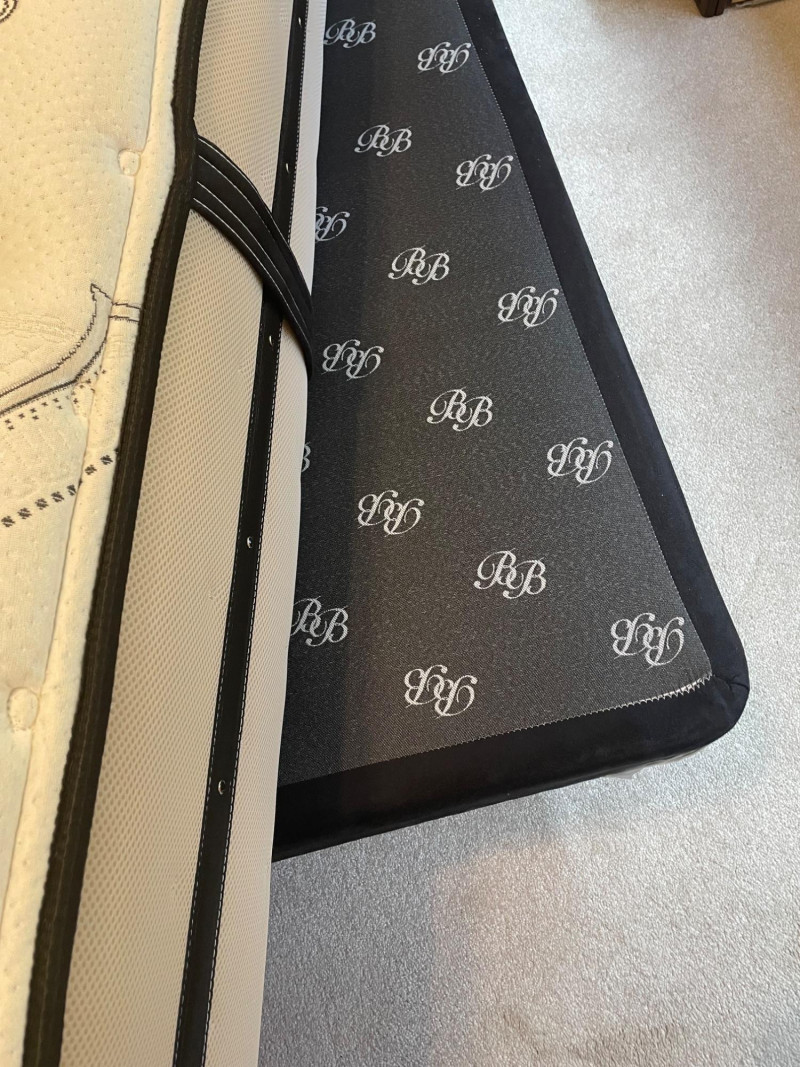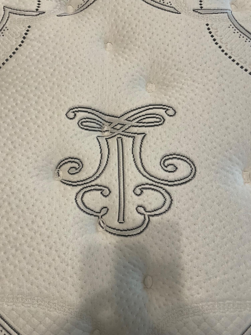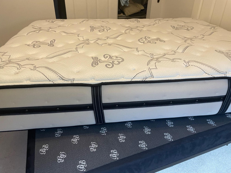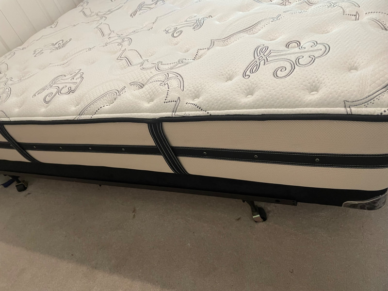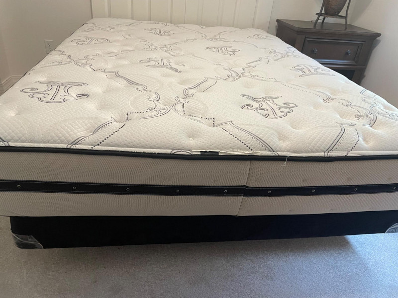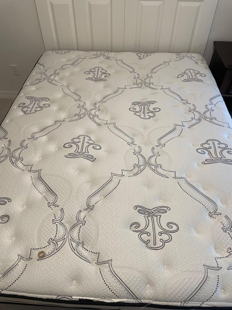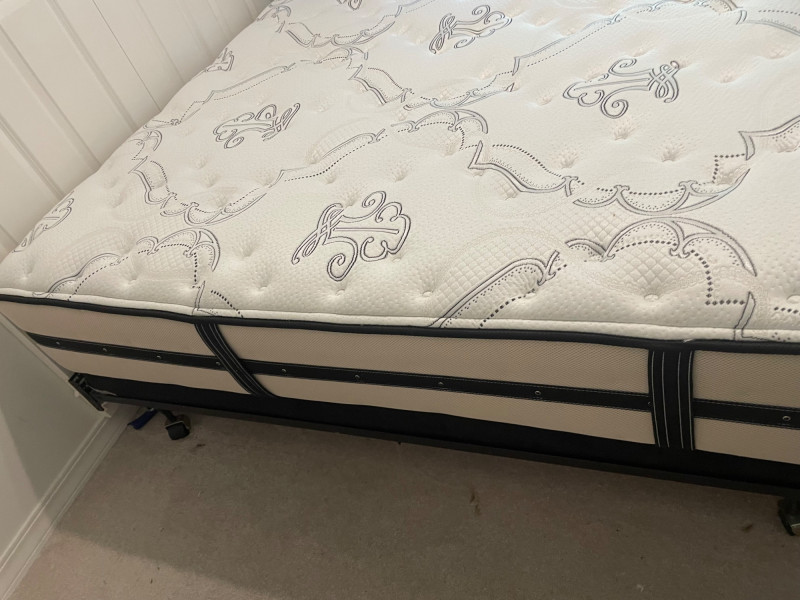 The Queen mattress has distinct scrolling, ornate crest-like embroidery and the black-on-white quilted design are signature elements of the Beautyrest Black luxury line. Approx. 60" x 80" A Beautyrest Queen mattress featuring ornate scrolling embroidery and a black‑on‑white quilted top — design elements associated with the Beautyrest Black luxury line. Approx. size: 60" × 80" Includes: Queen mattress, matching box spring, and metal frame The listing notes typical expectations for used items: normal wear may be present, and all items are sold AS IS, WHERE IS. No returns.Beautyrest Queen Mattress, Box Spring and Frame