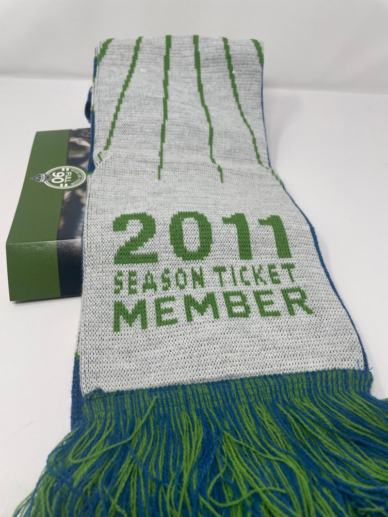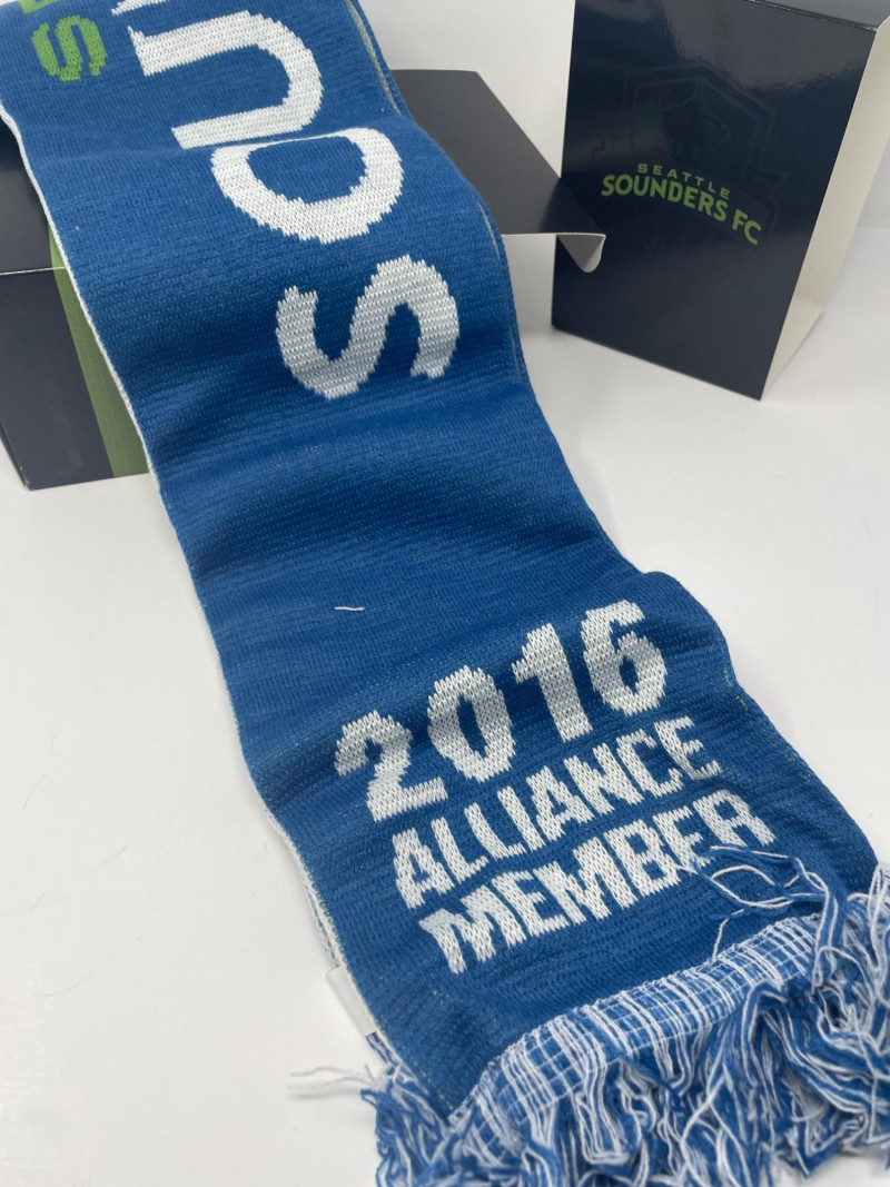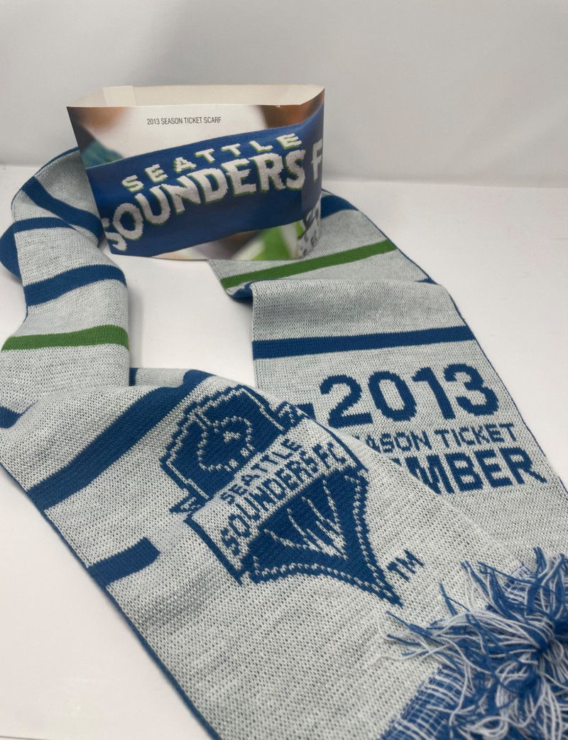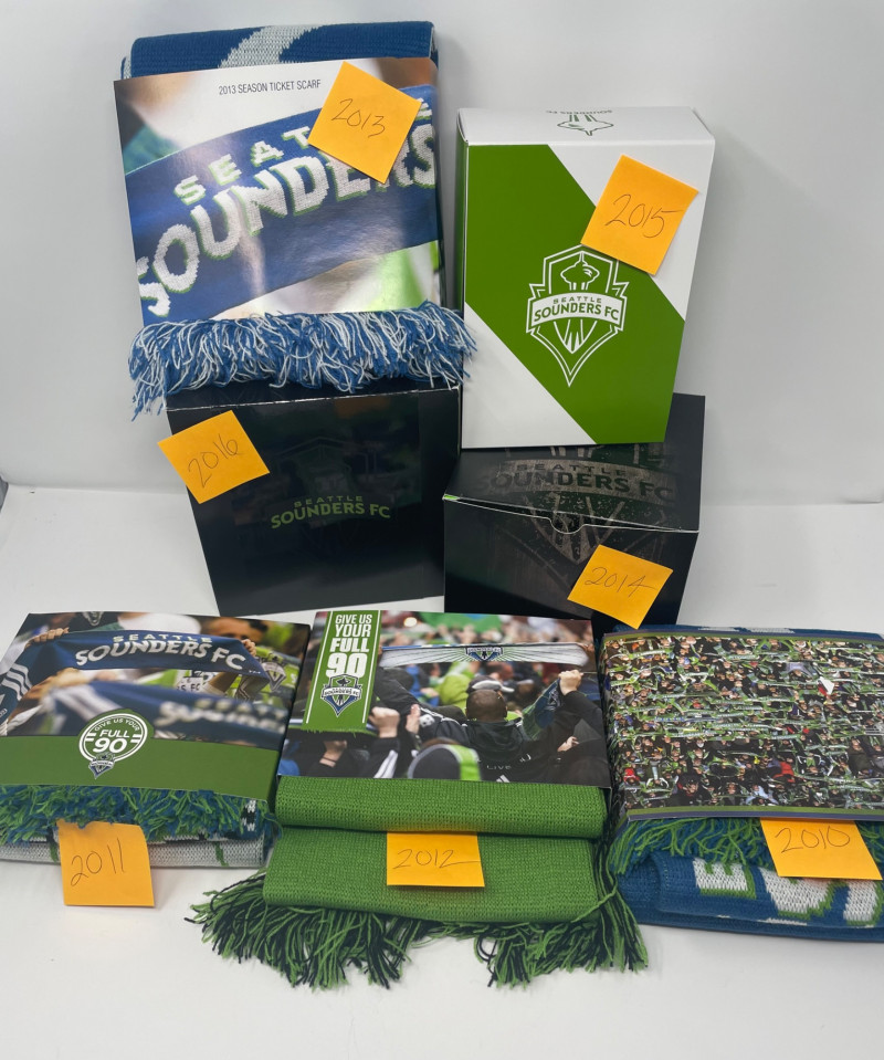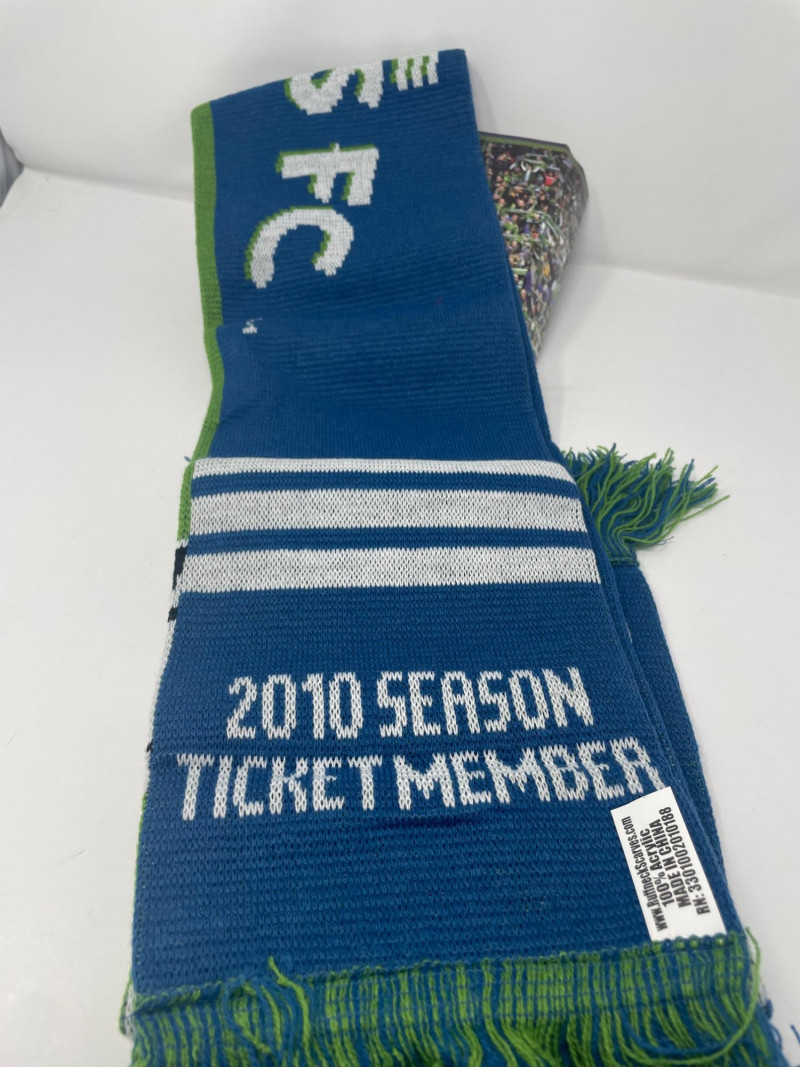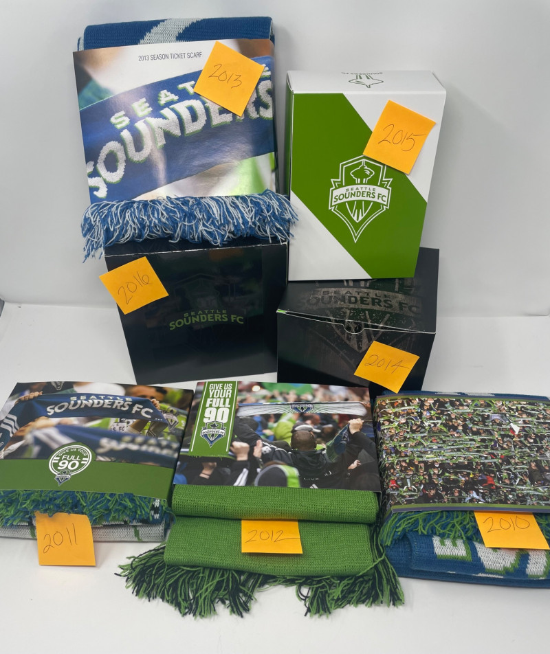 All Scarfs are unused most in original boxes This is collection features various Seattle Sounders FC season ticket holder scarves and memorabilia from multiple years. The scarves are officially licensed by Major League Soccer (MLS) and often produced by Ruffneck Seattle Sounders FC Alliance Member scarves spanning the years 2010 to 2016. These annual scarves are a long-standing tradition, typically included as a gift in the season ticket member (Alliance) package each year