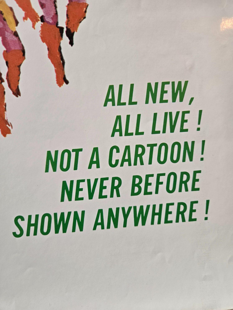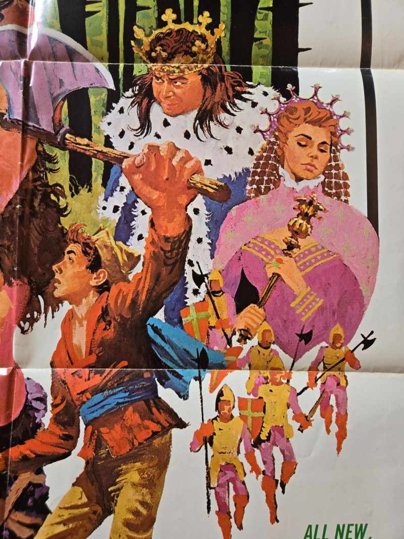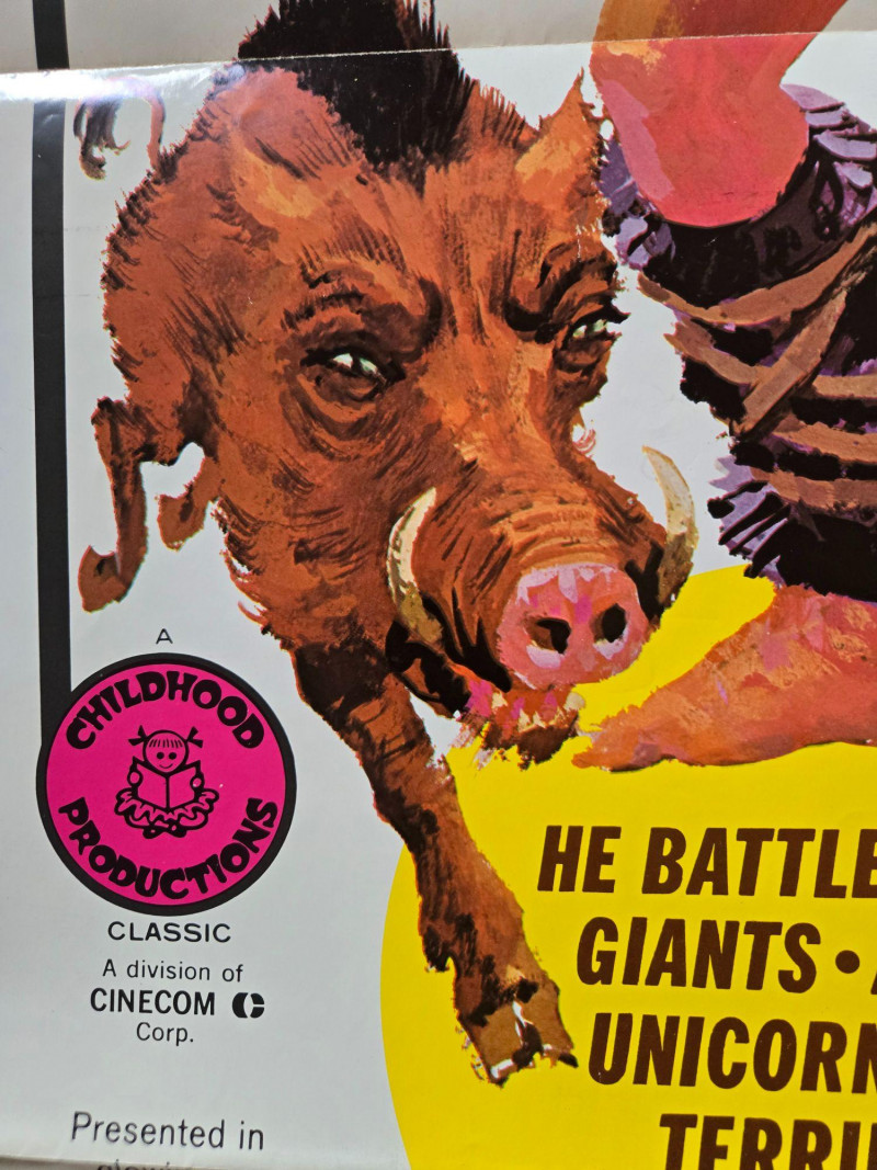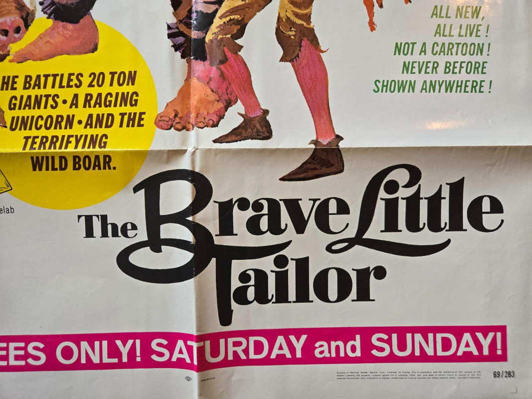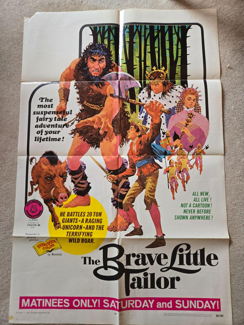 A bold, action‑packed vintage‑style poster for “The Brave Little Tailor,” presented as an all‑live fairy‑tale adventure. This decorative reprint captures the thrilling, larger‑than‑life energy of classic children’s matinee productions, filled with fantasy creatures, heroic challenges, and vibrant theatrical flair. The poster bursts with dramatic, colorful artwork: a towering giant swinging an axe, a fierce wild boar charging forward, a regal king and queen observing the chaos, and the brave young tailor at the center of it all. The dark forest backdrop and dynamic poses create a sense of danger and excitement, while bold promotional text promises an unforgettable adventure “never before shown anywhere.” The overall design evokes mid‑century children’s theater posters—whimsical, exaggerated, and irresistibly eye‑catching. Presented by Childhood Productions / Classic Cincom Co. “All New, All Live! Not a Cartoon!” Filmed in Stardom Color by Movielab Weekend matinee promotional artwork Visible creases, see photos Unframed“The Brave Little Tailor” Movie Poster