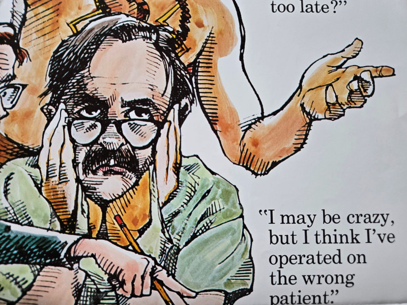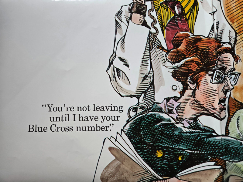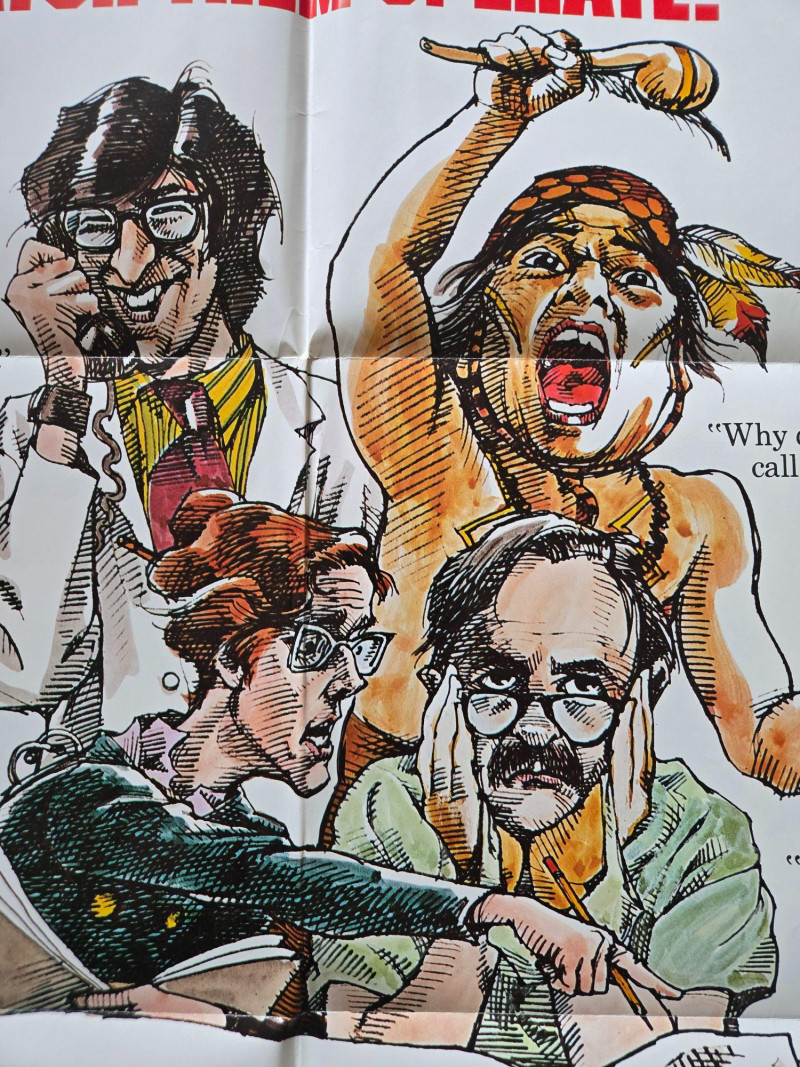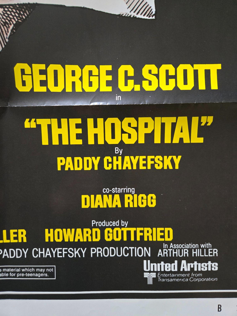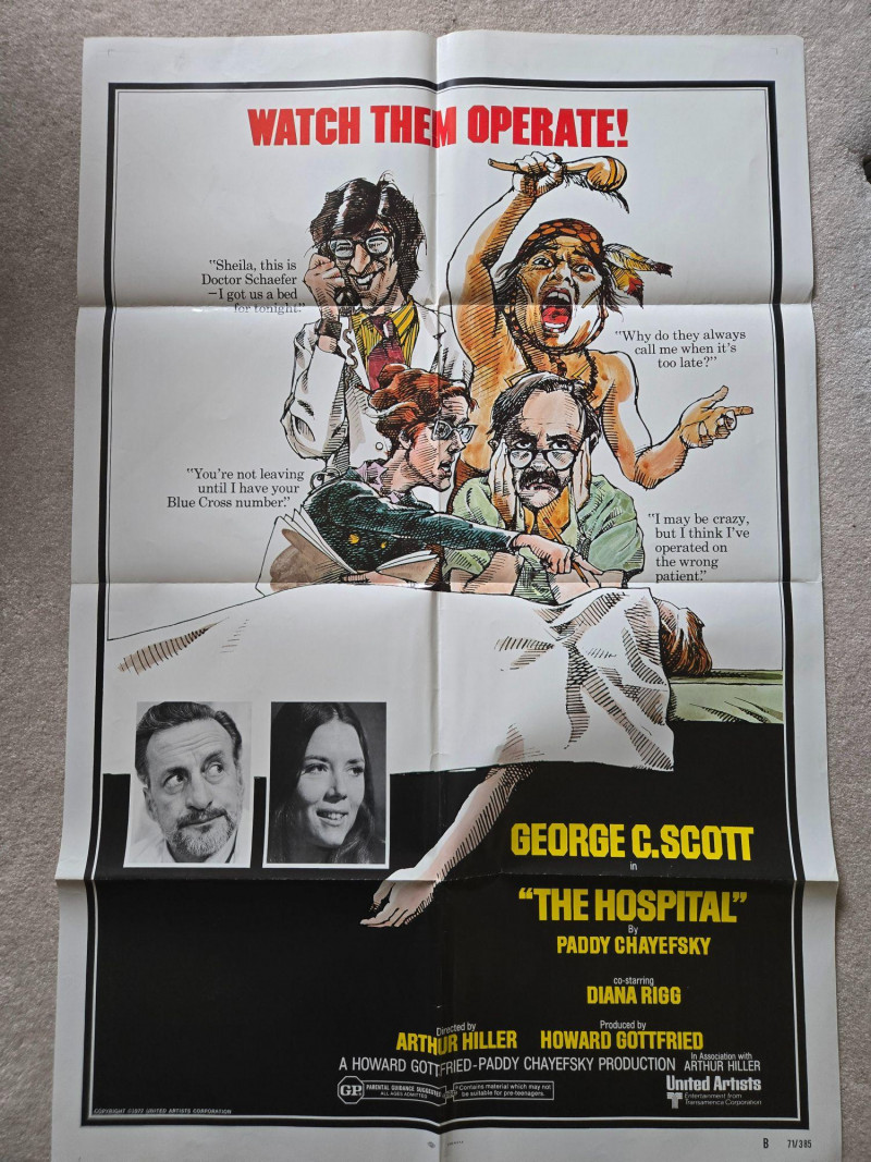A sharp, satirical vintage‑style movie poster for “The Hospital” (1971), the dark comedy starring George C. Scott and Diana Rigg. This decorative reprint captures the film’s chaotic humor and its biting critique of the modern medical system. The poster showcases a lively, caricature‑style illustration of doctors, nurses, and patients in a whirlwind of medical misadventures—perfectly reflecting the film’s blend of absurdity and social commentary. Bold red text at the top commands attention, while humorous quotes scattered throughout hint at the film’s sharp wit and escalating chaos. Black‑and‑white portraits of George C. Scott and Diana Rigg anchor the bottom section, grounding the playful artwork with the film’s acclaimed leads. Starring George C. Scott Co‑starring Diana Rigg Written by Paddy Chayefsky Directed by Arthur Hiller Produced by Howard Gottfried A Howard Gottfried–Paddy Chayefsky Production Released by United Artists Rated GP Visible creases, see photos Unframed “The Hospital” Movie Poster