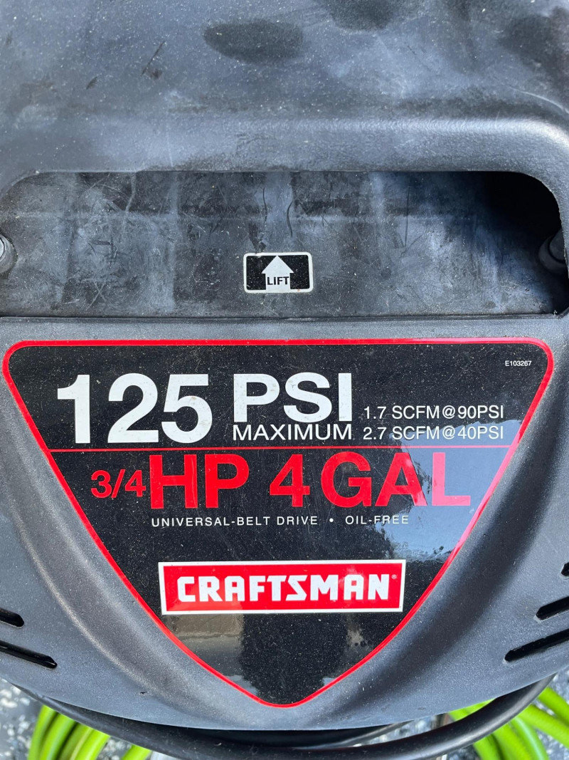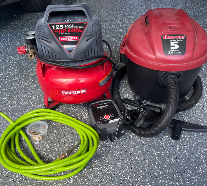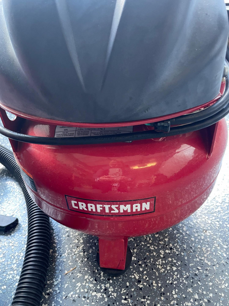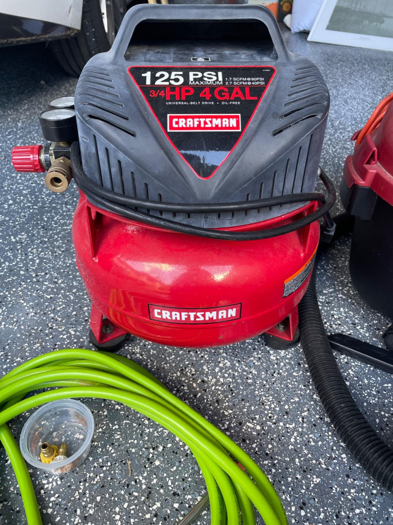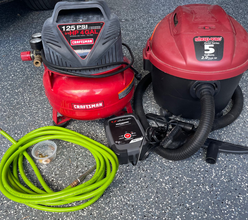 Craftsman 4-Gallon Air Compressor and a Shop-Vac Quiet Series 5-Gallon Wet/Dry Vacuum. Craftsman Compressor: A pancake-style unit with a 4-gallon tank capacity, featuring a 125 PSI maximum pressure. Accessories: Includes a green pneumatic hose and a small container of fittings. Battery Charger: A Schumacher brand battery charger is also presen Features: It includes dual gauges for monitoring tank and outlet pressure, along with a regulator knob for precise control Shop-Vac Wet/Dry Vacuum Performance: This model typically features a 2.0 Peak HP motor and is designed for both wet and dry debris. Schumacher Battery Charger Schumacher SC1279 8-Amp Rapid Battery Charger and Maintainer Function: It is a fully automatic 12V charger suitable for standard, AGM, and gel batteries. Air Hose The bright green hose is a high-visibility hybrid air hose, similar to the Flexzilla brand. Material: These are typically made from a hybrid polymer that remains flexible even in cold temperatures and resists kinking