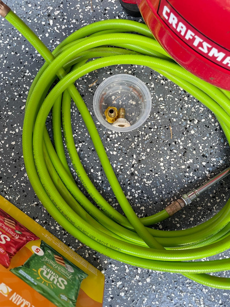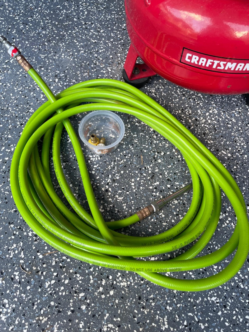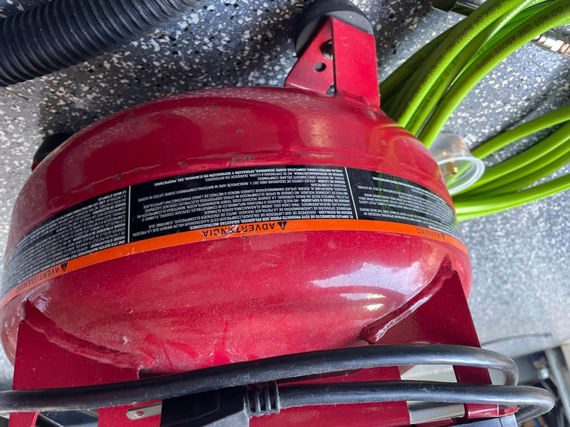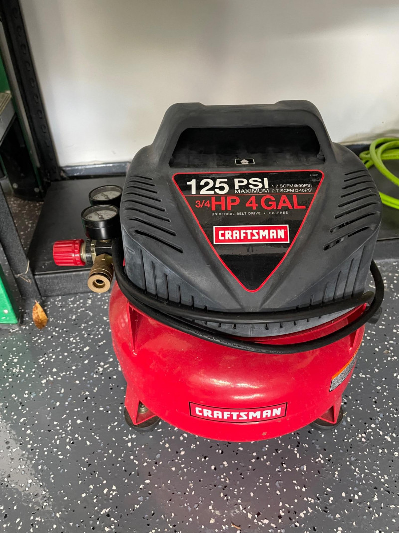 Craftsman 4-Gallon Air Compressor and a Shop-Vac Quiet Series 5-Gallon Wet/Dry Vacuum. Craftsman Compressor: A pancake-style unit with a 4-gallon tank capacity, featuring a 125 PSI maximum pressure. Accessories: Includes a green pneumatic hose and a small container of fittings. Battery Charger: A Schumacher brand battery charger is also presen Features: It includes dual gauges for monitoring tank and outlet pressure, along with a regulator knob for precise control Shop-Vac Wet/Dry Vacuum Performance: This model typically features a 2.0 Peak HP motor and is designed for both wet and dry debris. Schumacher Battery Charger Schumacher SC1279 8-Amp Rapid Battery Charger and Maintainer Function: It is a fully automatic 12V charger suitable for standard, AGM, and gel batteries. Air Hose The bright green hose is a high-visibility hybrid air hose, similar to the Flexzilla brand. Material: These are typically made from a hybrid polymer that remains flexible even in cold temperatures and resists kinking