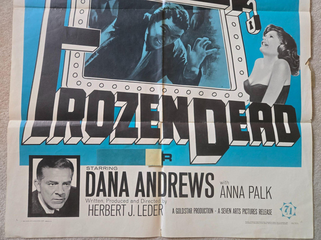 A bold, chilling vintage‑style movie poster for “The Frozen Dead” (1966), a cult horror‑sci‑fi thriller steeped in icy suspense and mid‑century genre flair. This decorative reprint captures the film’s eerie atmosphere, dramatic taglines, and unforgettable cryogenic imagery. The poster showcases striking blue‑and‑black artwork centered around the film’s chilling premise: men frozen alive for twenty years, now returning from their icy graves. The title appears in large, fractured block letters filled with haunting faces and terrified expressions. Behind the typography, a cryogenic chamber displays suspended bodies, reinforcing the film’s blend of science‑fiction and horror. The dramatic composition and sensational text embody the classic 1960s exploitation‑horror aesthetic—bold, graphic, and designed to grab attention. A Seven Arts Productions release Starring: Dana Andrews Anna Palk Written, produced, and directed by Herbert J. Leder A Goldstar Production Distributed by Seven Arts Pictures Visible tear & creases, please see photos Unframed Vintage “The Frozen Dead” Movie Poster