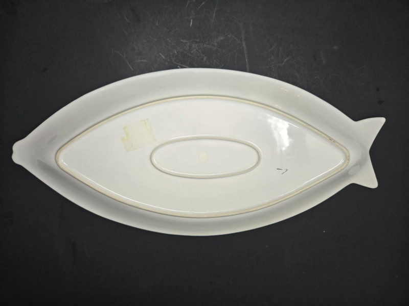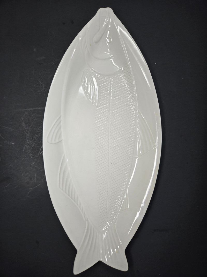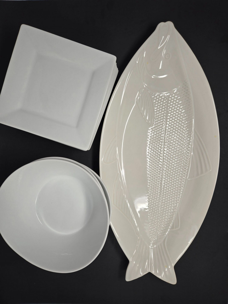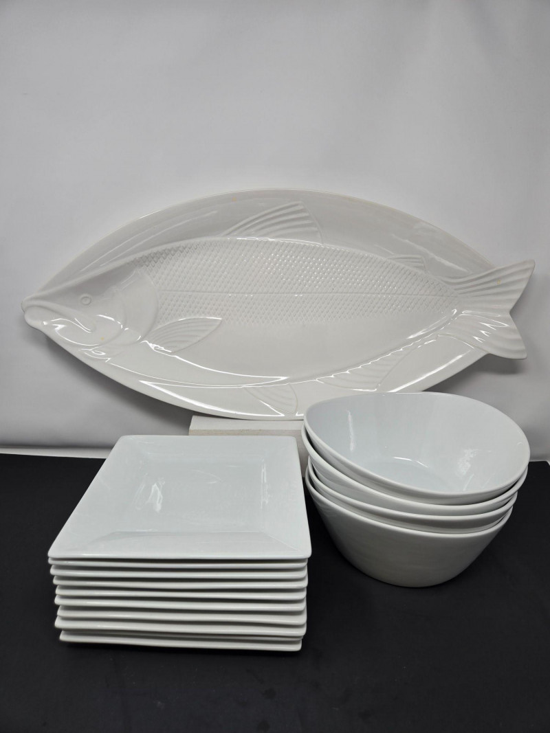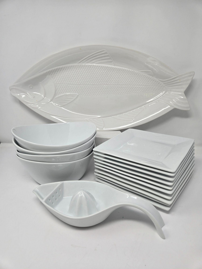 A coordinated and contemporary white serving collection featuring a mix of functional and decorative pieces ideal for everyday dining or stylish entertaining. This set includes: Large Fish‑Shaped Serving Platter — A sculptural centerpiece with raised detailing, perfect for seafood presentations or as a statement display piece. Six Deep Bowls — Modern curved forms suitable for soups, salads, noodles, or grain bowls. Ten Square Plates — Clean, minimalist design ideal for plating entrées, appetizers, or desserts. Citrus Juicer — A practical handled juicer with integrated spout for easy pouring. The crisp white palette creates a cohesive, versatile look that pairs beautifully with any table setting or kitchen décor. All pieces are clean, glossy, and well‑maintained with no visible chips or cracks. As with all pre‑owned ceramics, expect light wear consistent with normal use.White Serving Collection