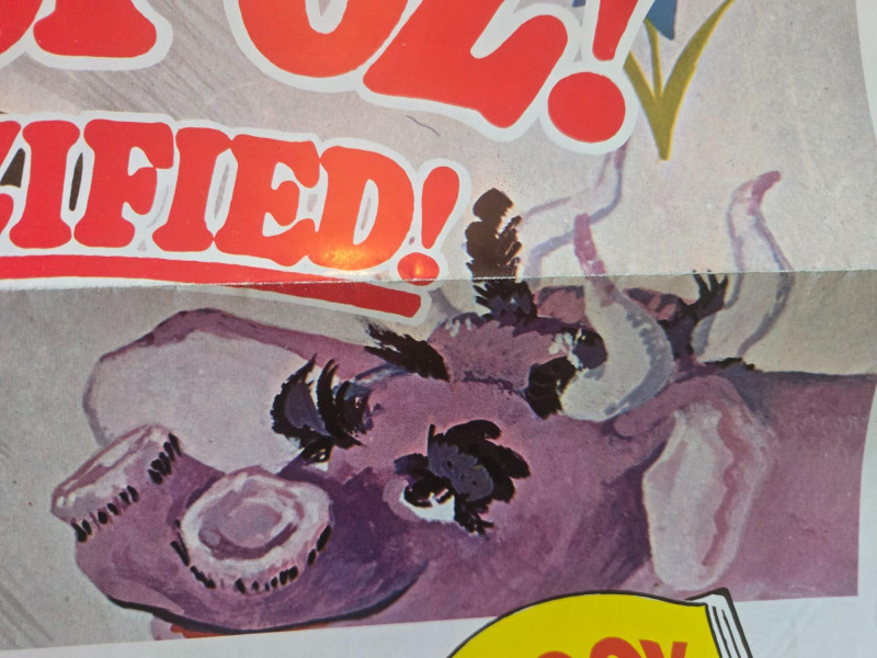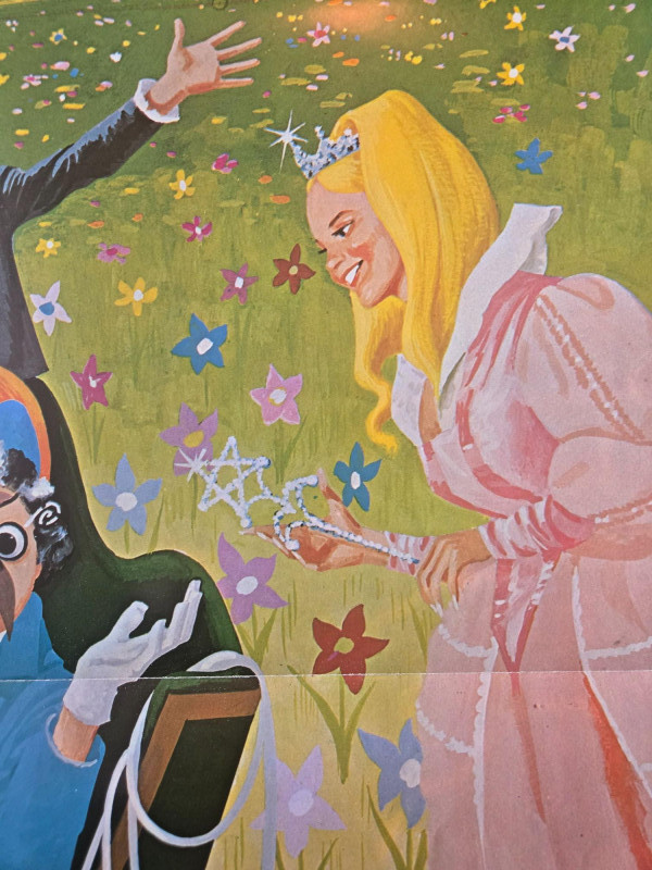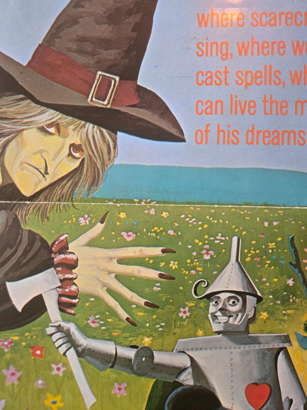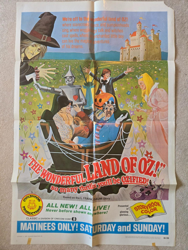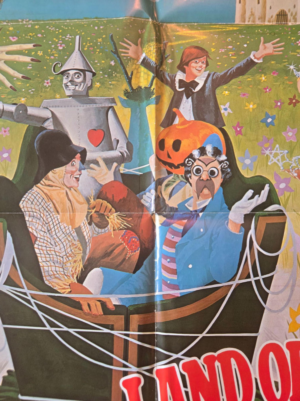 A vibrant, fantasy‑rich vintage‑style movie poster for “The Wonderful Land of Oz,” inspired by L. Frank Baum’s imaginative world of magic, mischief, and adventure. This decorative reprint captures the whimsical charm of mid‑century children’s theater and the colorful characters that make Oz unforgettable. The poster bursts with lively illustrations of Oz’s most iconic figures: a dancing Scarecrow, a friendly Tin Man, a pumpkin‑headed companion, witches casting spells, and a young adventurer stepping into a world of enchantment. A bright field of flowers and a distant castle set the stage for a journey “where scarecrows dance, pumpkinheads sing, wogglebugs talk, and witches cast spells.” The artwork is bold, theatrical, and full of motion—perfectly suited to the film’s promise of thrills that will leave viewers “Oz‑ified!” Based on the story by L. Frank Baum Presented by Childhood Productions / Classic (Cinemco Corp.) “All New! All Live! Never Before Shown Anywhere!” Presented in glowing, glorious Storybook Color Weekend matinee promotional artwork Visible creases, please see photos Unframed “The Wonderful Land of Oz” Movie Poster