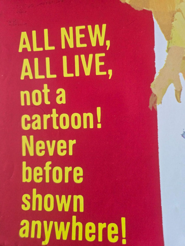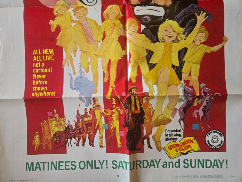 A colorful, circus‑bright vintage‑style movie poster for “The Clown & the Kids,” starring the legendary clown Emmett Kelly. This decorative reprint captures the warmth, whimsy, and nostalgic charm of mid‑century children’s entertainment. The poster features Emmett Kelly in his iconic sad‑faced makeup, surrounded by lively illustrations of children, circus performers, elephants, balloons, and parade scenes. The artwork radiates cheerful energy and classic circus magic, inviting viewers to “follow that loveable laugh‑king into kid‑country.” Bold promotional text emphasizes the production’s theatrical appeal—“All New, All Live, Not a Cartoon!”—making this a standout piece for fans of vintage family‑friendly shows. Starring Emmett Kelly “All New, All Live! Never Before Shown Anywhere!” Presented in glowing, glorious Storybook Color Weekend matinee promotional artwork Visible creases, please see photos“The Clown & the Kids” Movie Poster