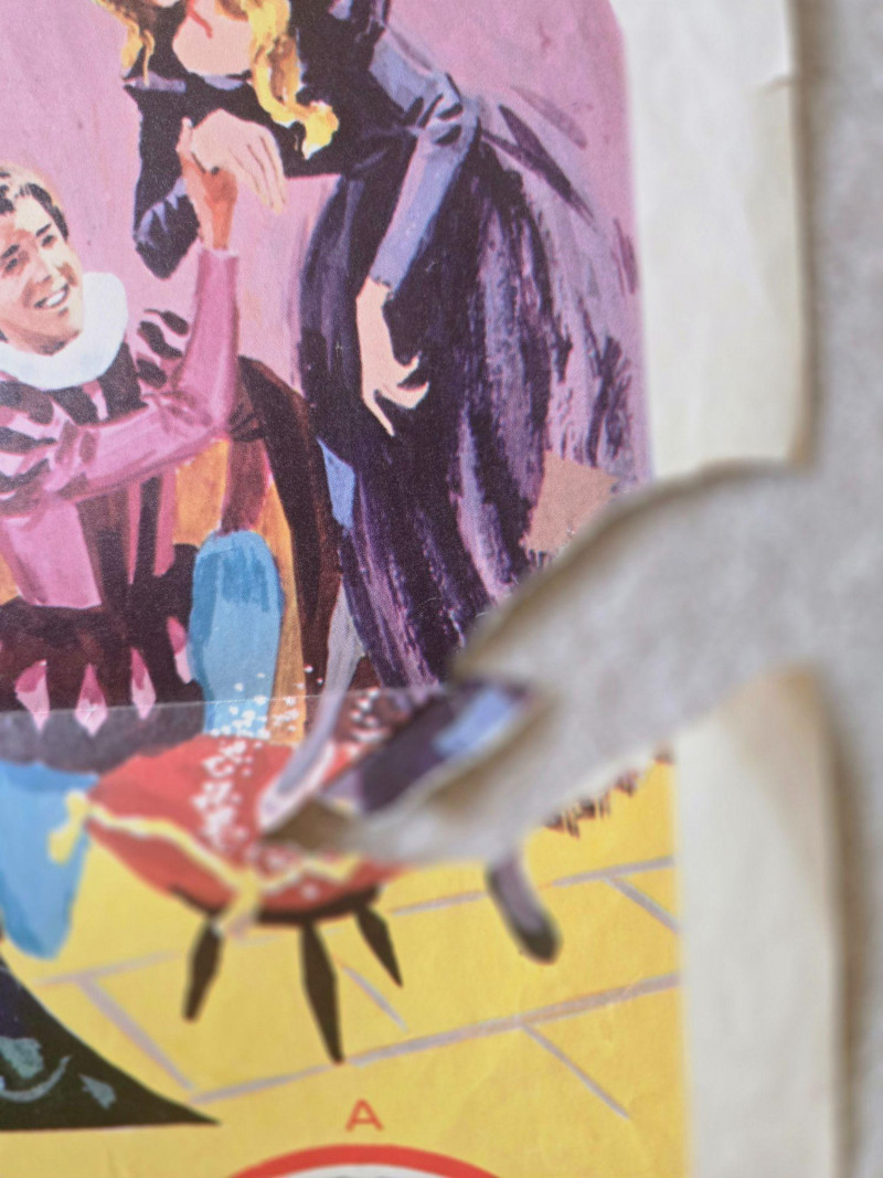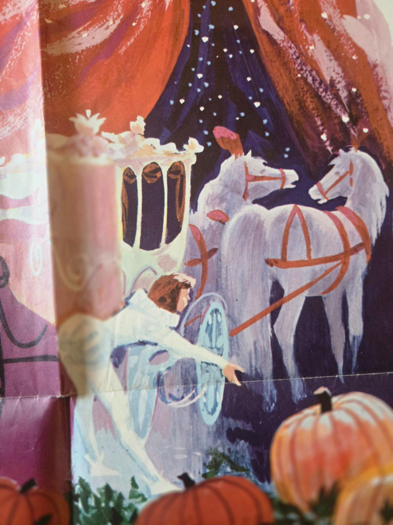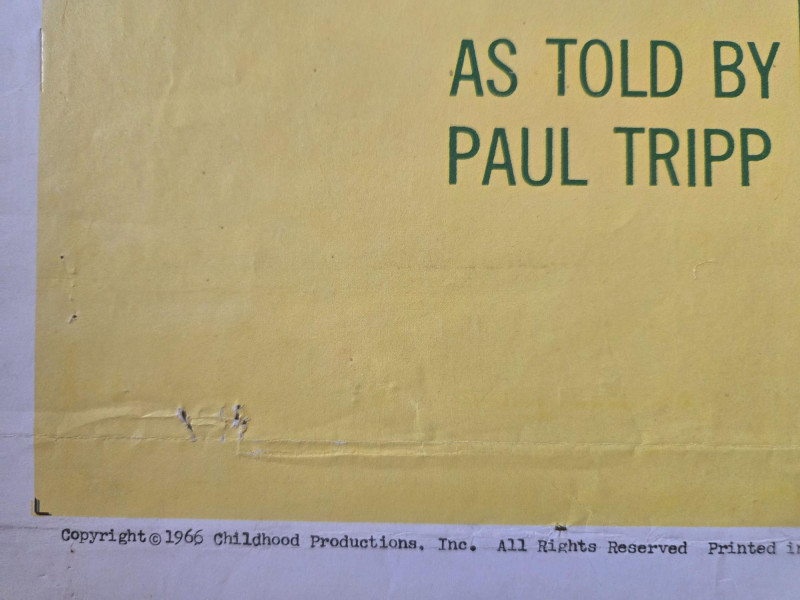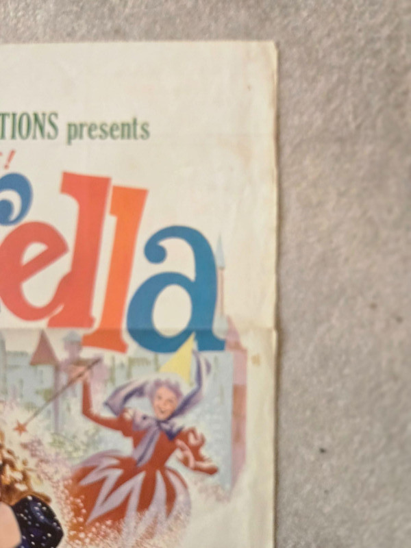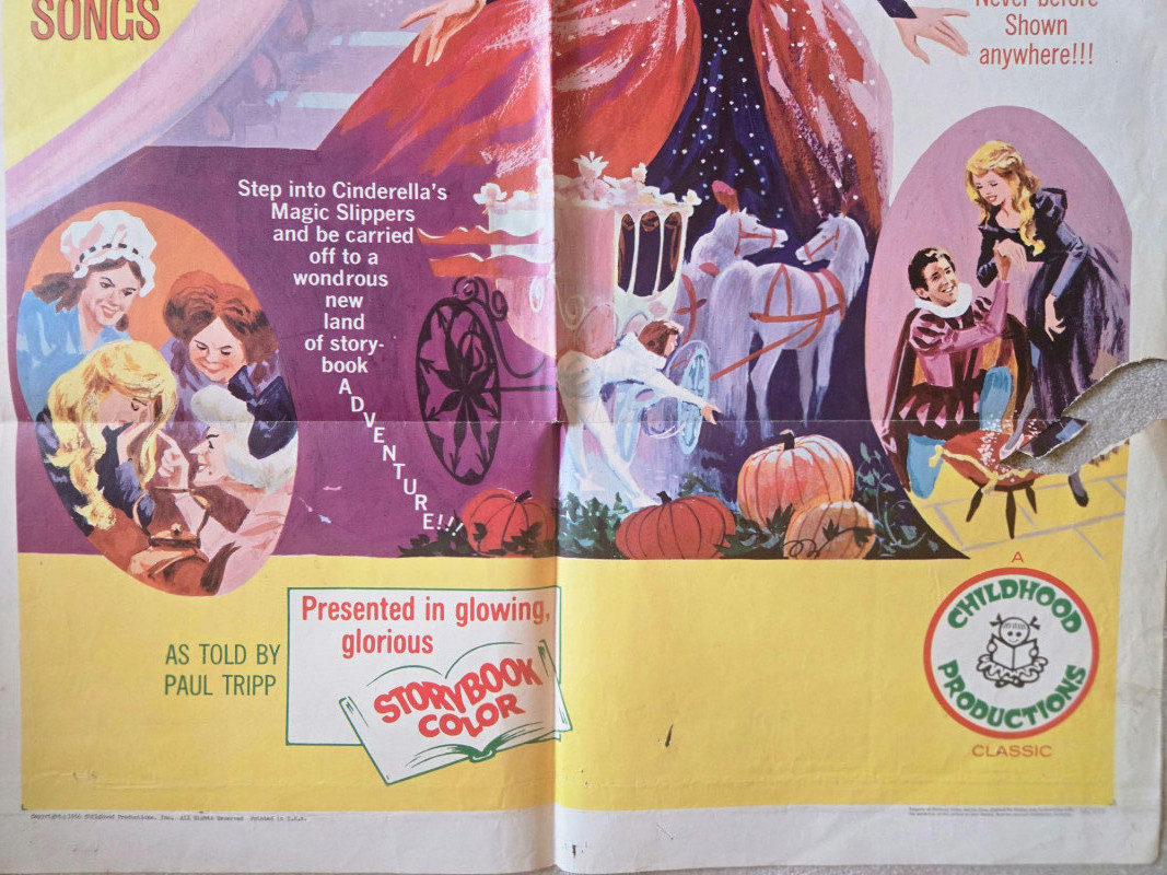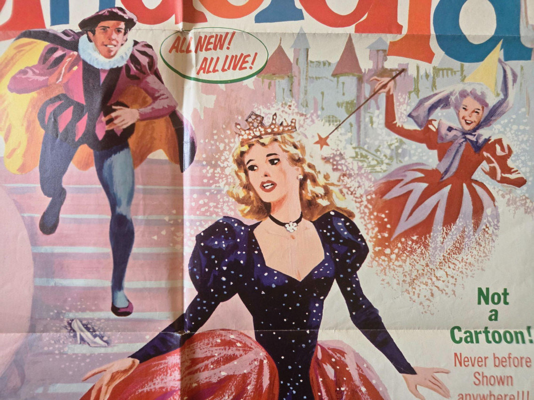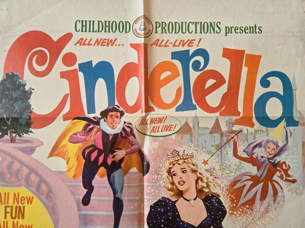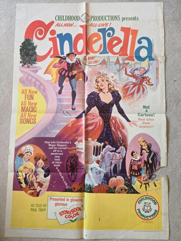 A charming, storybook‑bright vintage‑style movie poster for “Cinderella,” presented by Childhood Productions as an all‑live fairy‑tale musical. This decorative reprint captures the magic, sparkle, and theatrical whimsy of a beloved classic brought to life on stage. The poster bursts with colorful, enchanting artwork: Cinderella in her shimmering gown, the Fairy Godmother casting swirling magic, and the iconic pumpkin carriage ready to whisk her away. The layout is lively and inviting, filled with playful illustrations that highlight the production’s promise of “All New FUN, All New MAGIC, All New SONGS.” Bold text emphasizes that this is a live‑action performance—“Not a Cartoon!”—adding to its nostalgic children’s‑matinee appeal. The overall design radiates warmth, fantasy, and classic storybook charm. Presented by Childhood Productions / Classic “All New… All Live!” Story told by Paul Tripp Presented in glowing, glorious Storybook Color Promotional artwork for a live theatrical fairy‑tale production Visible creases, please see photos Unframed“Cinderella” Movie Poster