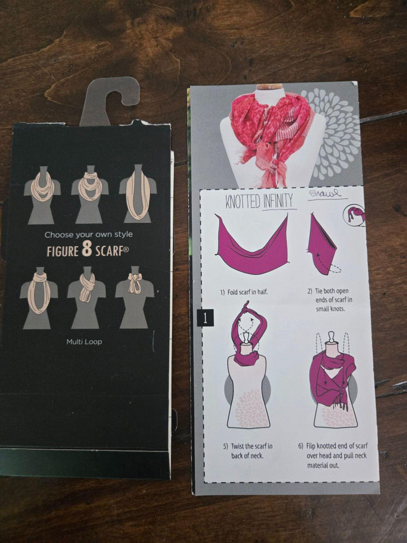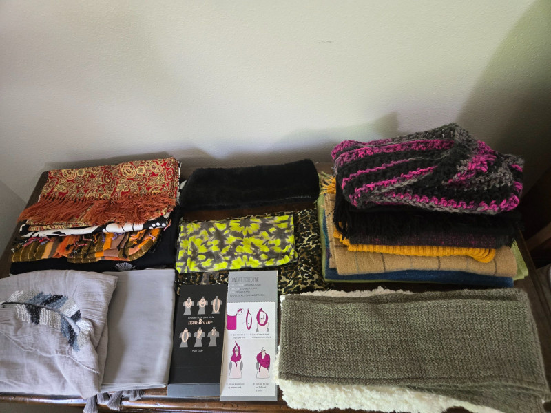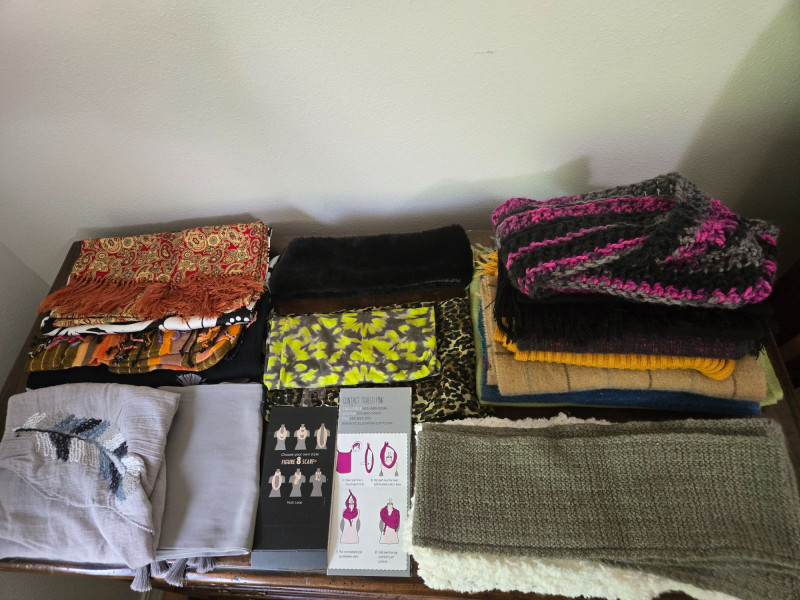 A stylish and varied assortment of women’s scarves, including lightweight fashion scarves, cozy knits, patterned wraps, and versatile everyday pieces. The collection features a mix of florals, animal prints, solids, and textured fabrics—offering options for all seasons and outfits. Included in the lot are two instructional cards: Figure 8 Scarf Guide — Six illustrated ways to wear a twist‑loop scarf Convert Twist Pin Guide — Step‑by‑step instructions for styling with a twist pin These add a fun, practical touch for anyone who enjoys experimenting with scarf styling. From the provided image, the scarves appear clean, neatly folded, and well‑kept. Expect normal light wear consistent with pre‑owned textiles.Collection of Women’s Scarves