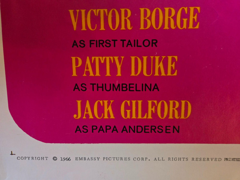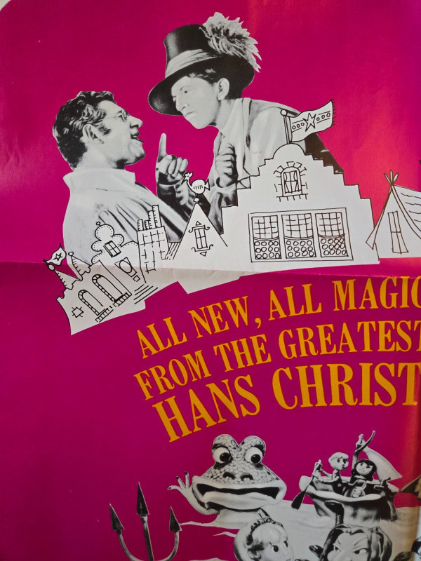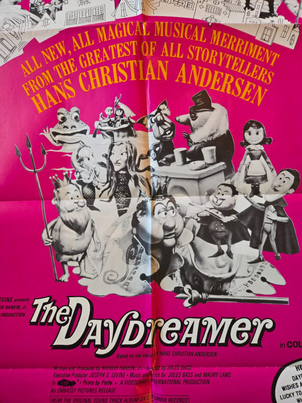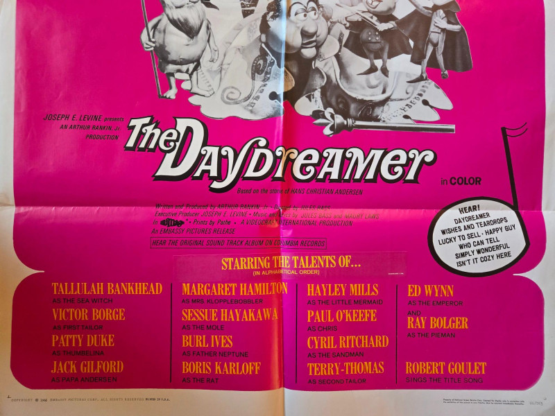 A vibrant, whimsical vintage‑style movie poster for “The Daydreamer” (1966), the musical fantasy inspired by the stories of Hans Christian Andersen. This decorative reprint captures the film’s playful blend of live‑action and stop‑motion animation, brought to life by the creative team behind Rankin/Bass classics. The poster features a bold magenta background filled with a lively mix of illustrated and photographic elements. Black‑and‑white film stills line the top, while colorful fantasy characters—kings, devils, animals, and magical figures—dance across the center artwork. The design radiates 1960s charm, emphasizing the film’s imaginative storytelling and musical energy. A playful text bubble adds a groovy, era‑appropriate flair, underscoring the film’s “magical musical merriment.” Presented by Joseph E. Levine An Arthur Rankin & Jules Bass Production Starring: Tallulah Bankhead Victor Borge Patty Duke Jack Gilford Margaret Hamilton Sessue Hayakawa (as Father Neptune) Burl Ives Boris Karloff (as the Rat) Hayley Mills Paul O’Keeffe (as Hans) Cyril Ritchard Terry‑Thomas Ed Wynn Ray Bolger Robert Goulet performs the title song In Color Visible creases, please see photos Unframed “The Daydreamer” Movie Poster