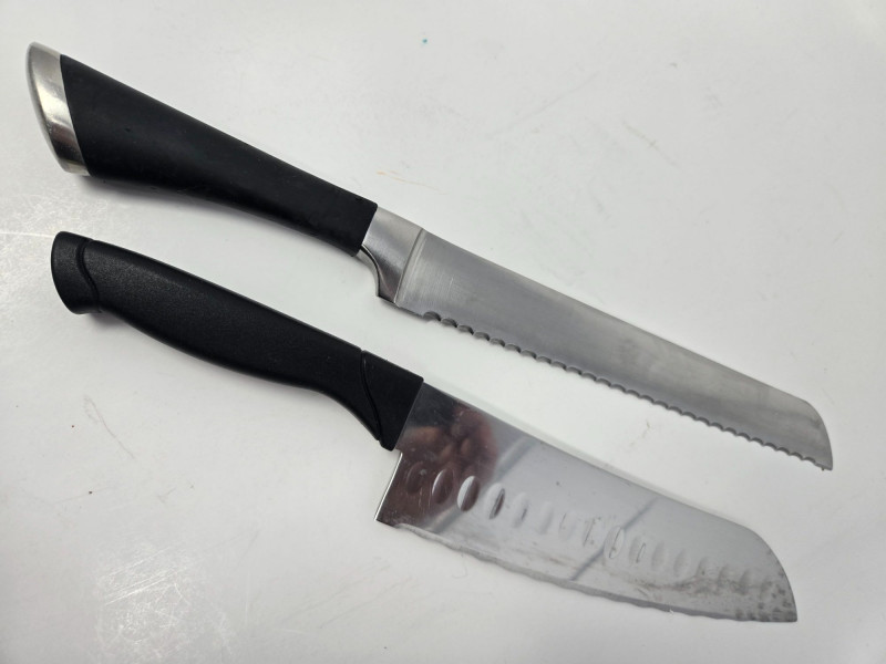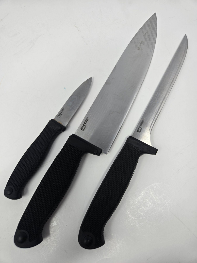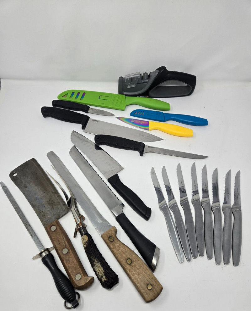 Rugged, utility‑grade blades suitable for tougher cutting tasks, outdoor use, or workshop applications. Additional Knives & Tools Large meat cleaver with wooden handle Chef’s knife and serrated bread knife Long slicing knife with decorative handle Utility and paring knives in mixed handle styles Sharpening rod and handheld knife sharpener Carving fork with wooden handle A comprehensive bundle offering both everyday kitchen essentials and specialty blades. Most of the knives are clean and in good functional condition. A few of the older ones are patinaed. As with all pre‑owned blades, expect normal wear from sharpening and use.8 Henckel Steak Knives, 3× Tom ODACHI Set, 3 Cold Steel & More