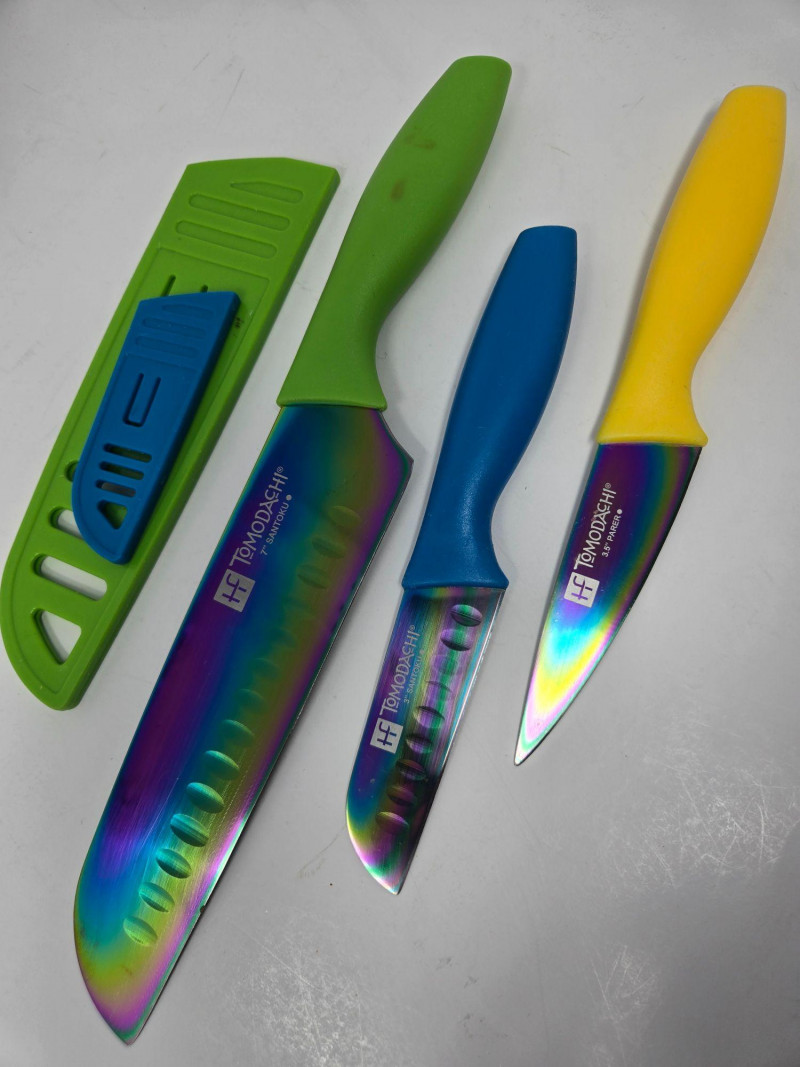Distinctive modern‑style prep knives, including the colorful‑bladed piece and two sheathed green‑handled knives. 3 Cold Steel Knives
