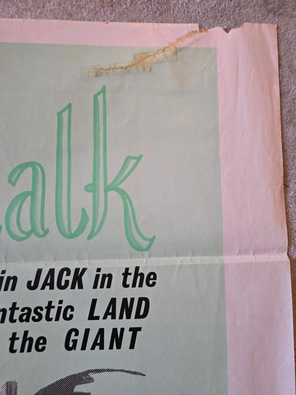 A colorful, whimsical vintage‑style movie poster for “Jack & the Beanstalk,” inspired by the classic fairy tale of magic beans, towering giants, and daring adventure. This decorative reprint captures the timeless charm of children’s fantasy storytelling and the bold theatrical flair of mid‑century family entertainment. Typical poster artwork for Jack & the Beanstalk features bright, storybook‑style illustrations—Jack climbing the enormous beanstalk, the looming giant above the clouds, and lively scenes from the enchanted world he discovers. Expect vivid colors, dynamic poses, and playful typography that evoke the excitement and wonder of the beloved tale. The design reflects the film’s blend of fantasy, humor, and classic fairy‑tale adventure. (Exact credits vary by edition, but generally include:) Based on the classic fairy tale Family / fantasy genre Promotional artwork for theatrical matinee or children’s cinema release Visible tears & creases, please see photos Unframed “Jack & the Beanstalk” Movie Poster