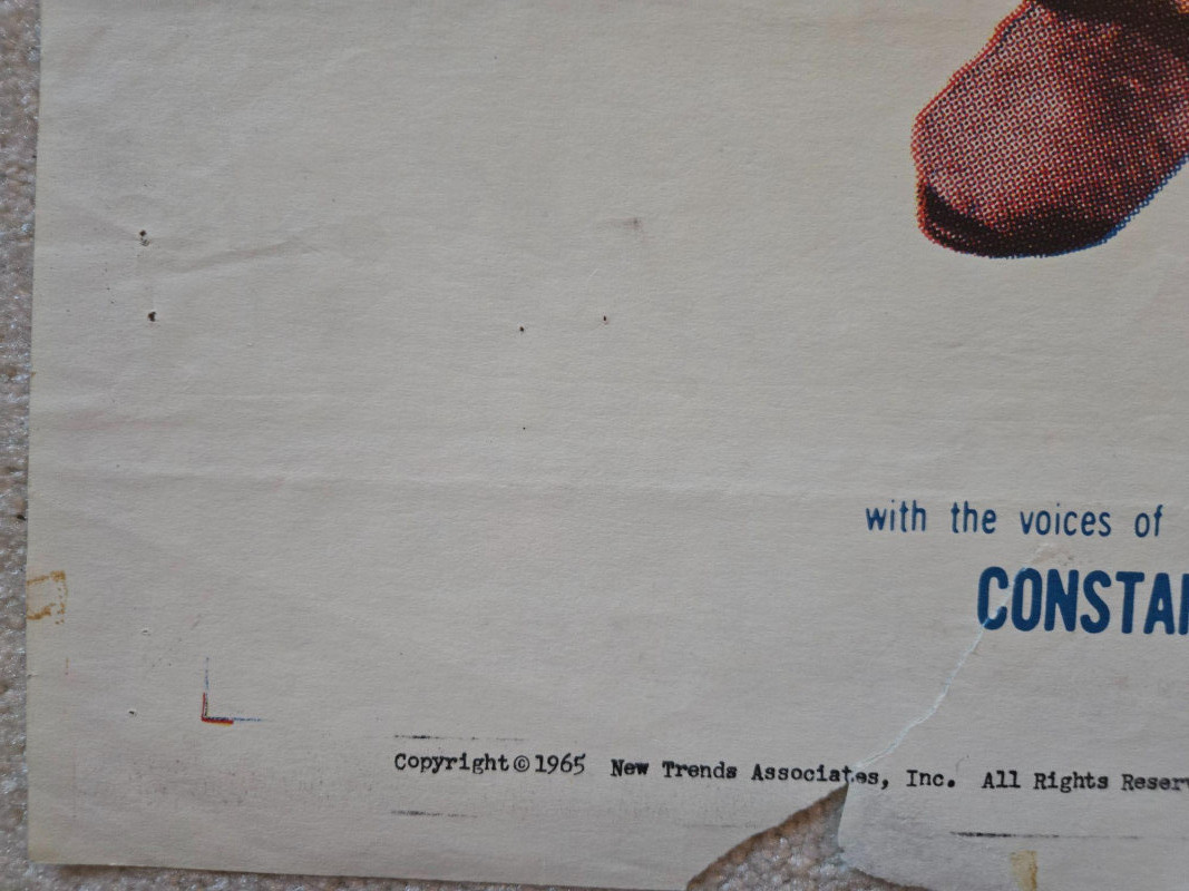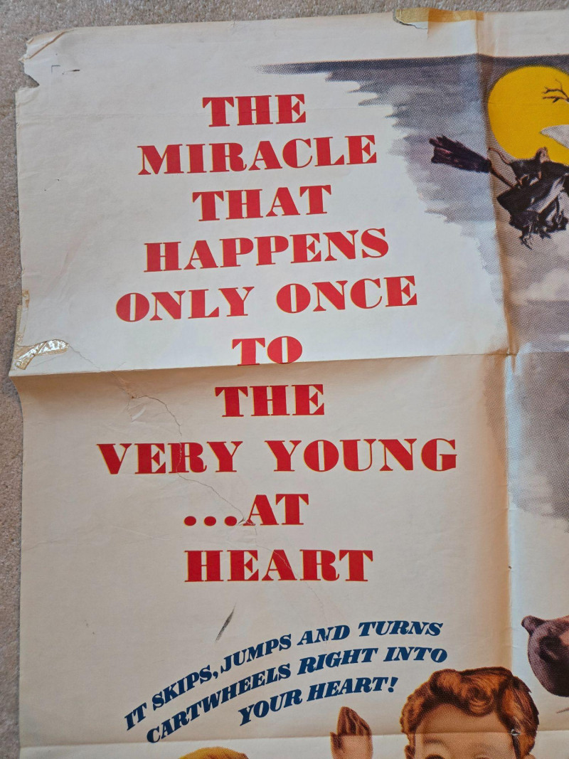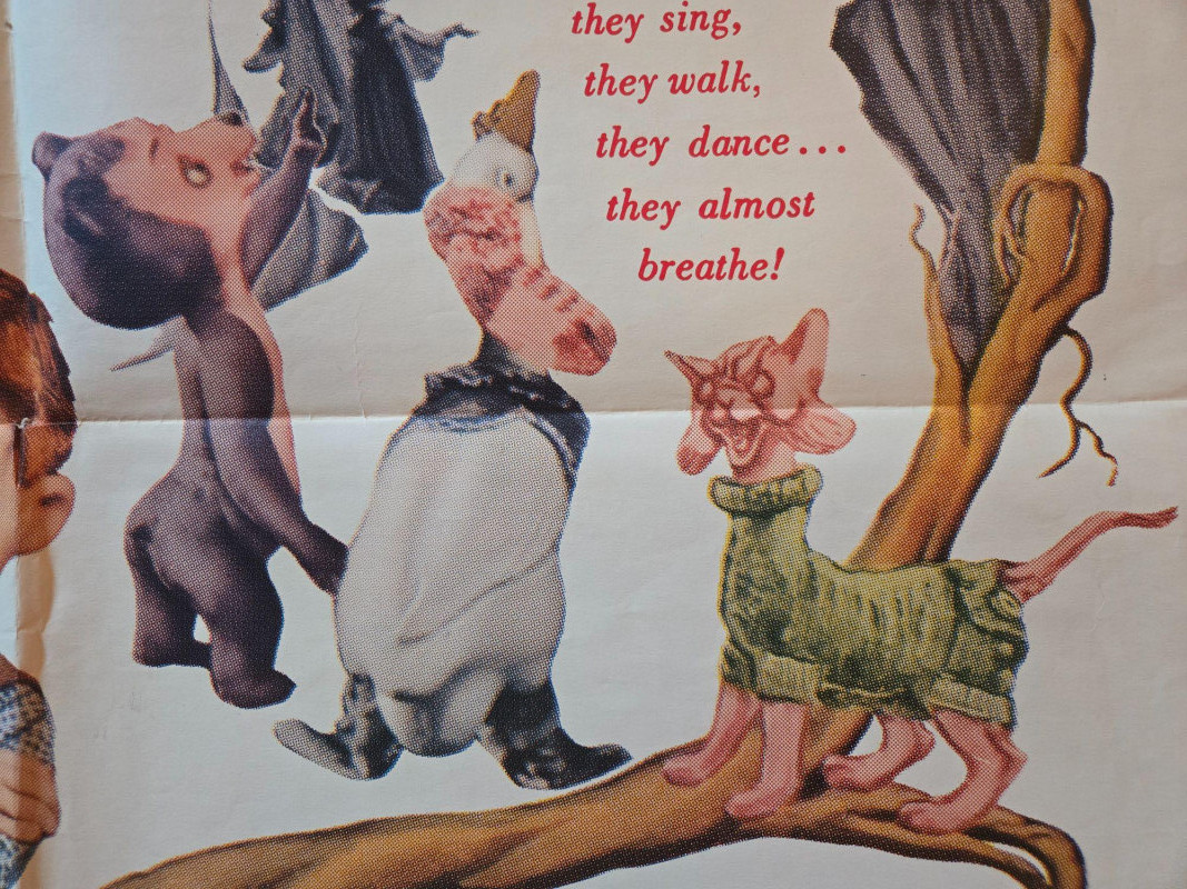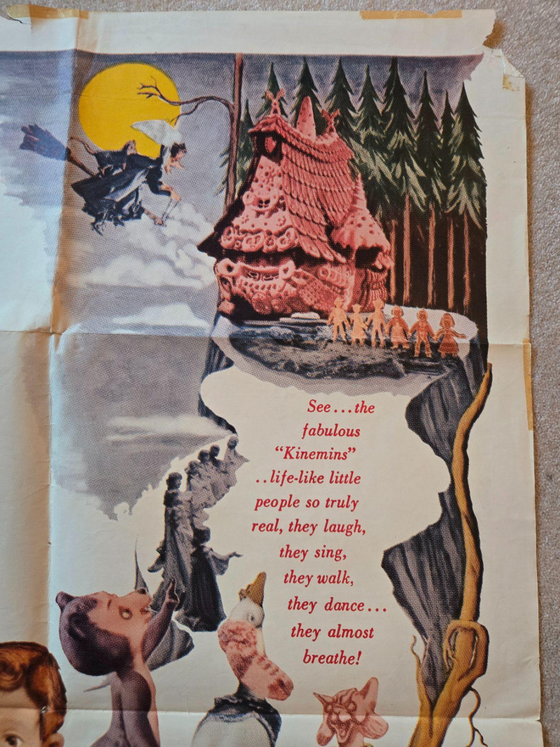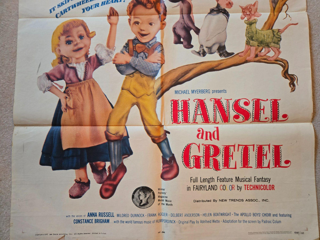 Fragile A magical, fairy‑tale‑themed vintage‑style movie poster for “Hansel & Gretel,” presented as a full‑length musical fantasy. This decorative reprint captures the charm of mid‑century children’s cinema, blending whimsical puppet artistry with classic storybook imagery. The poster features vibrant, theatrical artwork showcasing Hansel and Gretel in their puppet‑like “Kinemins” form—lifelike figures that walk, dance, and sing. Behind them, a dramatic moonlit sky frames the witch soaring on her broomstick, while the gingerbread house glows invitingly (and ominously) in the forest. Smaller puppet characters populate the scene, adding to the film’s magical, handcrafted atmosphere. Promotional text highlights the film’s heartwarming tone—“It skips, jumps and turns cartwheels right into your heart!”—and emphasizes its innovative puppet animation. Presented by Michael Myerberg “Hansel and Gretel” — Full‑length feature musical fantasy Colored by Technicolor Distributed by New Trends Associates, Inc. Voices: Anna Russell Mildred Dunnock Frank Rogger Delbert Anderson Helen Boatwright The Apollo Boys Choir Features the world‑famous music of Humperdinck Original play by Adelheid Wette Screen adaptation by Padraic Colum Poster is marked “Fragile” on the listing Visible tears & creases UnframedVintage “Hansel & Gretel” Movie Poster