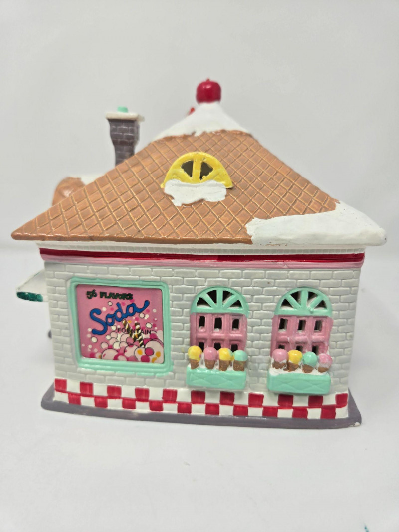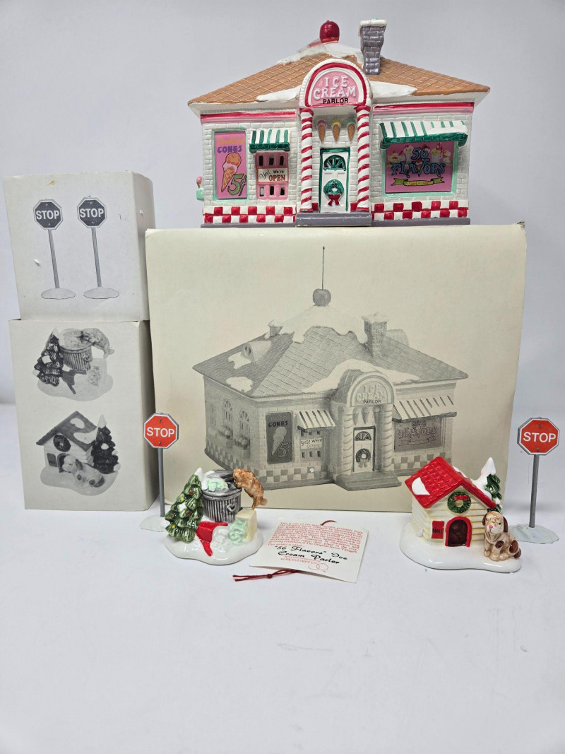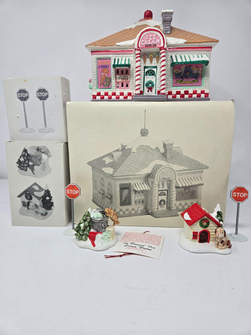 A cheerful and nostalgic Dept 56 Snow Village grouping centered around the beloved “56 Flavors of Ice‑Cream” shop. This set brings bright color, whimsy, and classic small‑town charm to any holiday village display. Included in this lot: “56 Flavors of Ice‑Cream” Building