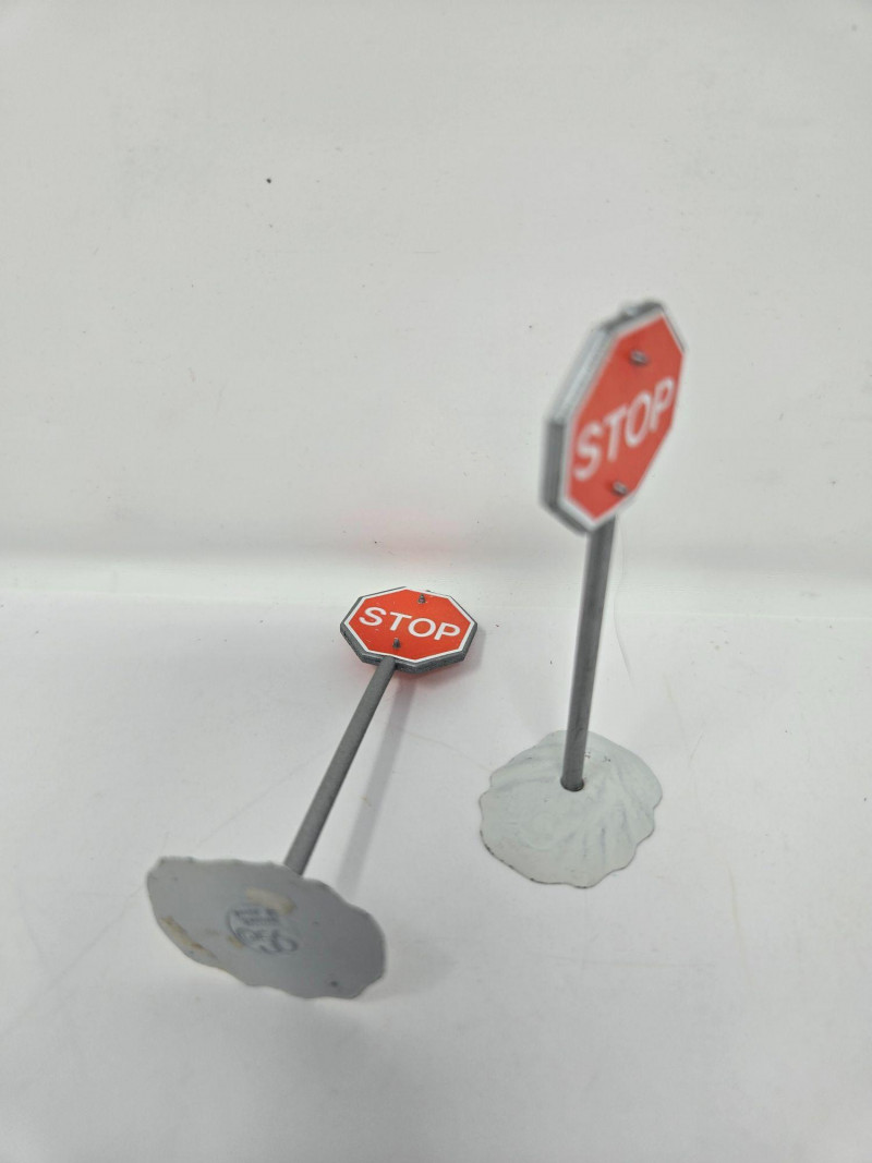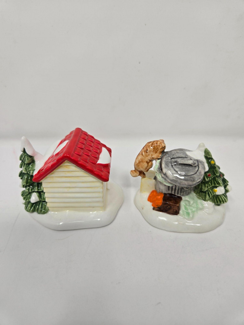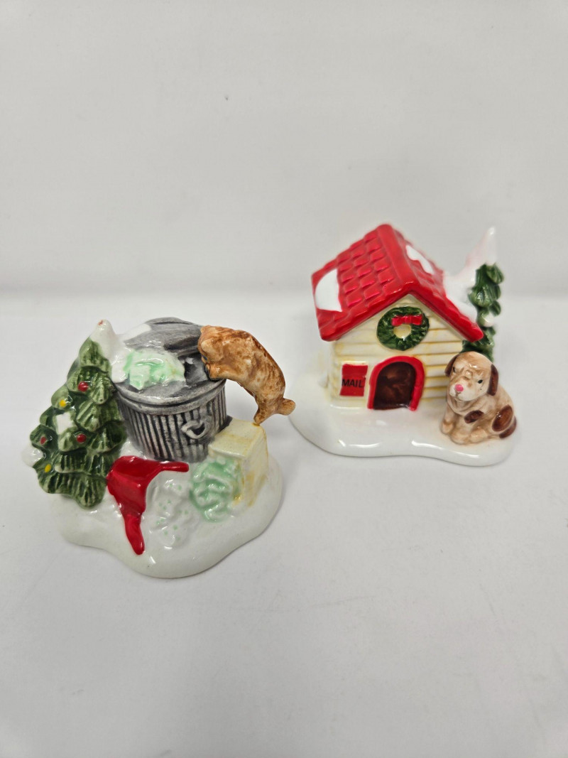 A playful vignette featuring a dog, a trash can, and a small Christmas tree—perfect for adding humor and life to a village street corner. Two Stop Signs