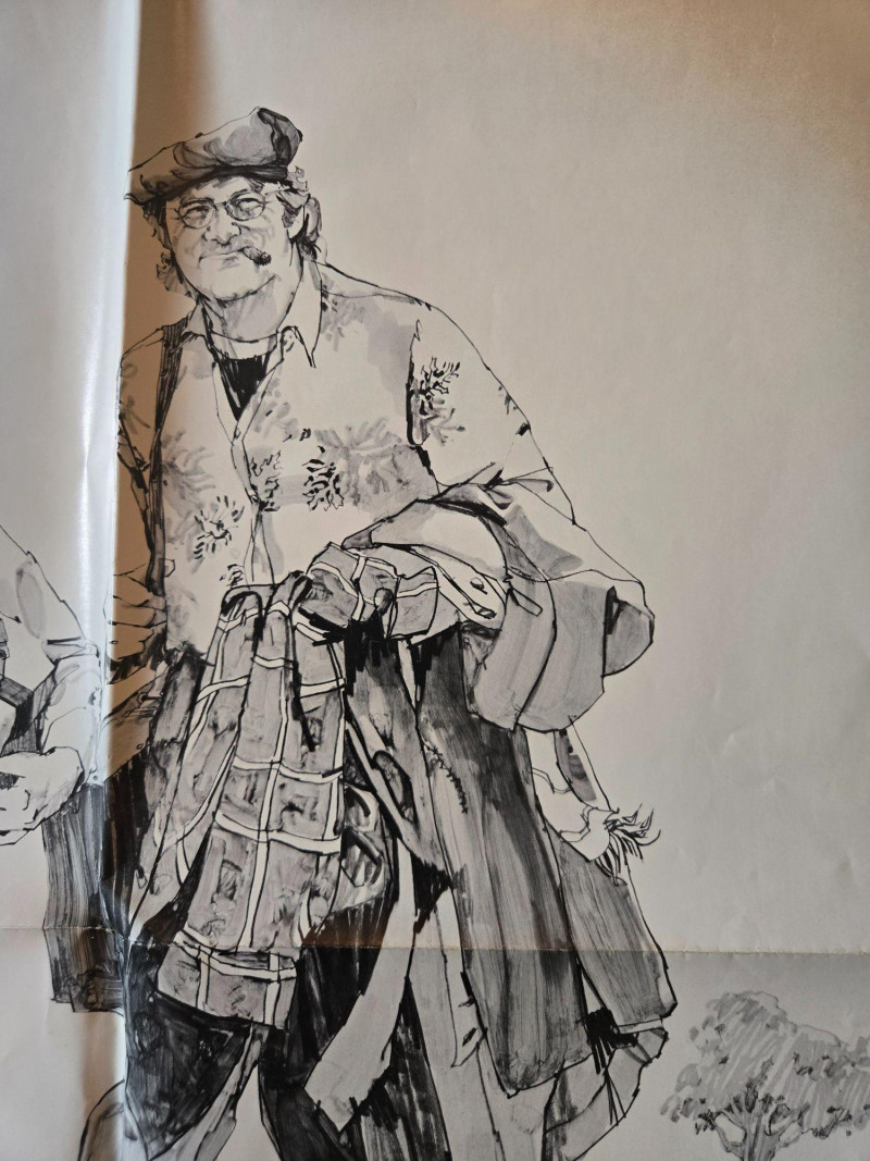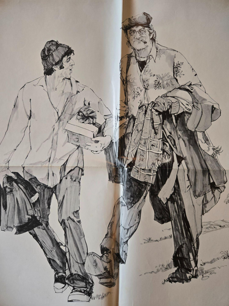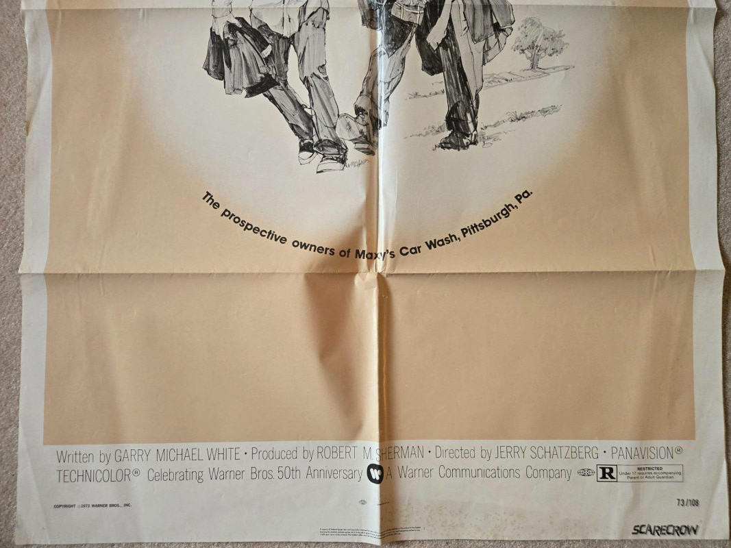 A striking, minimalist vintage‑style movie poster for “Scarecrow” (1973), the acclaimed road‑drama starring Al Pacino and Gene Hackman. This decorative reprint captures the film’s gritty, character‑driven spirit with clean lines, understated color, and an illustration that reflects the story’s wandering, hard‑won friendship. The poster features a simple, sketch‑style drawing of the two drifters walking side‑by‑side—an image that perfectly conveys the film’s themes of companionship, hardship, and the search for purpose across America. Their names appear boldly at the top, separated by a small scarecrow icon, with the title centered beneath in vivid red. The beige background and uncluttered layout give the piece an art‑house sensibility that stands out among 1970s cinema posters. Starring Gene Hackman & Al Pacino Written by Garry Michael White Produced by Robert M. Sherman Directed by Jerry Schatzberg Presented in Panavision & Technicolor Rated R Celebrating Warner Bros.’ 50th Anniversary Visible creases, please see photos UnframedVintage #2 “Scarecrow” w/ Al Pacino & Gene Hackman Movie Poster