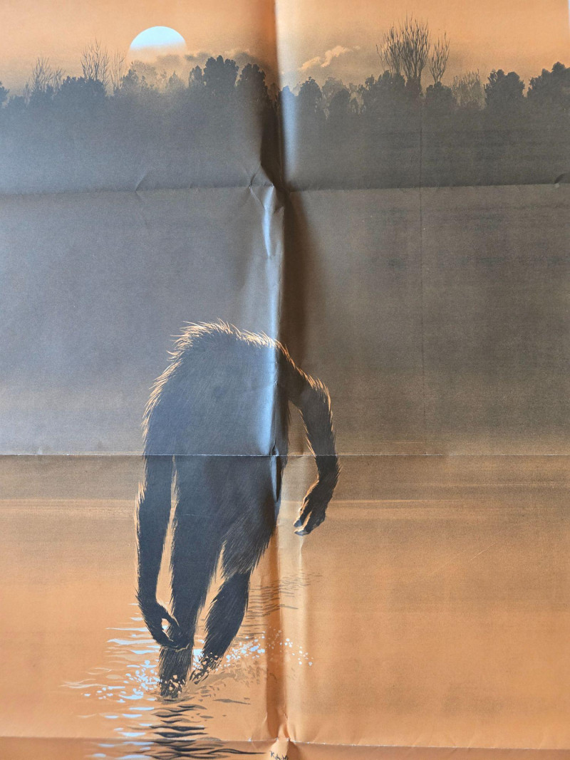 A haunting, atmospheric vintage‑style movie poster for “The Legend of Boggy Creek,” the cult docu‑horror classic inspired by real sightings of the Fouke Monster in rural Arkansas. This decorative reprint captures the film’s eerie, folkloric tone with bold sunset imagery and a looming creature silhouette. The poster features a dramatic backlit scene of the creature wading through a swamp at dusk, its massive form framed by a fiery orange sky and dark treeline. The composition leans into the film’s “true story” mystique, blending natural beauty with unsettling mystery. The minimalist layout and earthy palette give the piece a moody, cinematic presence—perfect for fans of cryptid lore, regional horror, and 1970s independent filmmaking. A Howco International Pictures release A Pierce–Ledwell Production Produced & directed by Charles Pierce Written by Earl E. Smith Music by Jamie Mendoza‑Nava Executive producers: L.W. Ledwell & Charles Pierce Color by Technicolor Filmed in Techniscope Visible creases, please see photos UnframedVintage/#2 “The Legend of Boggy Creek” Movie Poster