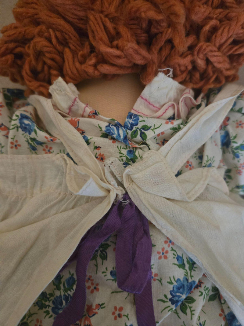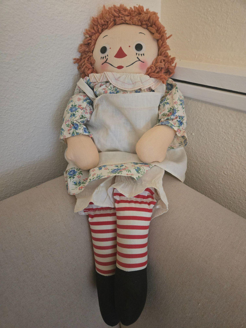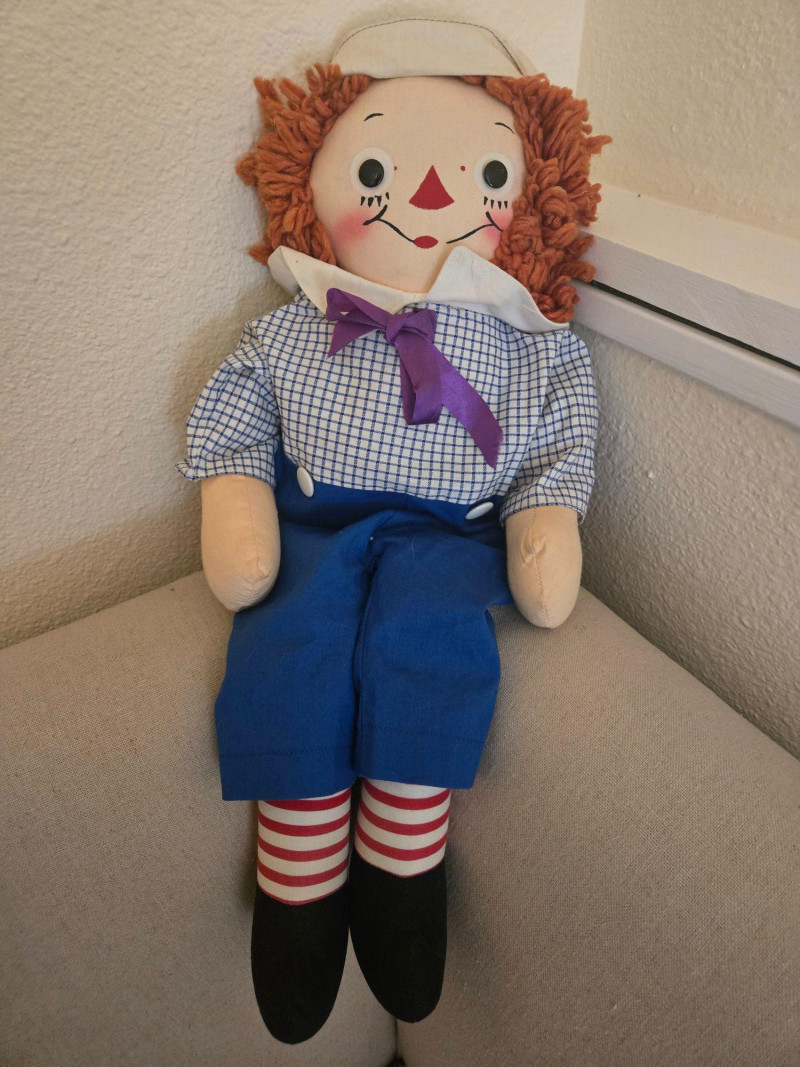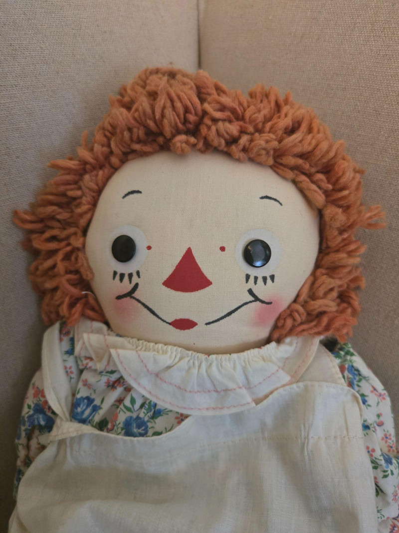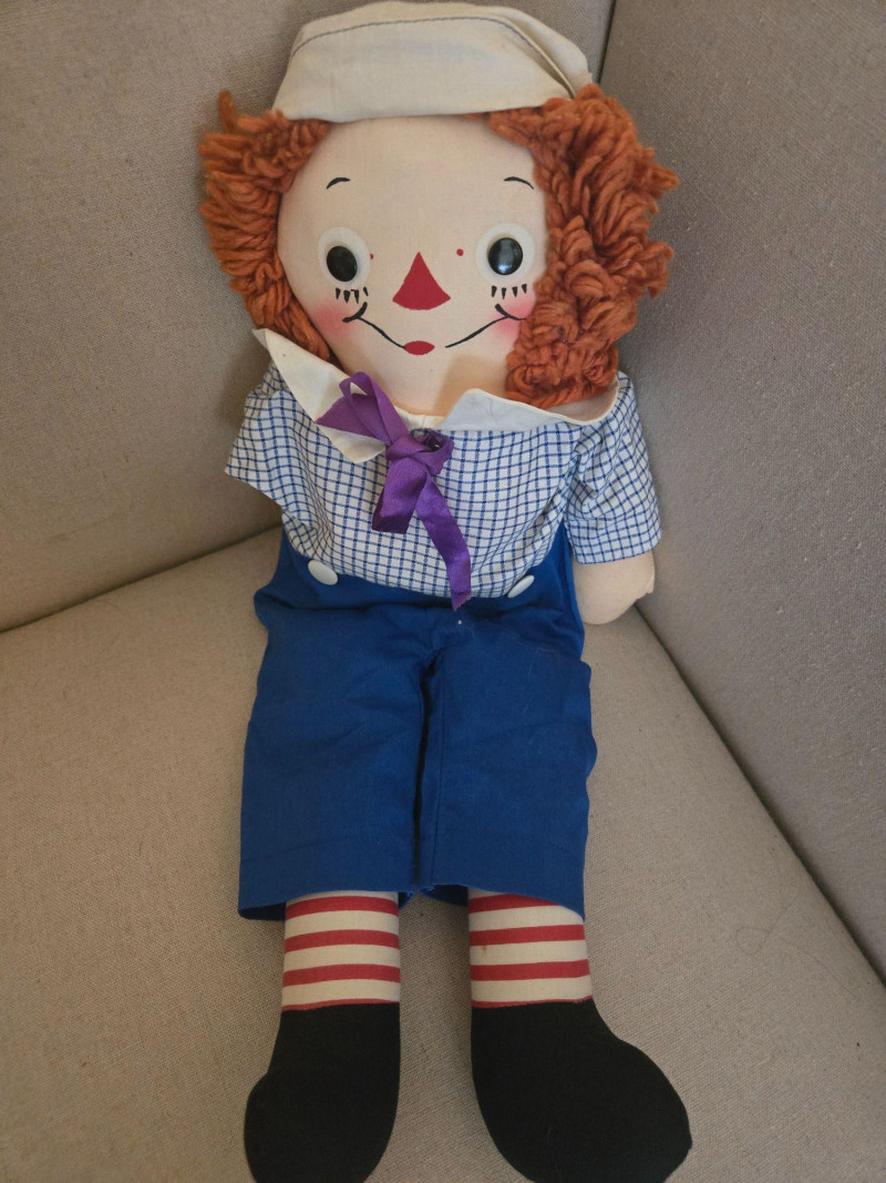 A charming pair of classic Raggedy Ann & Andy dolls inspired by the beloved storybook characters created by Johnny Gruelle. These soft cloth dolls feature the traditional styling that has made the pair American favorites for generations. Raggedy Andy wears his signature sailor-style cap, blue checkered shirt, bow tie, and blue trousers. Raggedy Ann appears in her floral dress with a crisp white apron. Both dolls display the familiar red yarn hair, triangle noses, embroidered smiles, and red-and-white striped legs that define the Gruelle aesthetic. Condition Notes