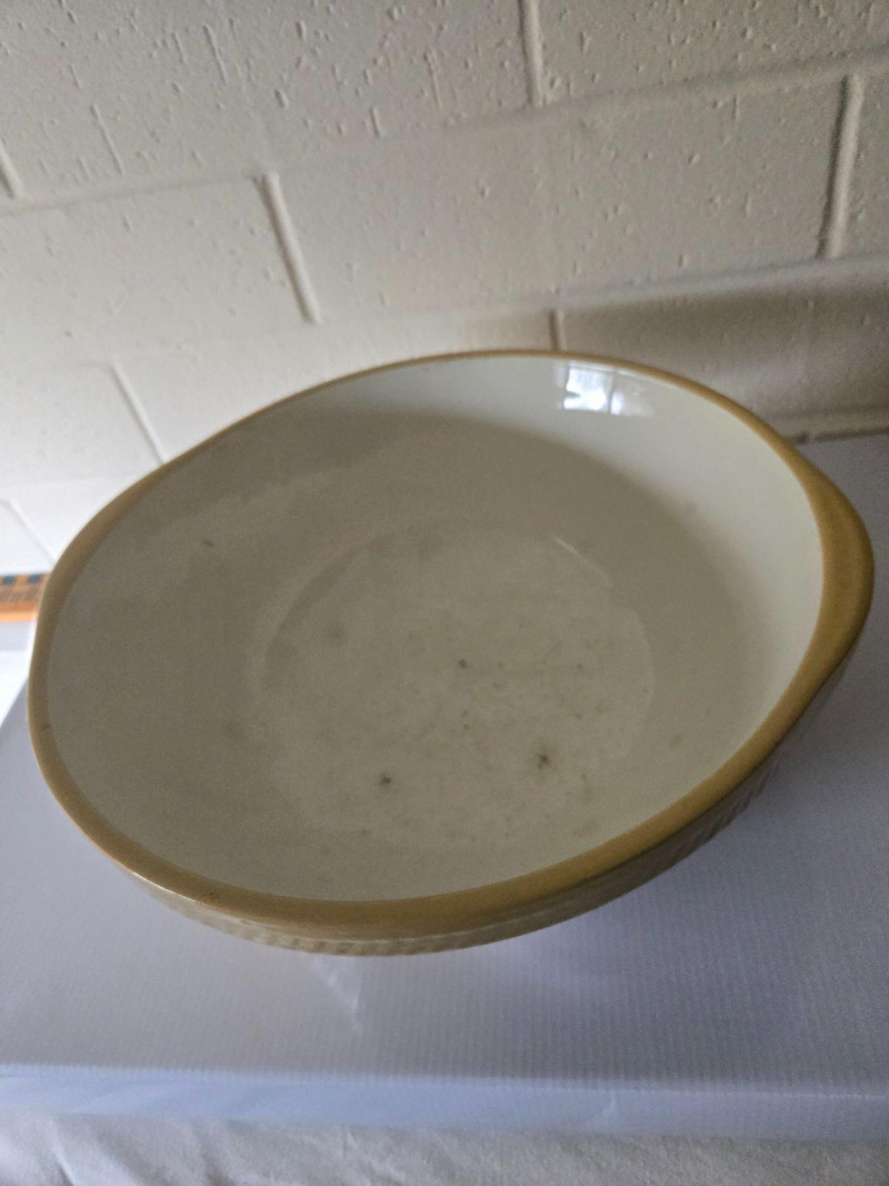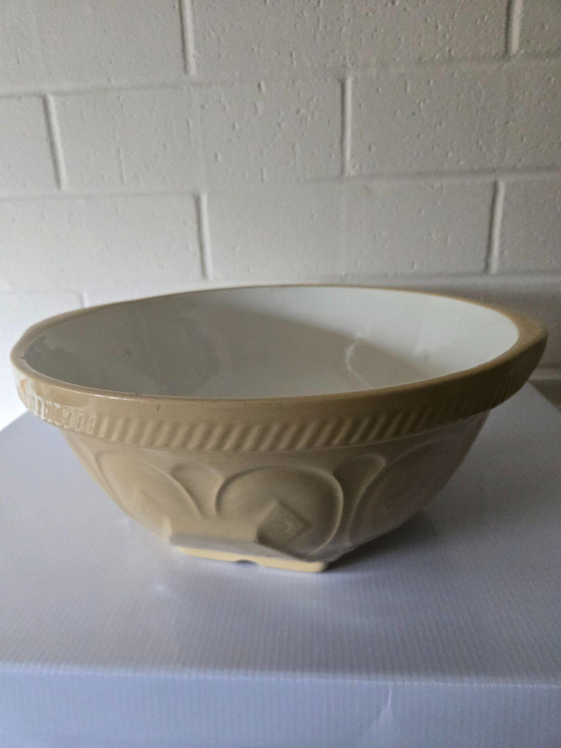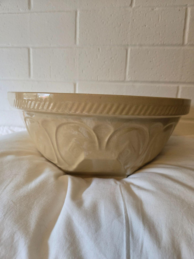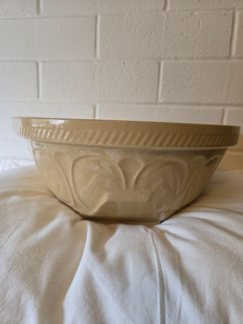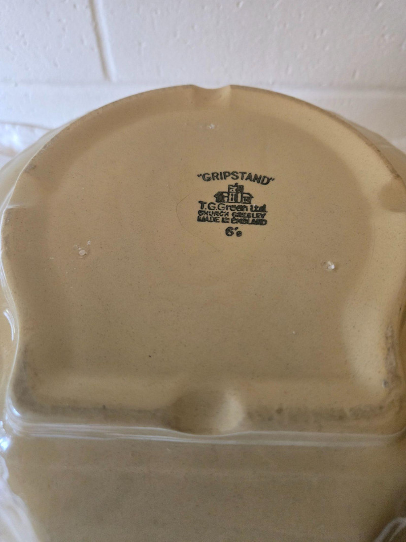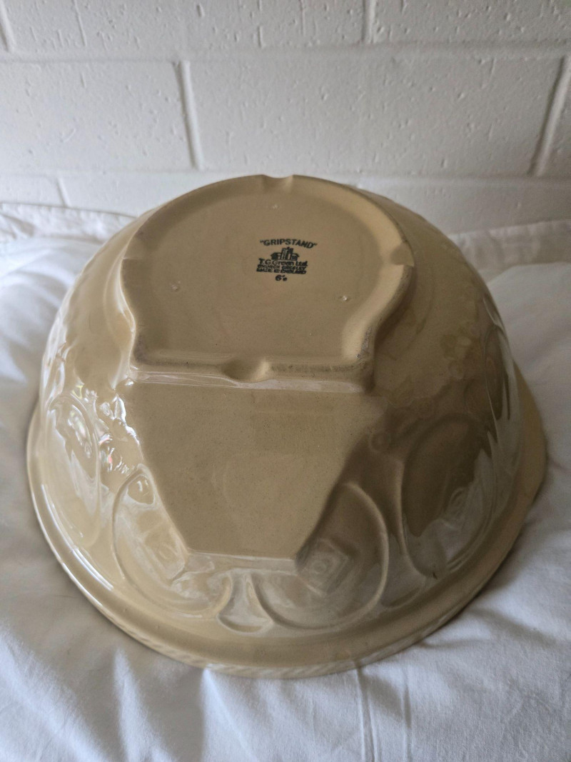 A classic vintage “Gripstand” mixing bowl produced by T.G. Green Ltd., England, known for their durable stoneware kitchenware and iconic utilitarian designs. The Gripstand line is especially recognizable for its angled base, allowing the bowl to rest securely during mixing—an innovation that made these bowls a staple in mid‑century British kitchens. This example features the traditional wide‑rim form and sturdy construction associated with T.G. Green’s practical yet collectible housewares. Its neutral glaze and timeless profile make it suitable for both functional use and display. Condition Notes