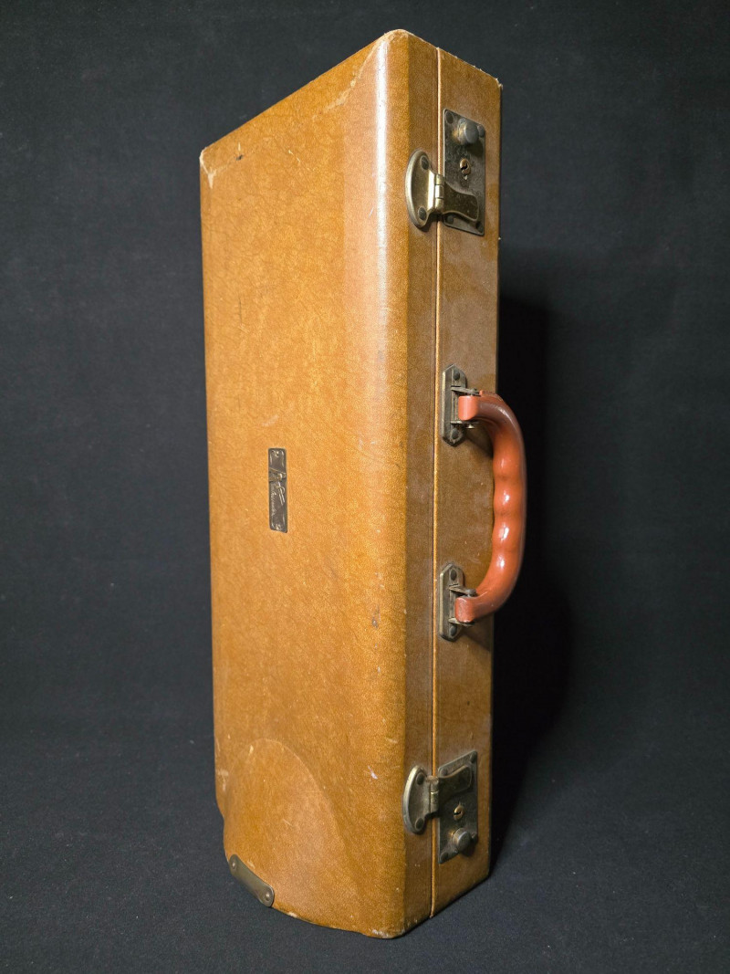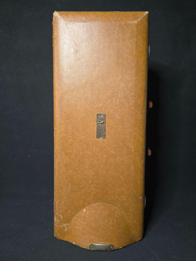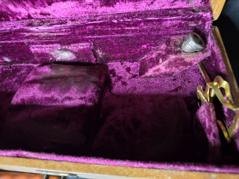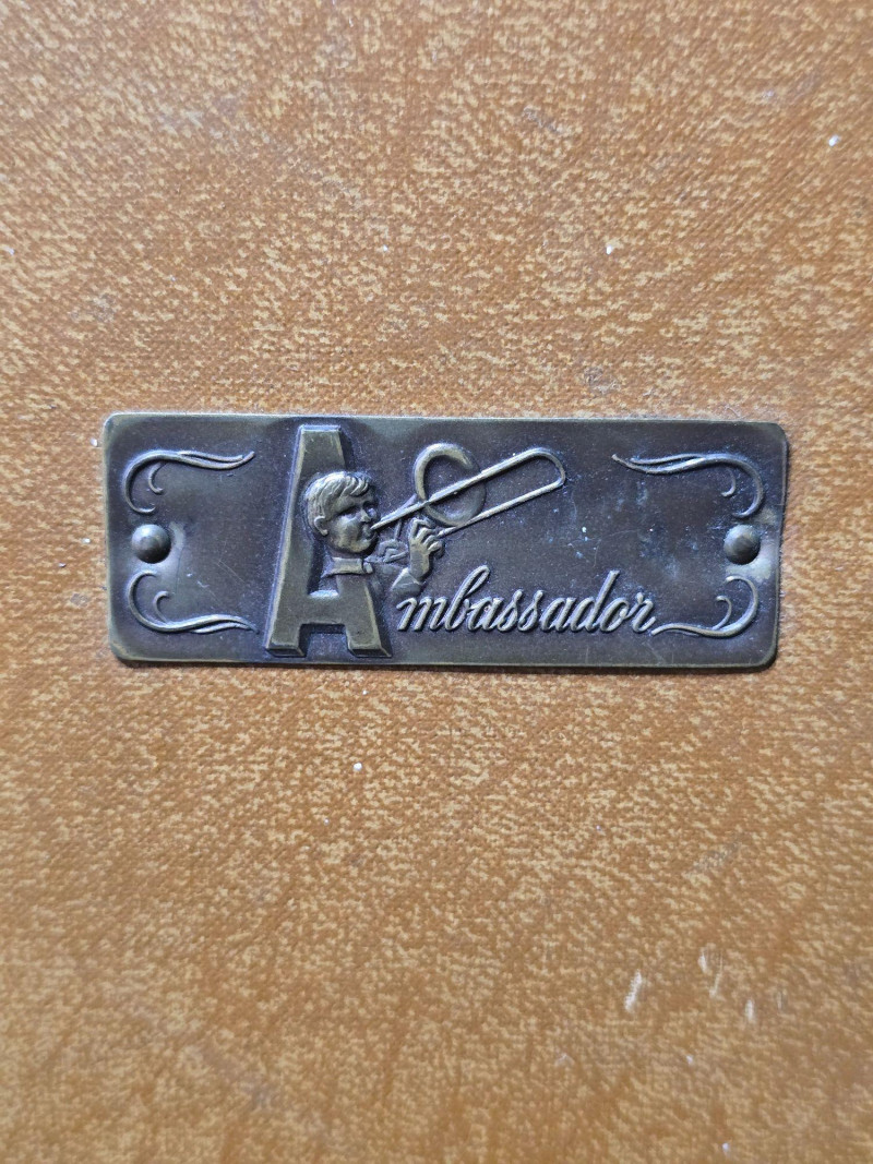 Vintage F.E. Olds & Son Ambassador trumpet, a durable and well‑regarded model known for its warm, centered tone and reliable construction. Features the original Ambassador bell engraving, three‑valve layout, and classic brass finish. The instrument shows age‑appropriate patina, finish wear, and surface marks from long-term use and storage. Valves and slides move but may benefit from cleaning or service. Includes its period hard case with purple velvet interior and exterior “Ambassador” badge. Case shows wear, scuffs, and age to hardware but remains structurally sound. Notes: Untested for play. Sold as found. Patina, wear, and tarnish present throughout. Case interior fabric shows age and use. A solid candidate for restoration, practice, or collection.