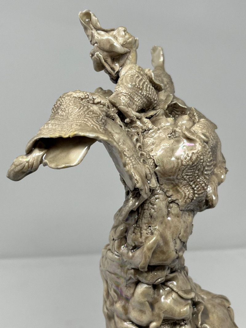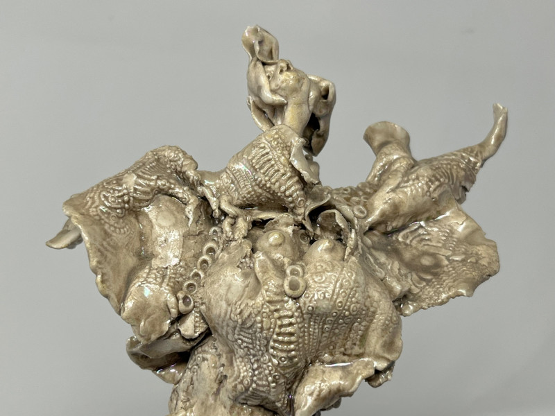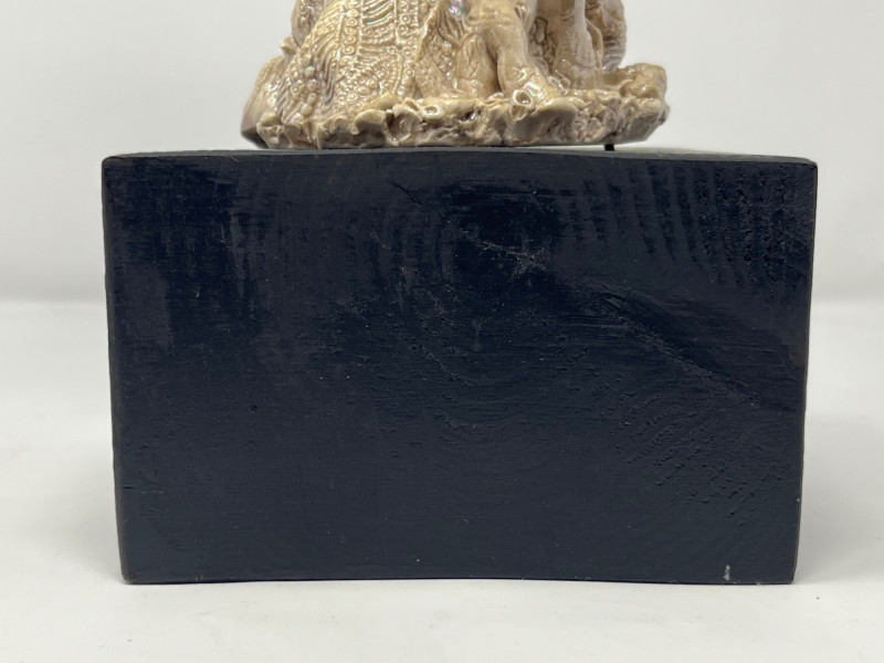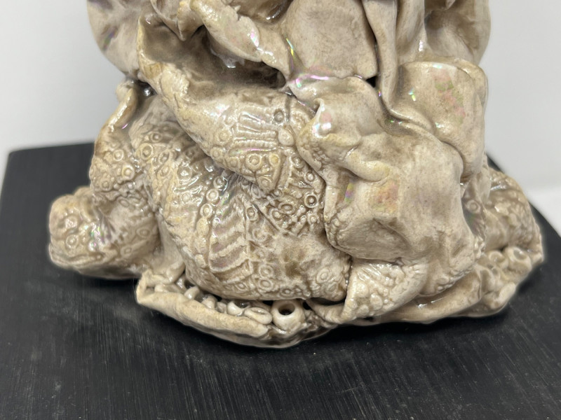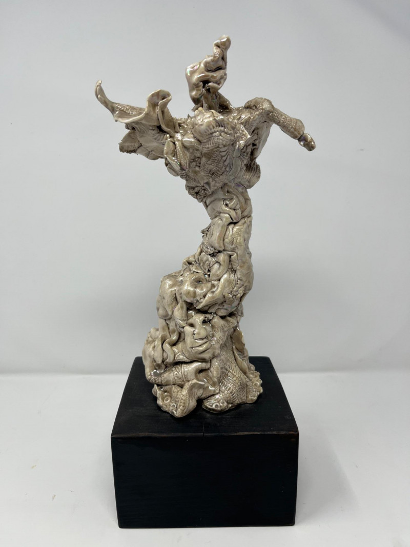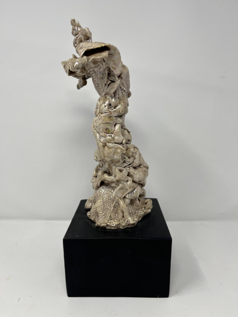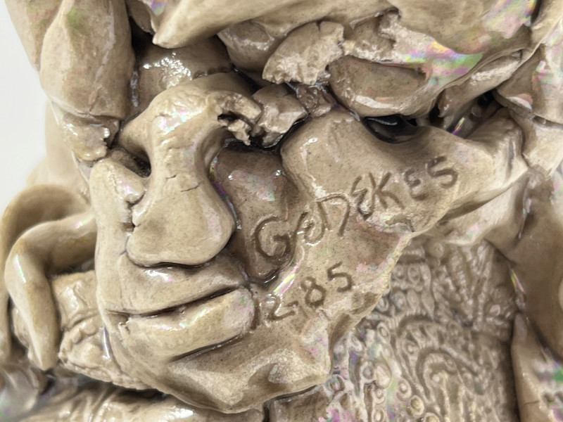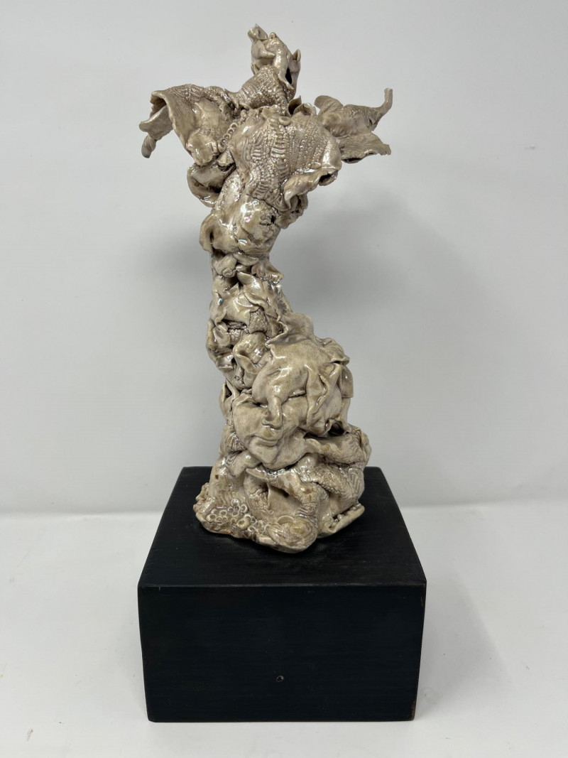 A striking ceramic sculpture by Pacific Northwest artist Gerald Gedekes, signed Gedekes and dated 12‑85. This expressive work showcases the textured, organic forms characteristic of Gedekes’ studio practice, with strong sculptural presence and dimensional detail throughout. The piece is mounted on its original base; a tiny crack in the base is photographed for accuracy but does not affect the stability or integrity of the sculpture. Artist Bio: