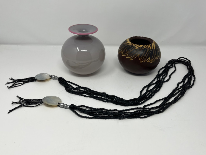 Lot # 23 - Hawaiian Carved Wooden Vase, Volcanic Ash Vase & Beaded Belt Trio