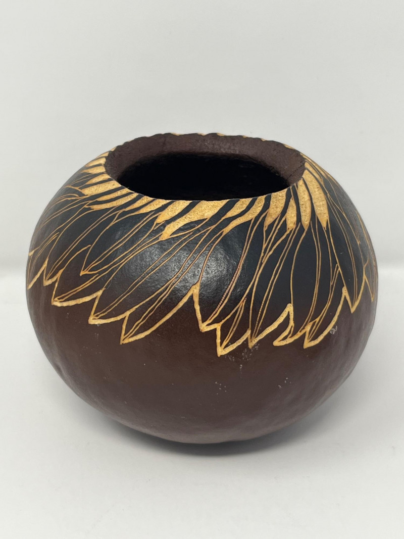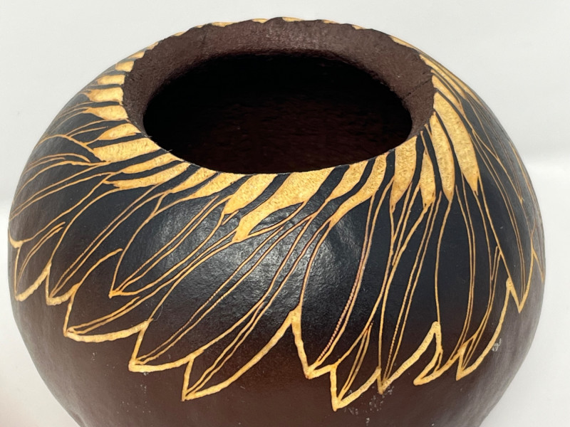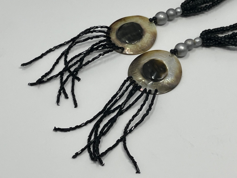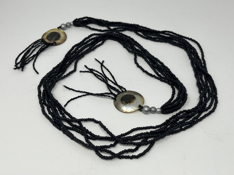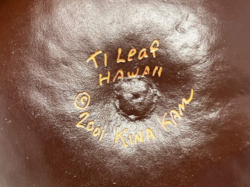 Group of three Hawaiian pieces including: Hand‑carved wooden vase with leaf motif, signed on the underside. Warm natural tone with carved relief detailing. Volcanic ash vase with matte textured surface and organic form. Bohemian‑style beaded belt featuring mother‑of‑pearl elements and bead tassels. Light surface wear consistent with age and handling. Dimensions: Wooden vase: approx. 3" x 4.5" Volcanic ash vase: approx. 5" x 4" Beaded belt: approx. 48" total length