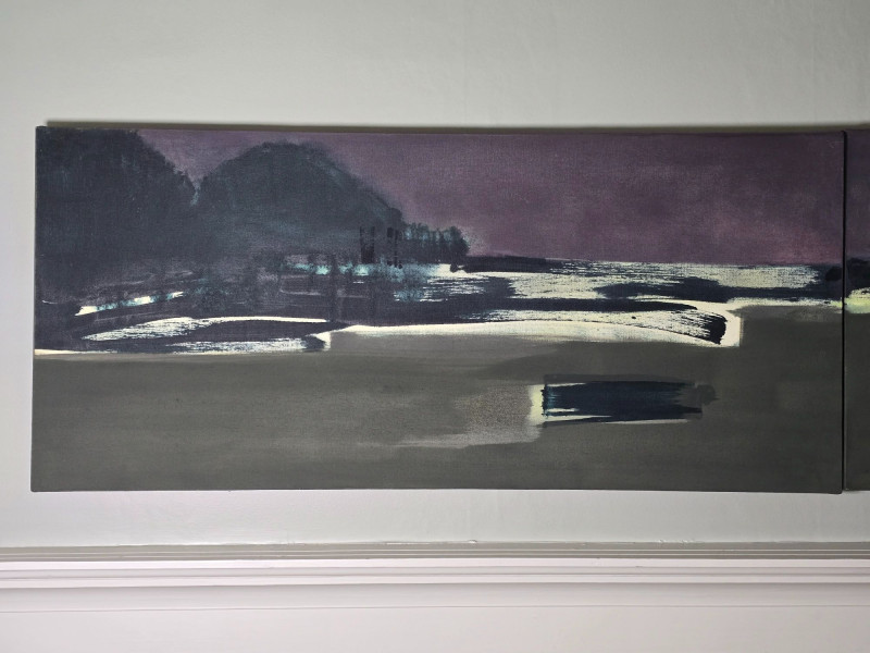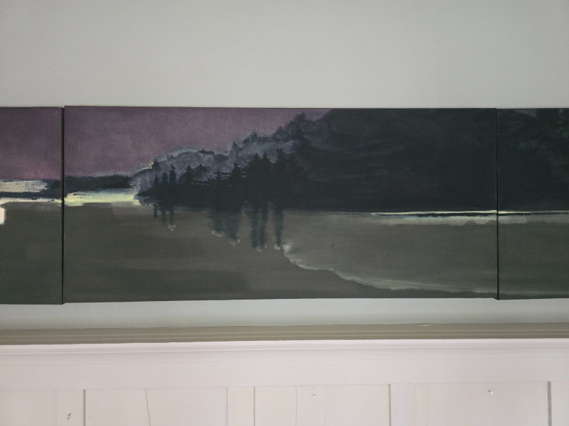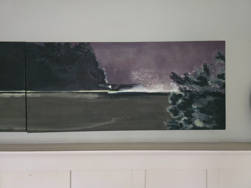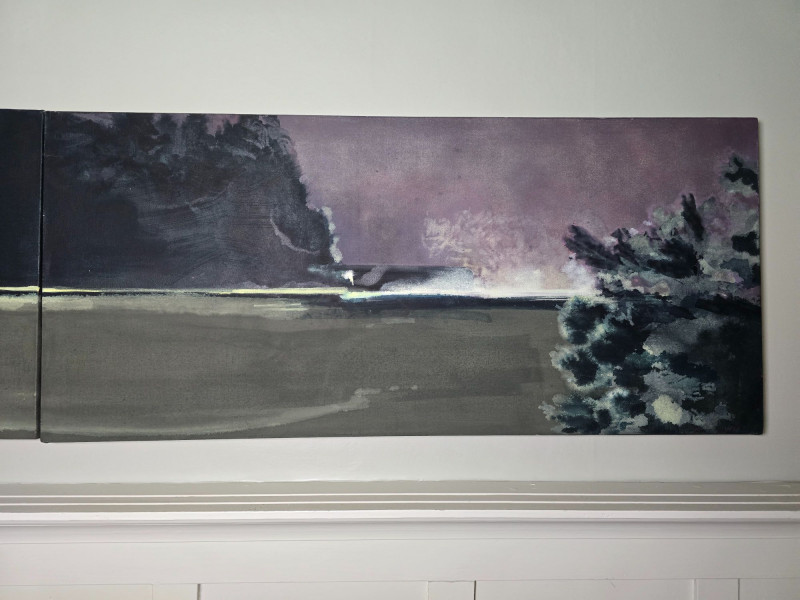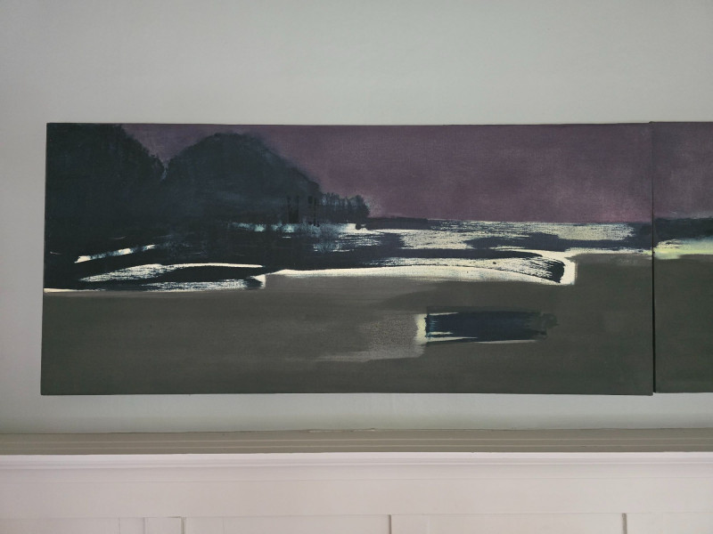 Three‑panel original artwork by contemporary artist Maggie Wilder, titled Pull and Be Damned. This atmospheric composition blends layered color, shifting light, and expressive movement across all three panels, creating a unified visual narrative with strong emotional presence. Wilder’s work often explores tension, introspection, and the interplay between landscape and mood. Her paintings are recognized for their cinematic palettes, soft transitions, and immersive depth, making them well‑suited for modern interiors and collectors of contemporary expressionist work. This triptych reflects her signature approach, using horizon, contrast, and tonal gradients to build a sense of quiet drama. Artwork is unsigned on the piece. Ready for display. About the Artist