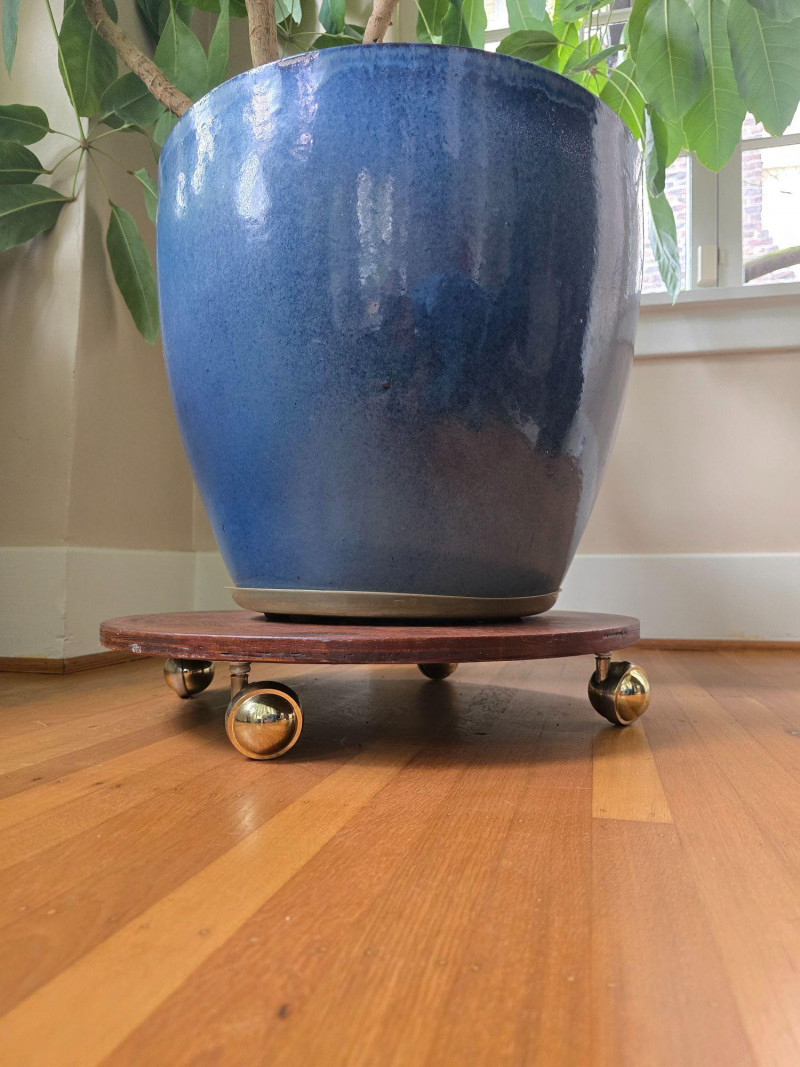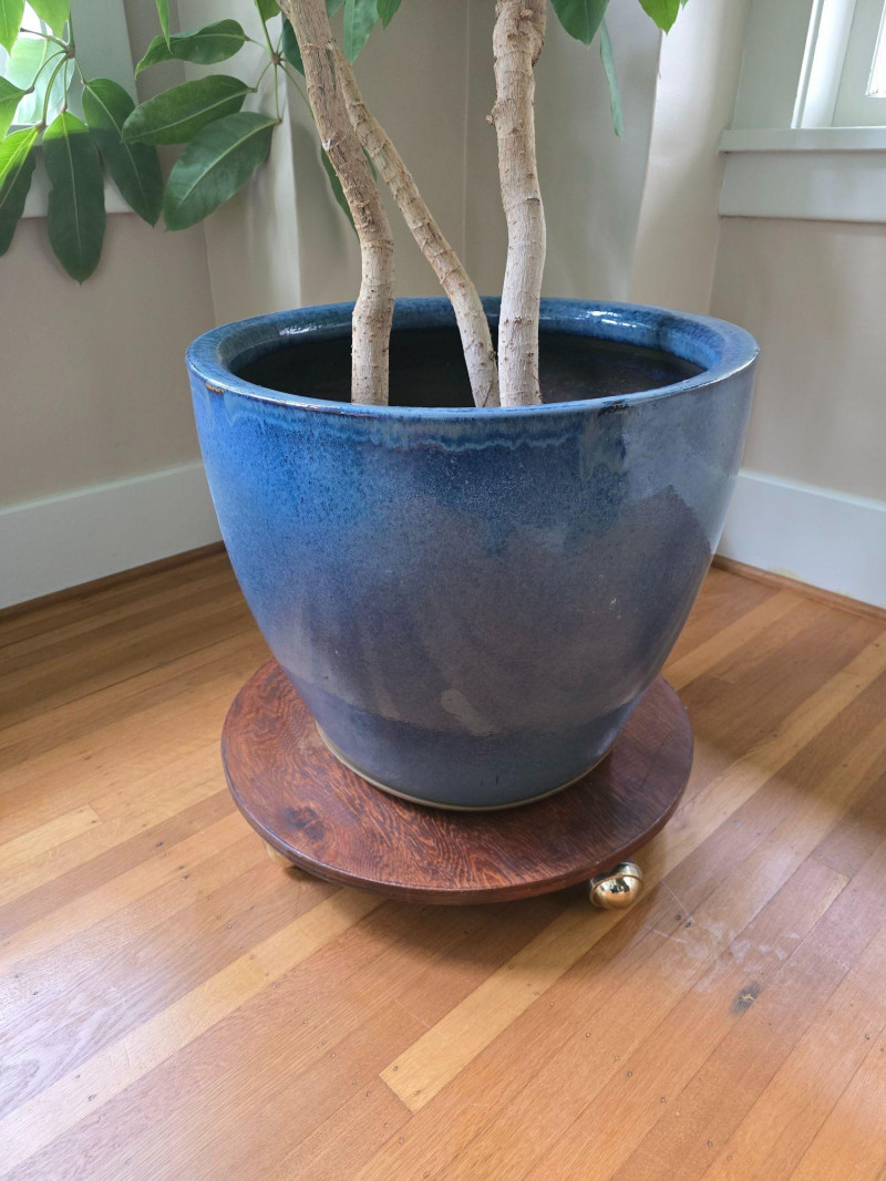 Mature Schefflera (commonly known as the Umbrella Plant) presented in a substantial ceramic pot and set on a solid wooden rolling stand. This is a large, full plant with multiple upright stems and broad green leaf clusters, offering an immediate decorative presence for interior spaces. The ceramic pot is heavy and well‑crafted, and the rolling stand features sturdy casters designed to support the weight of the plant and pot. The entire piece is very large and heavy; buyers should be prepared for careful handling and transport. Includes: