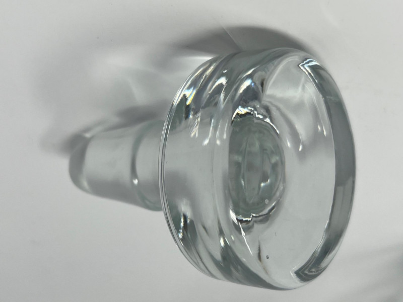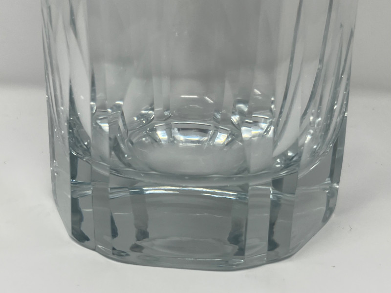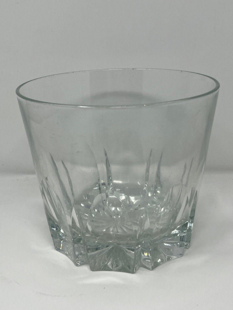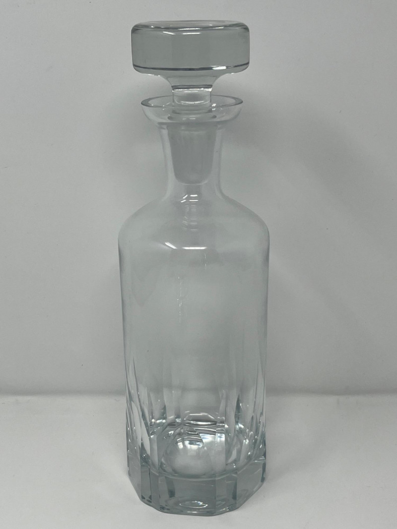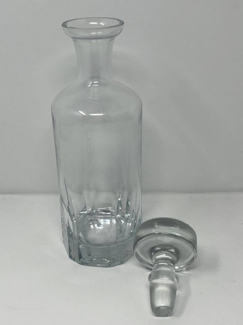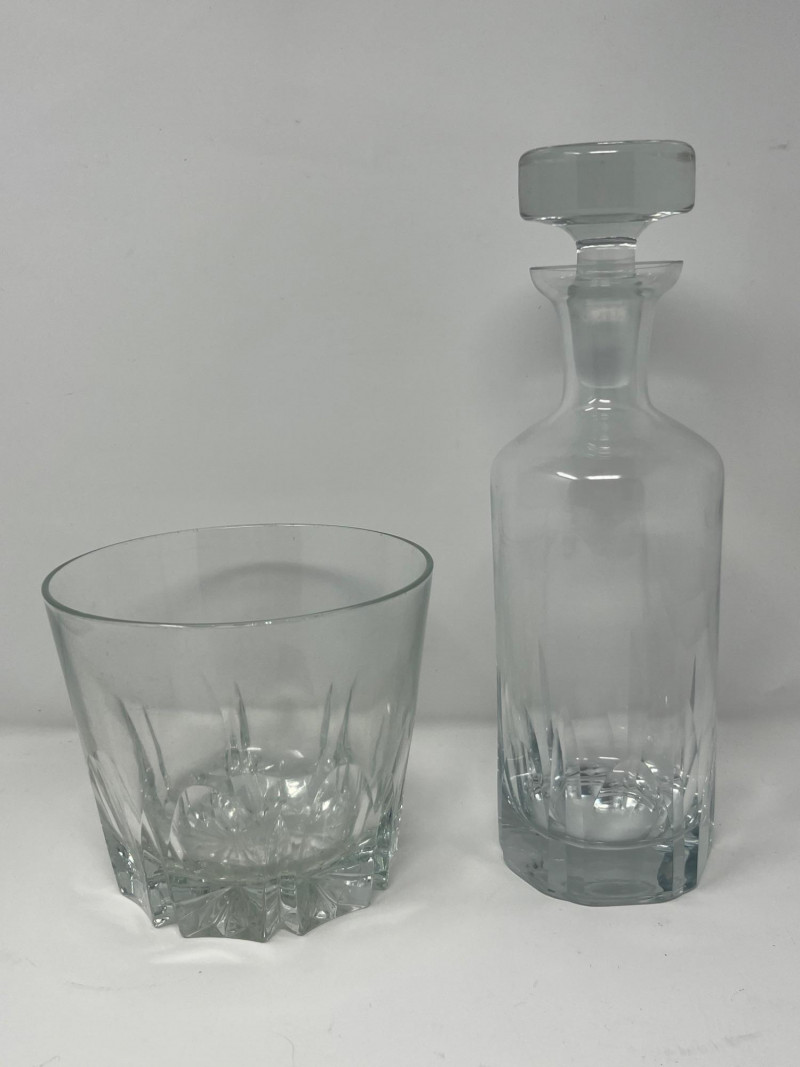 Handsome mid‑century barware duo featuring a tall, faceted clear‑glass decanter with fitted stopper paired with a compact matching ice bucket. The decanter stands approximately 11.5" tall and 4" across, offering an elegant elongated silhouette, while the ice bucket presents a wider, low profile at roughly 6" tall and 5.5" across. Together, the contrasting forms highlight the era’s sculptural approach to everyday barware and create a cohesive, light‑catching display. A refined set for a vintage‑inspired bar, cocktail station, or décor arrangement. Surfaces show wear consistent with age and use. Please review all photos for condition details.