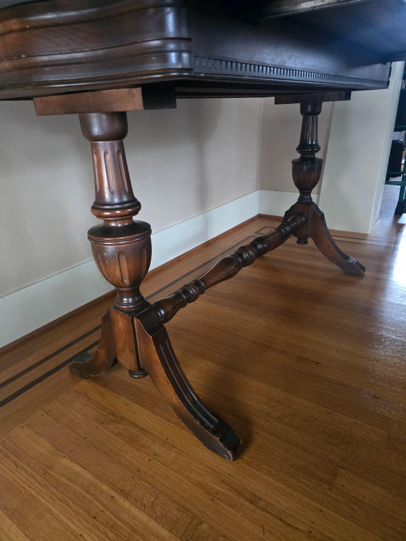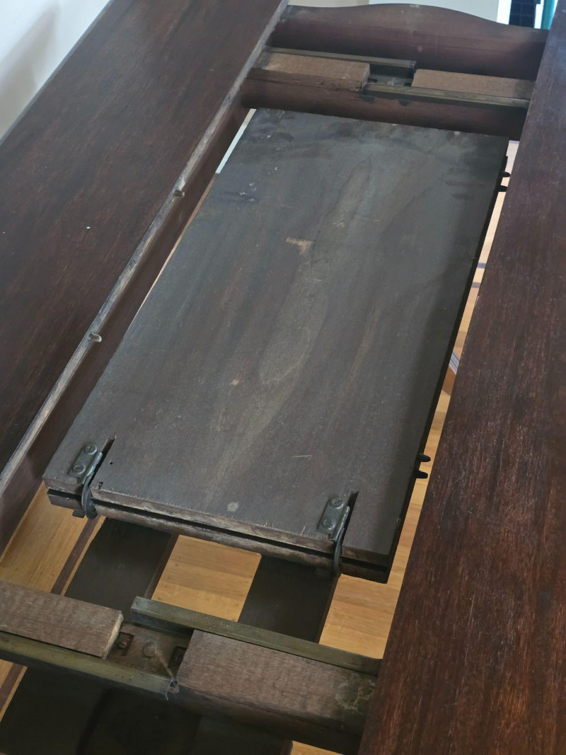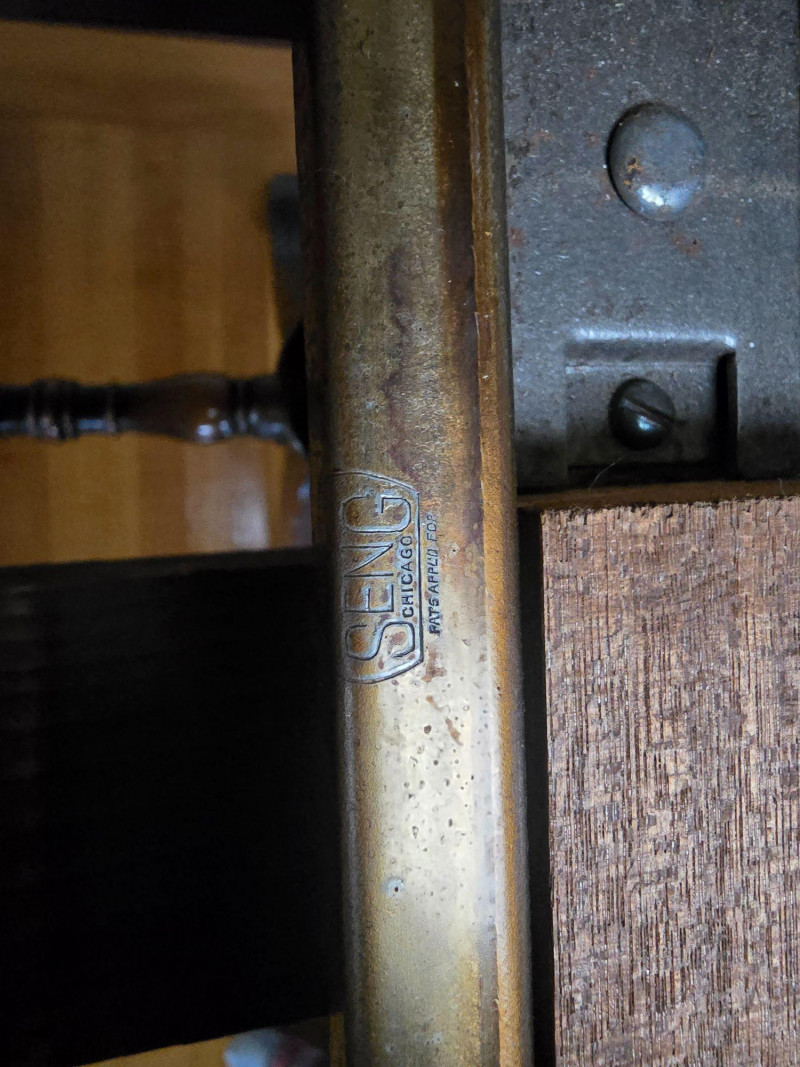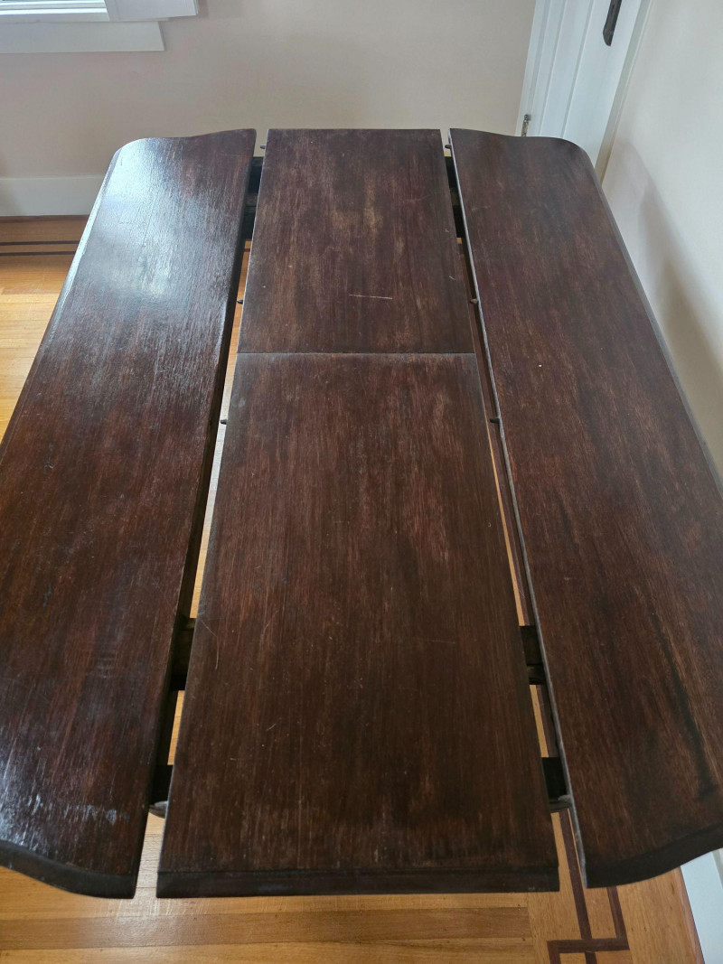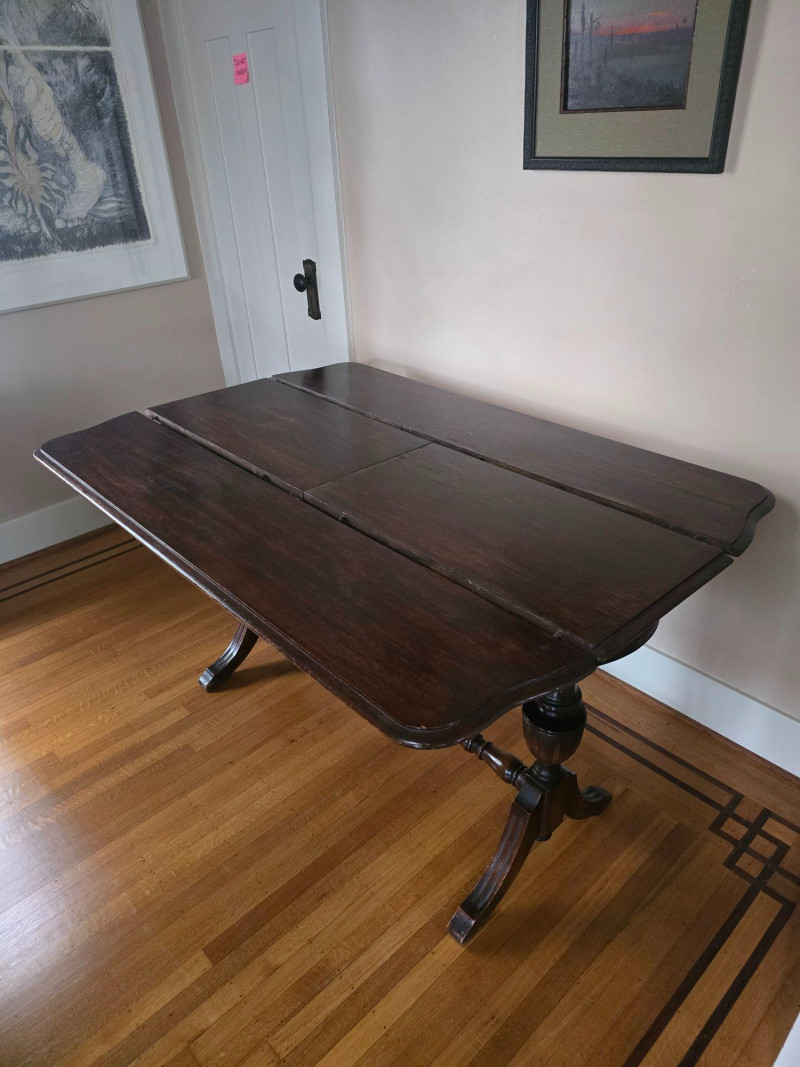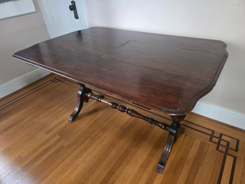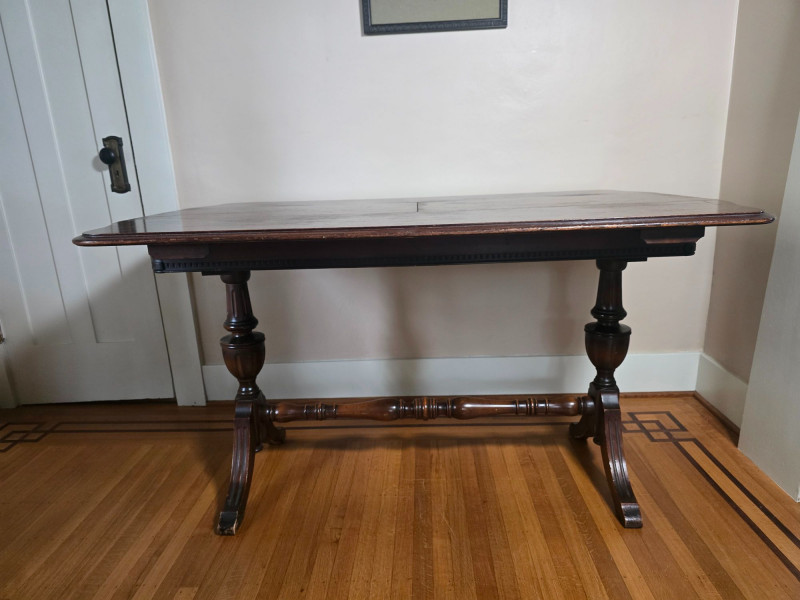 Early 20th‑century extendable dining table featuring original Seng Chicago stamped metal hardware and a traditional pull‑out slide system. The table is crafted in a warm, medium‑dark wood tone with visible grain and stands on four turned legs joined by a shaped stretcher, giving it a classic period profile. The extension mechanism opens smoothly on its original metal tracks, designed to accommodate additional leaves (not included). Underside views show intact hardware, support rails, and the authentic construction typical of the era. Surface wear, finish variation, and age‑appropriate marks are present throughout, consistent with long-term use and adding to its antique character. A solid, well‑built piece suitable for restoration, display, or everyday use in a vintage‑inspired interior. Condition Notes: