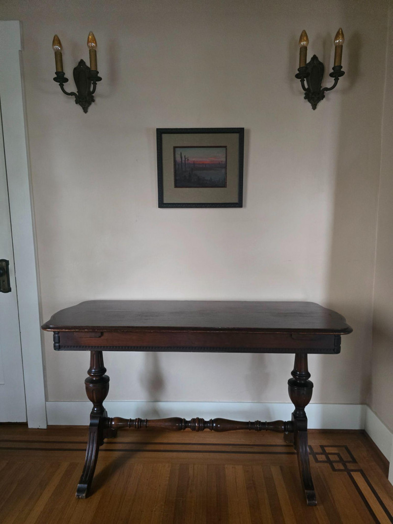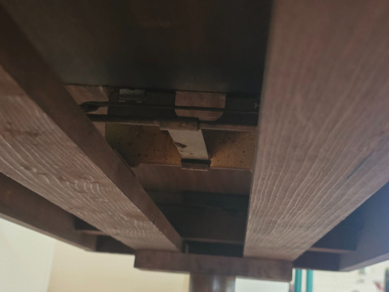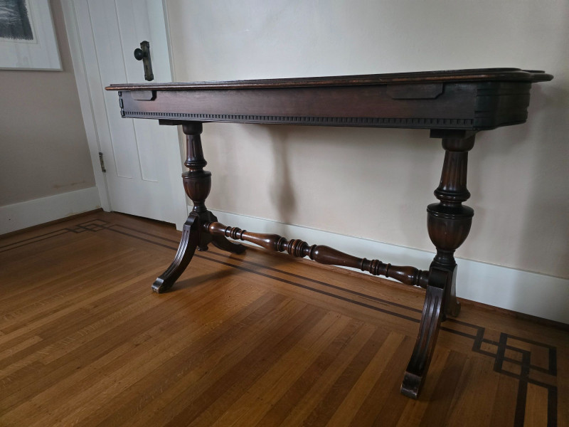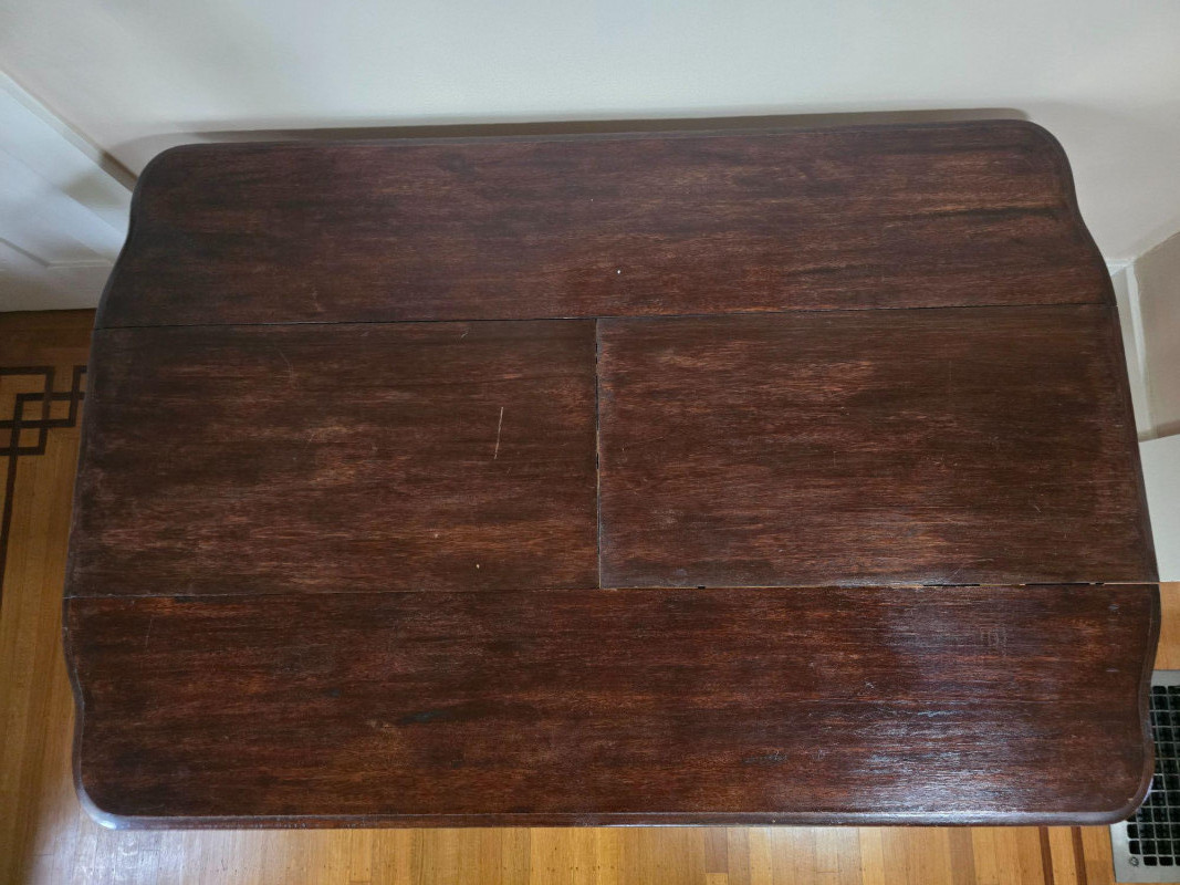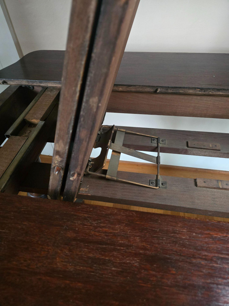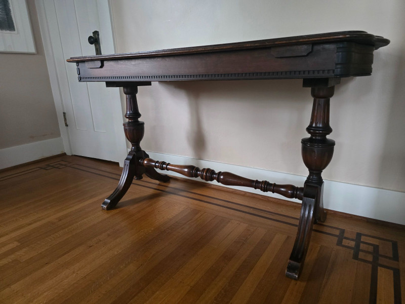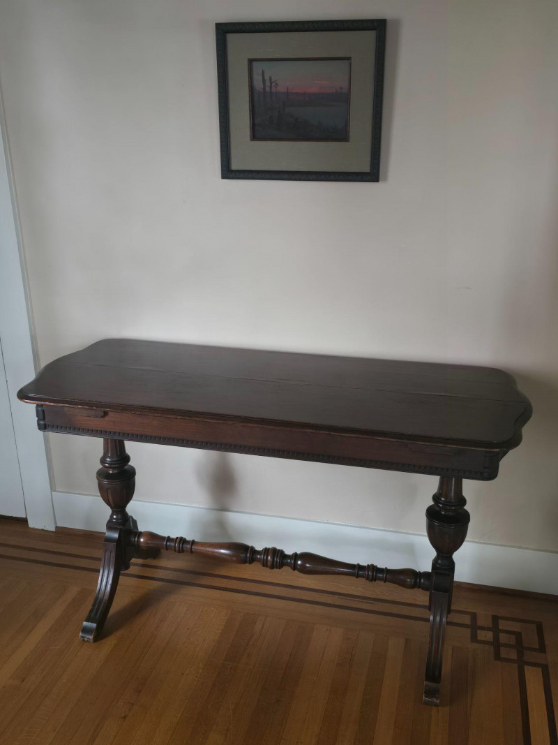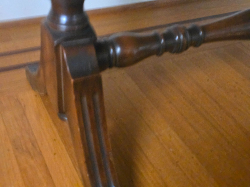 Early 20th‑century extendable dining table featuring original Seng Chicago stamped metal hardware and a traditional pull‑out slide system. The table is crafted in a warm, medium‑dark wood tone with visible grain and stands on four turned legs joined by a shaped stretcher, giving it a classic period profile. The extension mechanism opens smoothly on its original metal tracks, designed to accommodate additional leaves (not included). Underside views show intact hardware, support rails, and the authentic construction typical of the era. Surface wear, finish variation, and age‑appropriate marks are present throughout, consistent with long-term use and adding to its antique character. A solid, well‑built piece suitable for restoration, display, or everyday use in a vintage‑inspired interior. Condition Notes: