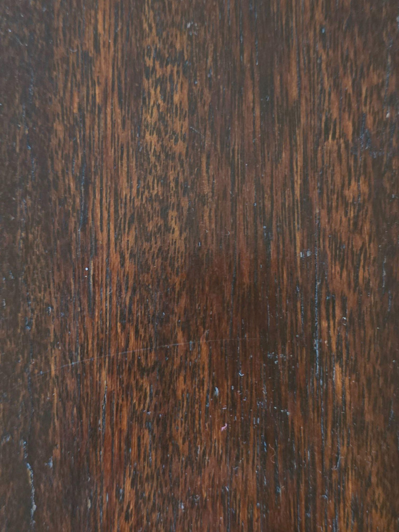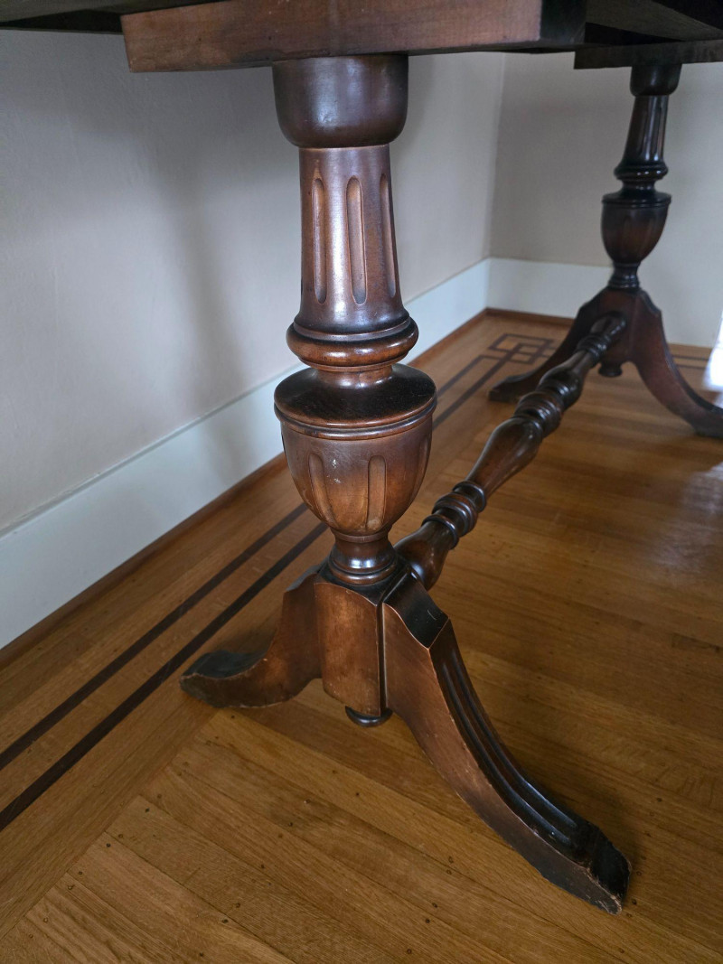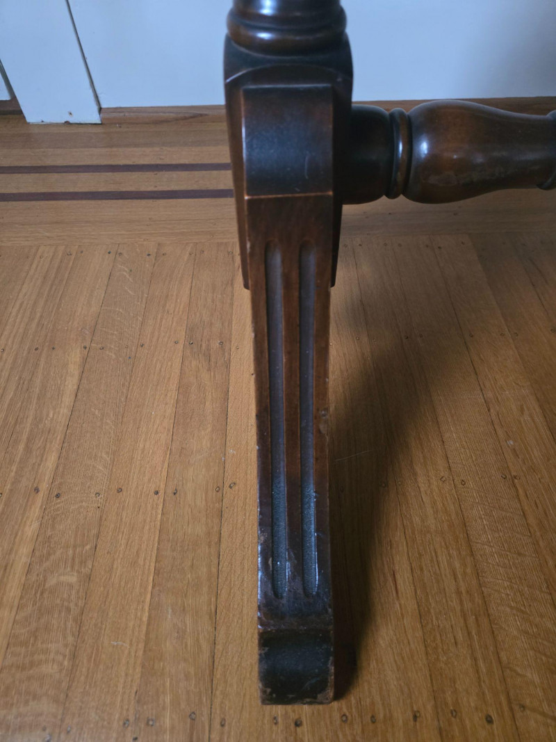 Wear consistent with age and use; scratches, finish wear, and marks to top and legs; extension mechanism intact; leaves not included.