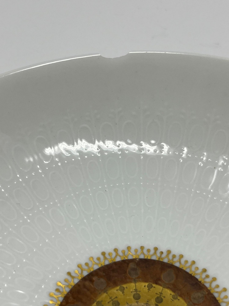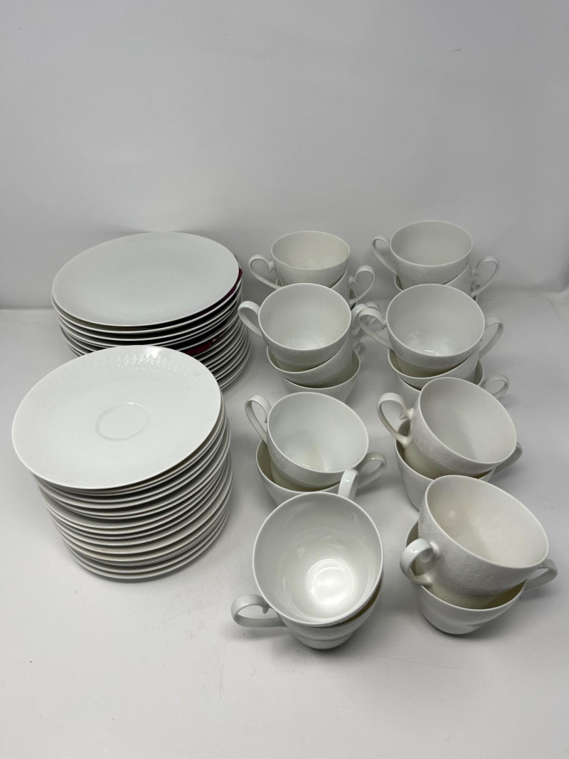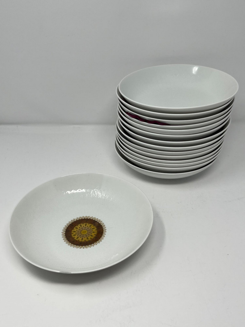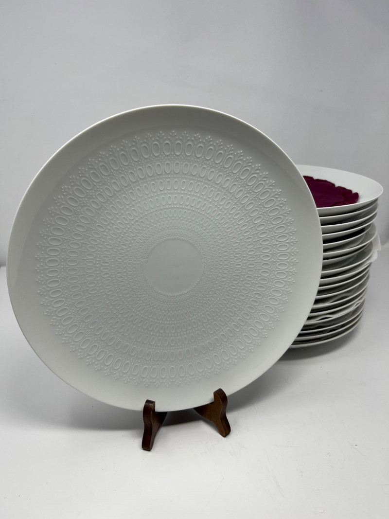 A substantial collection of Rosenthal Germany china, spanning three distinct Rosenthal brandings across the set. This grouping includes a wide range of service pieces, with both gold‑center decorated designs and plain white embossed forms represented. This estate set has been carefully photographed, including all individual condition notes. A few pieces show light surface cracks that have been professionally repaired, and one bowl has a small chip to the rim. Please review all photos for close‑up documentation of these areas. Any damage to the fiew that are were photographed; most are in excellent condition. A classic Rosenthal assortment suitable for collectors, decorators, or those seeking high‑quality German porcelain with elegant mixed‑pattern appeal. The set includes plates, bowls, serving pieces, cups, and additional tableware forms, offering a versatile and expansive selection. Marks observed across the set include: