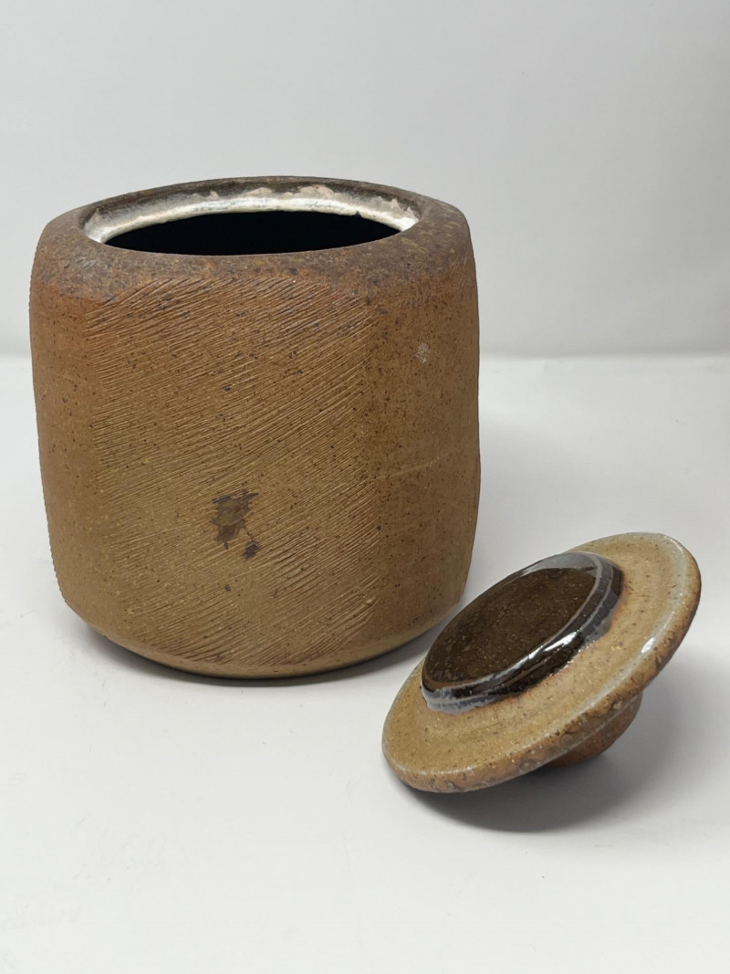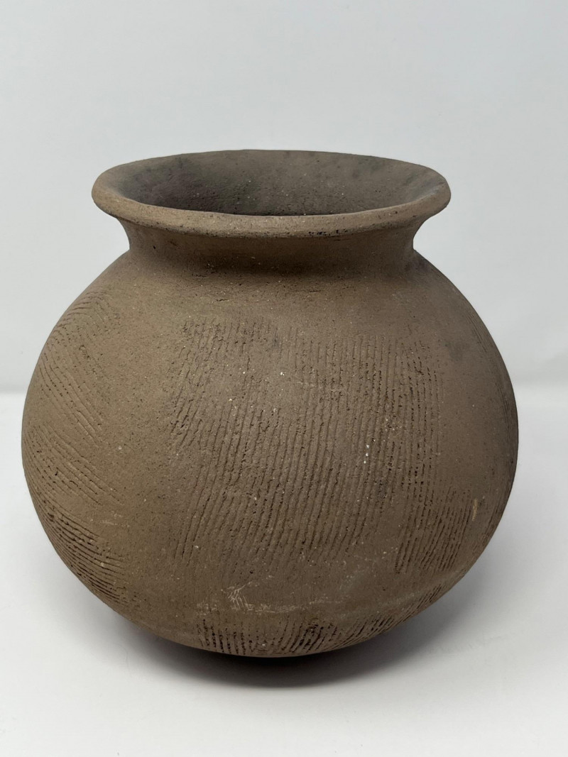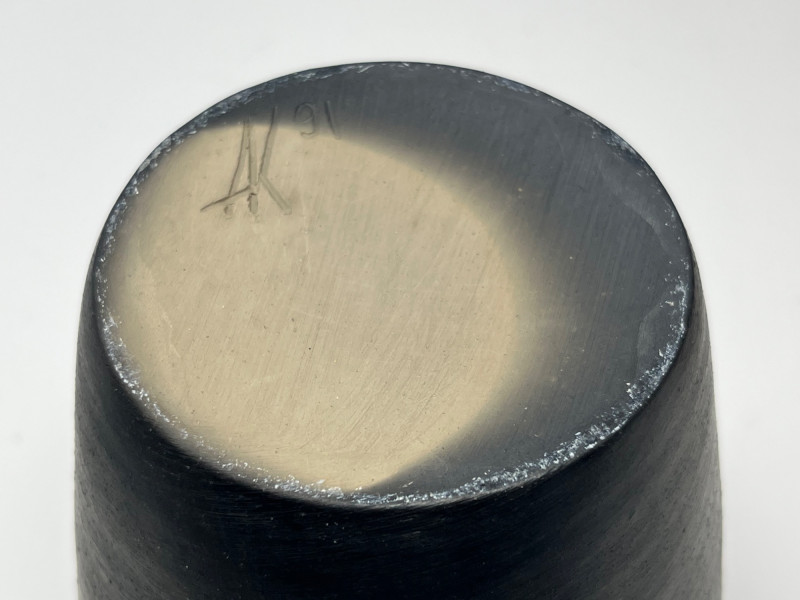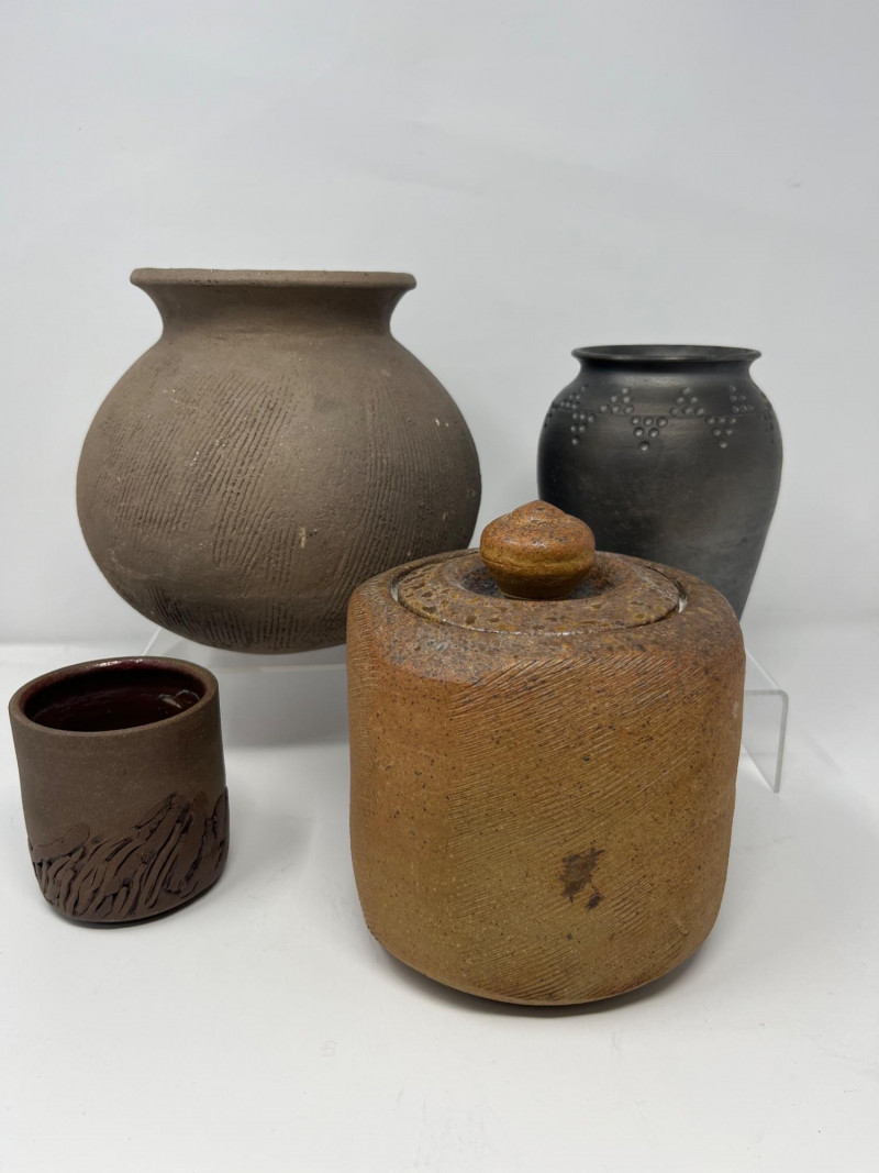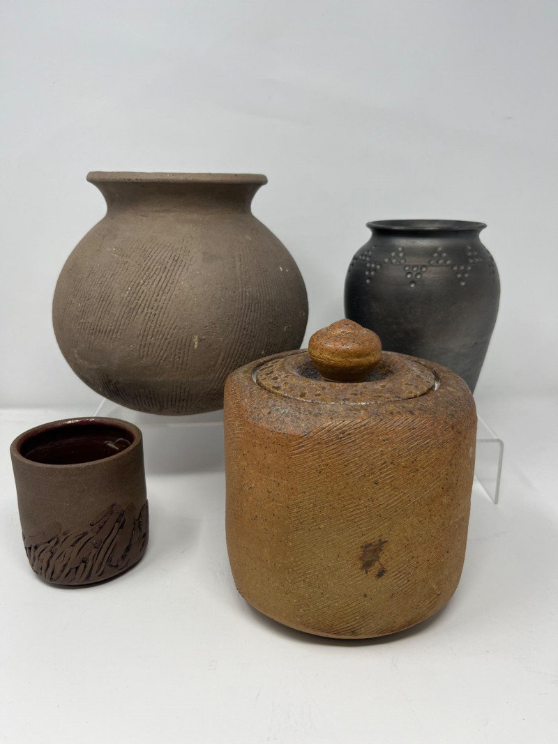 Collection of late‑20th‑century studio pottery vessels in varied wheel‑thrown forms, showcasing the era’s emphasis on material expression and hand‑crafted individuality. Surfaces range from smooth, burnished finishes to tactile, hand‑textured exteriors. Glaze palettes include deep charcoal, warm chestnut, muted clay red, and natural stone hues—each piece reflecting the organic, earth‑driven aesthetic characteristic of small‑batch ceramic studios of the period. The black vase is signed AK ’91 on the underside, featuring a dark satin glaze and modernist profile. The brown lidded vessel carries a faint signature with ’94, finished in an iron‑rich, rustic glaze typical of the decade’s artisan work. Remaining vessels are unsigned but consistent with late‑20th‑century studio production. Pots range approximately 3 1/2"–8" tall and 3"–7" wide. A cohesive group for collectors of regional studio ceramics and lovers of warm, earthy, material‑forward design.