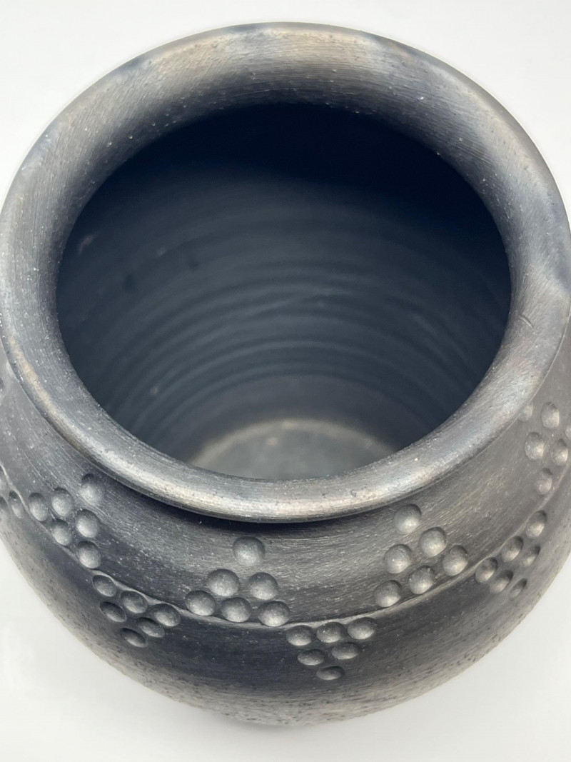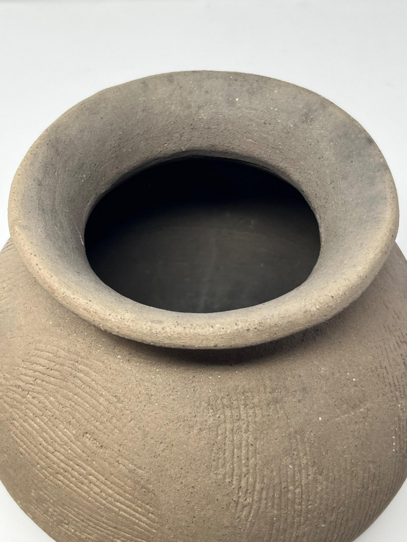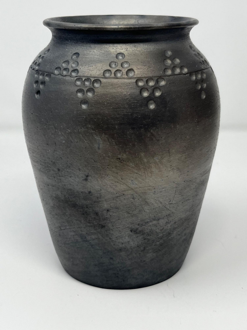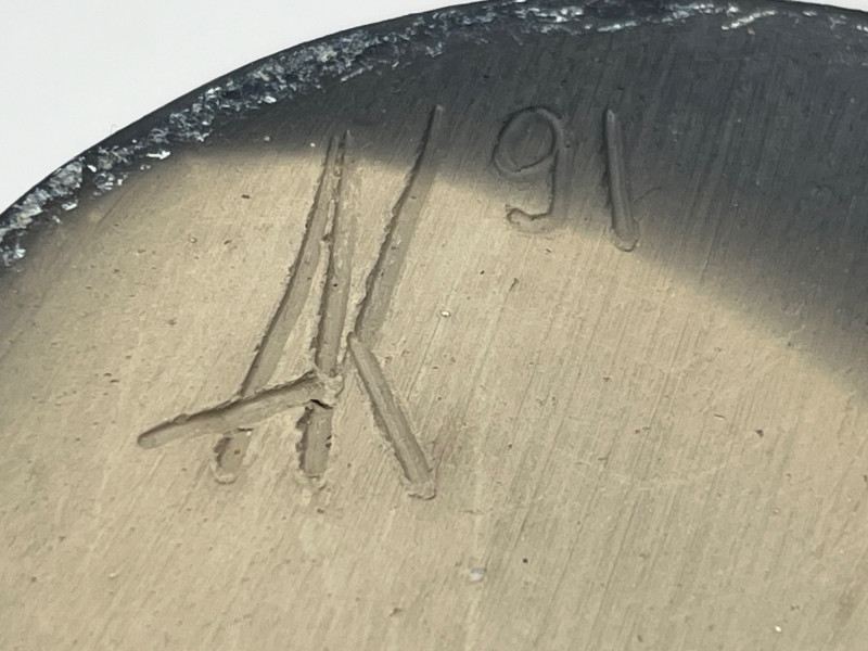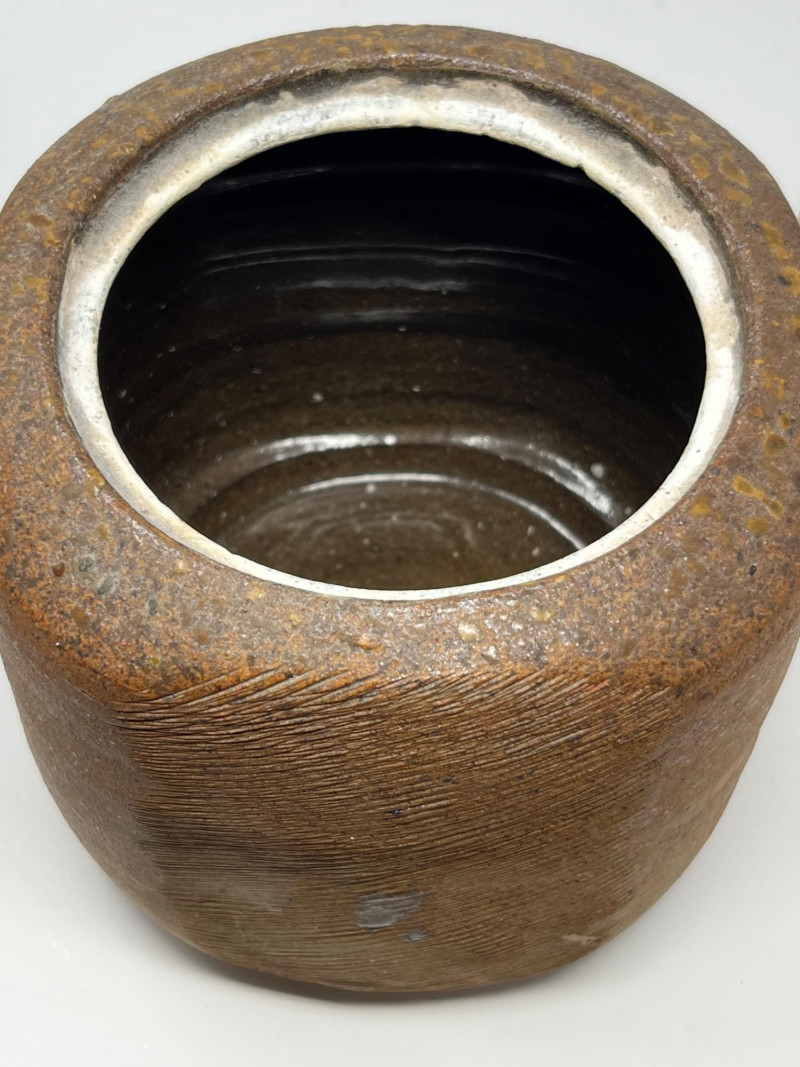Collection of late‑20th‑century studio pottery vessels in varied wheel‑thrown forms, showcasing the era’s emphasis on material expression and hand‑crafted individuality. Surfaces range from smooth, burnished finishes to tactile, hand‑textured exteriors. Glaze palettes include deep charcoal, warm chestnut, muted clay red, and natural stone hues—each piece reflecting the organic, earth‑driven aesthetic characteristic of small‑batch ceramic studios of the period. The black vase is signed AK ’91 on the underside, featuring a dark satin glaze and modernist profile. The brown lidded vessel carries a faint signature with ’94, finished in an iron‑rich, rustic glaze typical of the decade’s artisan work. Remaining vessels are unsigned but consistent with late‑20th‑century studio production. Pots range approximately 3 1/2"–8" tall and 3"–7" wide. A cohesive group for collectors of regional studio ceramics and lovers of warm, earthy, material‑forward design.
