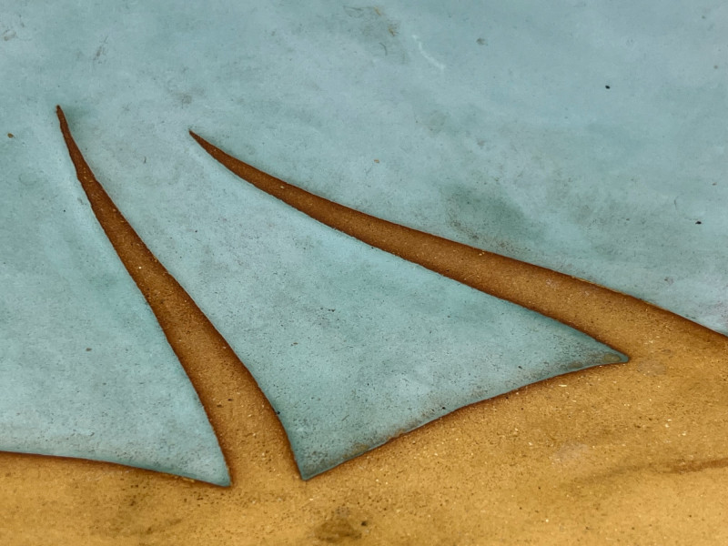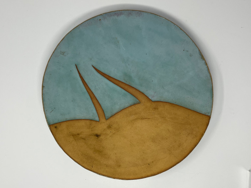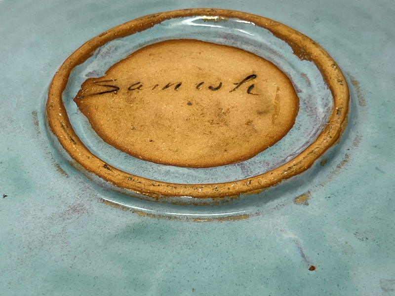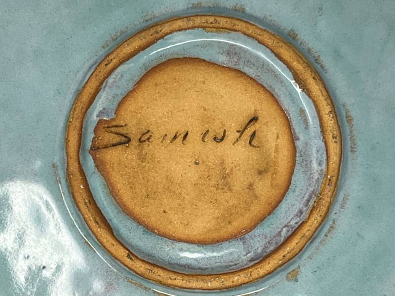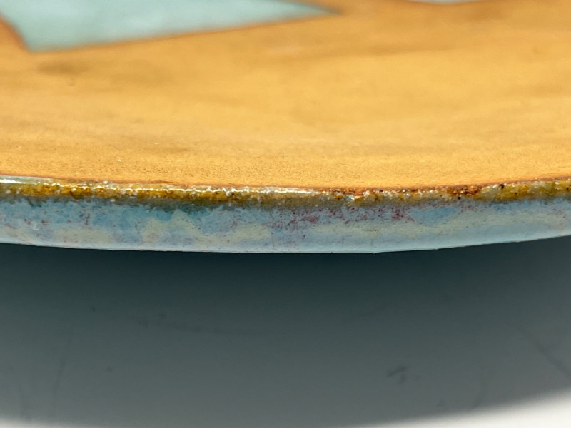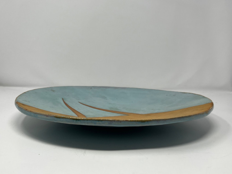This handcrafted pottery plate features a bold, earth‑toned glaze with abstract, horn‑like motifs that echo global and tribal design traditions. The layered blue and tan surface creates a dynamic, organic aesthetic reminiscent of hand‑formed ceremonial or folk‑art vessels found across diverse cultural regions. The underside bears the artist’s signature, Steve Davis. Natural variations in texture and glaze application contribute to its character and authenticity. A striking piece for collectors who appreciate global‑influenced ceramics, artisan‑made décor, and sculptural pottery forms.