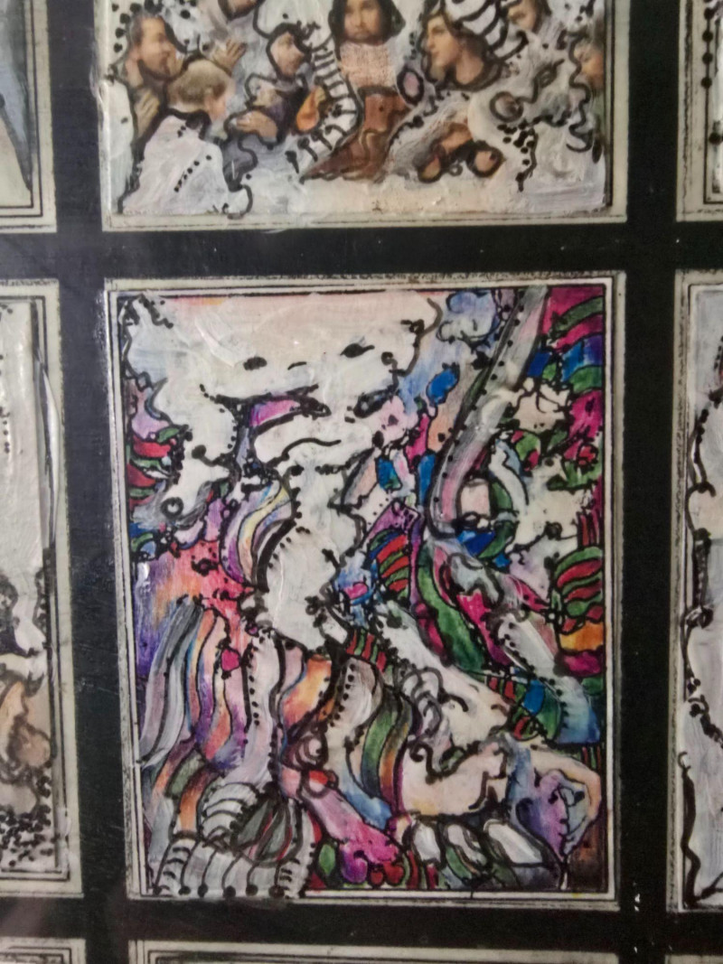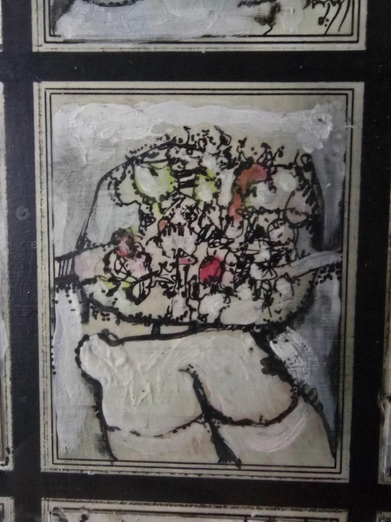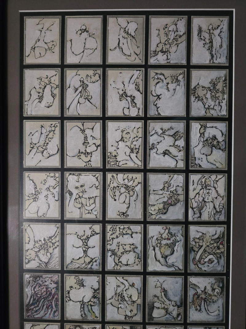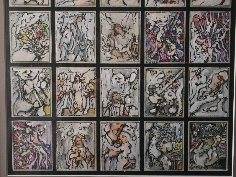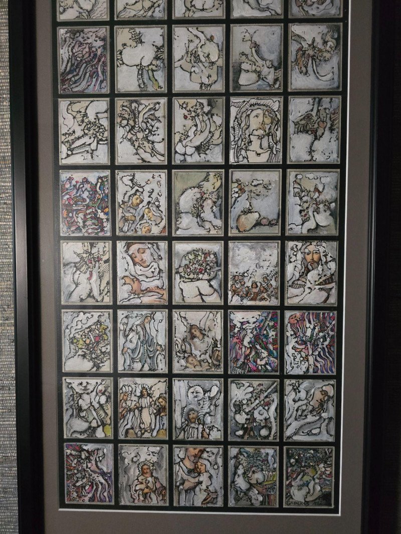 Compelling original mixed media panel by Pacific Northwest artist Gerald Gedekes, signed and dated 1992. This work consists of 60 individually rendered components, each executed with Gedekes’ distinctive blend of expressive linework, layered media, and symbolic abstraction. The imagery moves between anatomical studies and religious iconography, distilled into abstract forms that create a rhythmic, narrative‑driven grid. The result is a visually dense and conceptually layered panel that rewards close viewing. This piece was originally created as part of a four‑panel installation, unified in theme and structure. Each panel is being sold separately. This artist signature is incorporated into the last corner panel. Gerald Gedekes is a Washington‑based mixed‑media artist recognized for his modular panel constructions, intricate mark‑making, and symbolic visual language. Working throughout the late 20th century, Gedekes developed a practice that merges drawing, collage, and layered materials to explore the human body, spiritual motifs, and mythic narratives through abstraction. His work is known for its dense compositional structure, expressive immediacy, and the interplay between figurative suggestion and conceptual form. Gedekes’ pieces are held in private collections across the Pacific Northwest and are valued for their craftsmanship, thematic depth, and strong presence in contemporary interiors. Note: The artist bio in the photos is for information. it is not included in the sale.Artist Biography: Gerald Gedekes