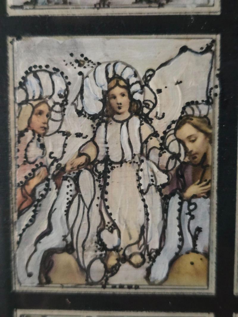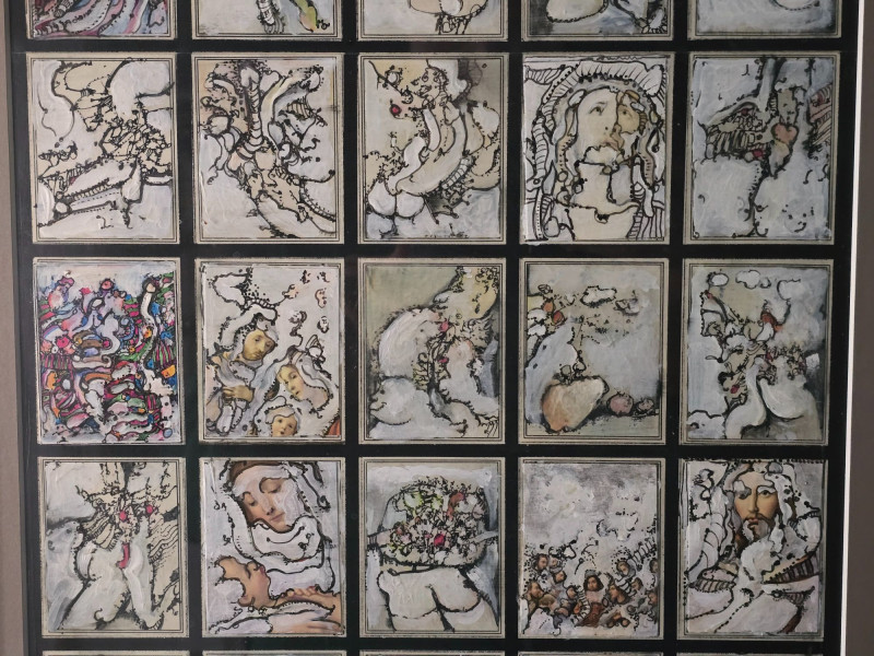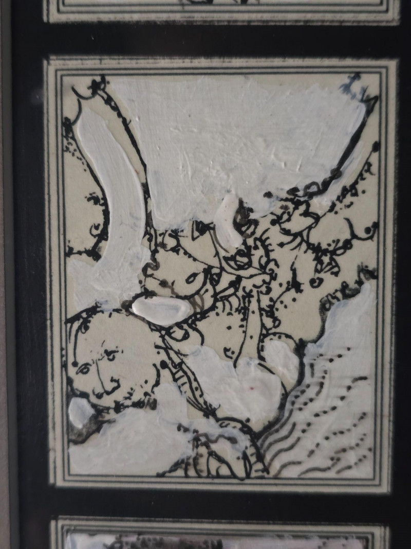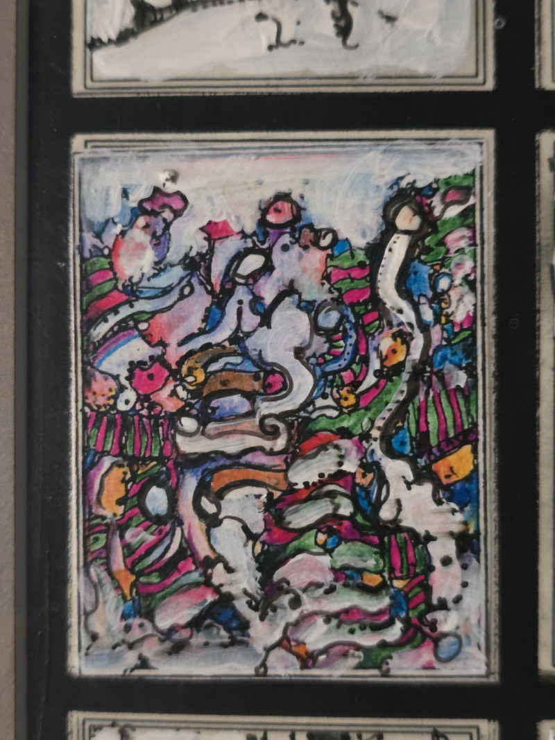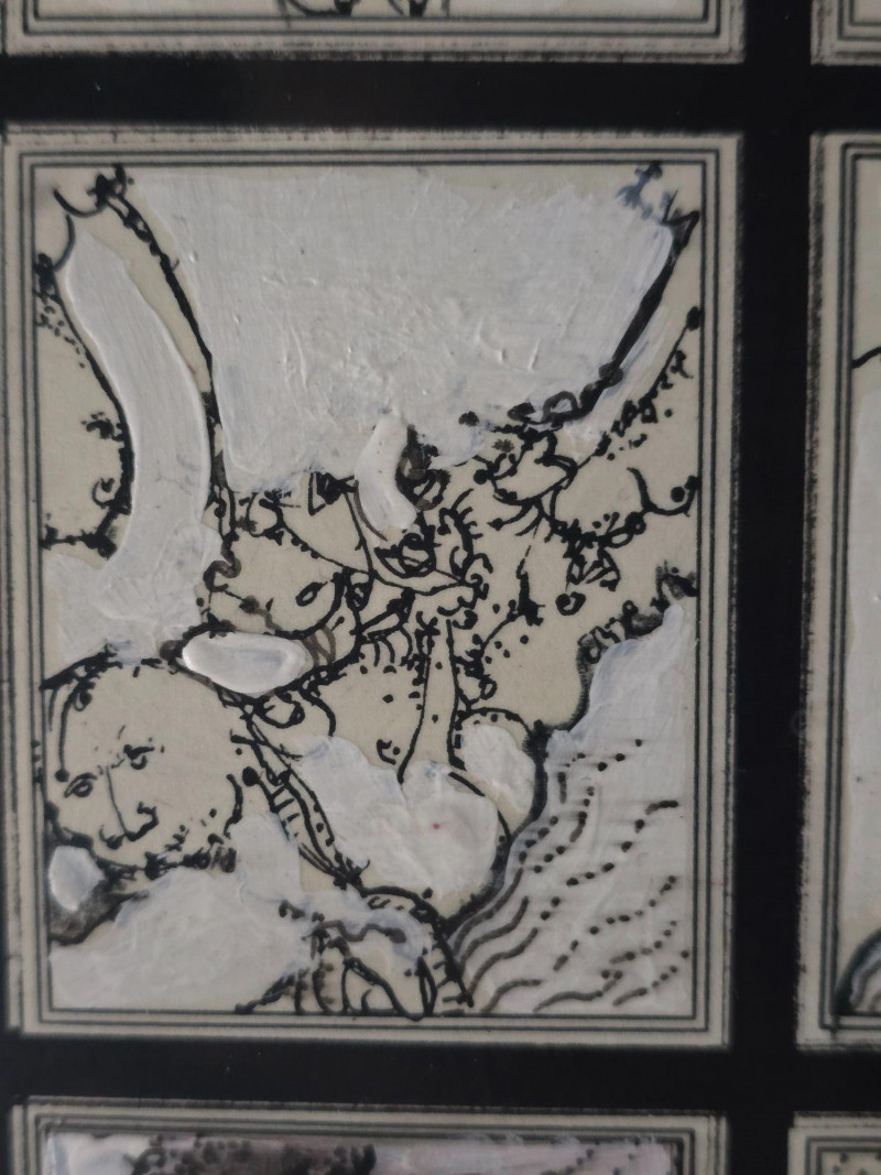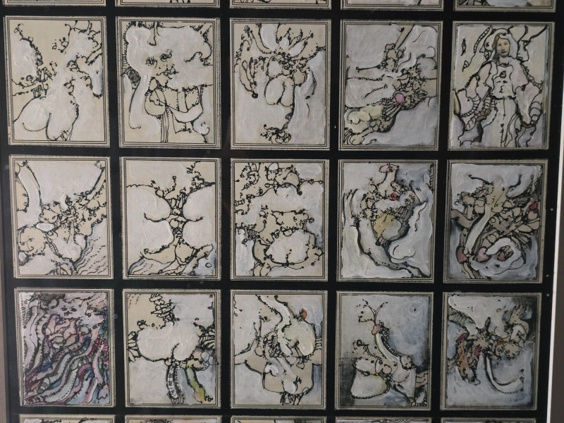 Compelling original mixed media panel by Pacific Northwest artist Gerald Gedekes, signed and dated 1992. This work consists of 60 individually rendered components, each executed with Gedekes’ distinctive blend of expressive linework, layered media, and symbolic abstraction. The imagery moves between anatomical studies and religious iconography, distilled into abstract forms that create a rhythmic, narrative‑driven grid. The result is a visually dense and conceptually layered panel that rewards close viewing. This piece was originally created as part of a four‑panel installation, unified in theme and structure. Each panel is being sold separately. This artist signature is incorporated into the last corner panel. Gerald Gedekes is a Washington‑based mixed‑media artist recognized for his modular panel constructions, intricate mark‑making, and symbolic visual language. Working throughout the late 20th century, Gedekes developed a practice that merges drawing, collage, and layered materials to explore the human body, spiritual motifs, and mythic narratives through abstraction. His work is known for its dense compositional structure, expressive immediacy, and the interplay between figurative suggestion and conceptual form. Gedekes’ pieces are held in private collections across the Pacific Northwest and are valued for their craftsmanship, thematic depth, and strong presence in contemporary interiors. Note: The artist bio in the photos is for information. it is not included in the sale.Artist Biography: Gerald Gedekes