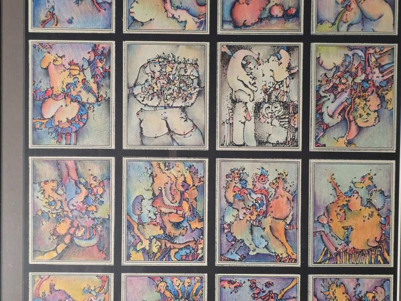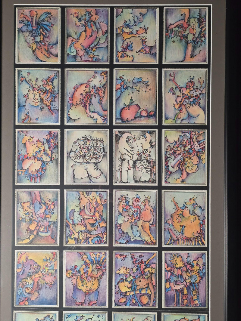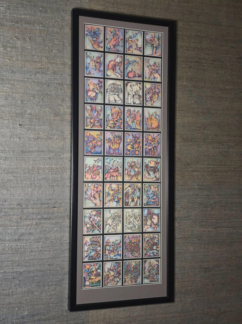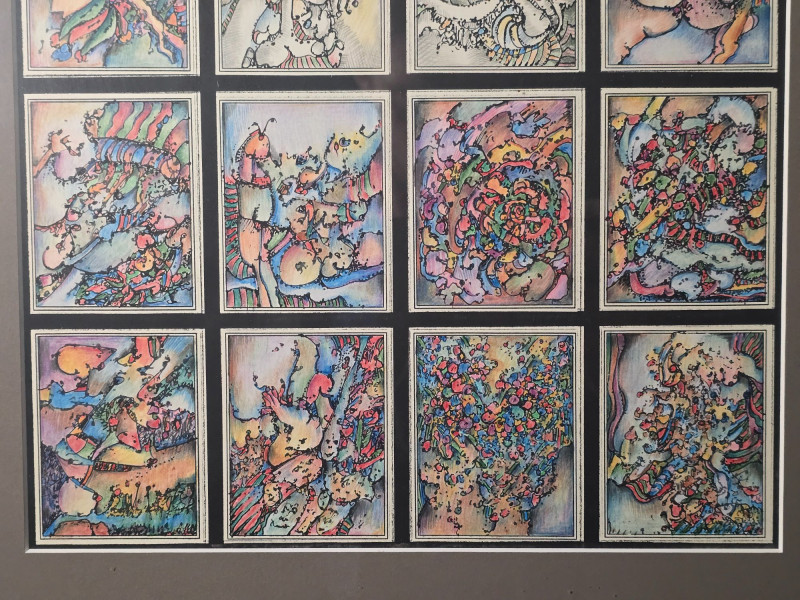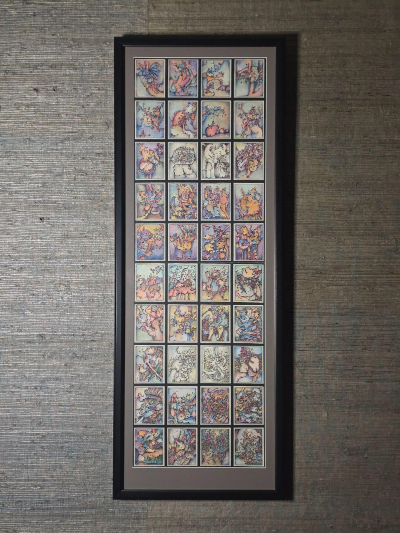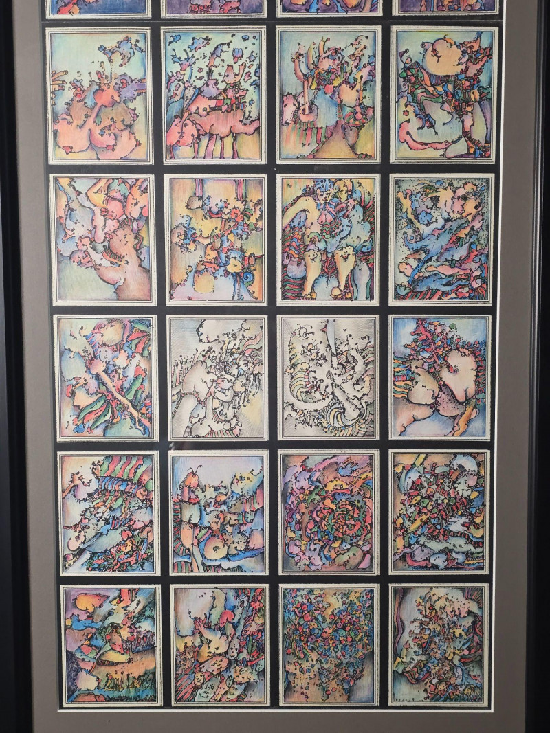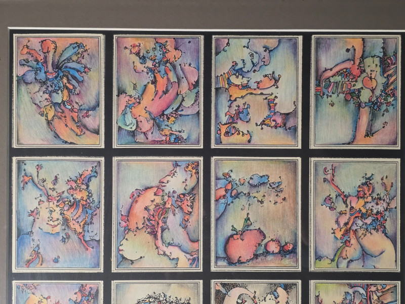 Vibrant original mixed media panel by Pacific Northwest artist Gerald Gedekes, signed and dated 1992. This dynamic work is composed of 40 individually rendered components, each contributing to a richly layered grid of abstract anatomical forms and expressive, color‑driven imagery. Gedekes blends gestural linework with saturated hues to create a rhythmic field of figures, symbols, and organic structures that shift between the bodily and the surreal. The result is a visually striking panel that rewards close study and carries strong presence in contemporary interiors. This piece was originally created as part of a four‑panel installation, unified in theme and execution. Each panel is being sold separately. Gerald Gedekes is a Washington‑based mixed‑media artist recognized for his modular panel constructions, intricate mark‑making, and expressive visual language. His work often merges drawing, collage, and layered materials to explore the human form through abstraction, incorporating anatomical suggestion, symbolic motifs, and vivid color relationships. Active throughout the late 20th century, Gedekes developed a distinctive practice rooted in repetition, narrative fragmentation, and the interplay between structure and spontaneity. His pieces are held in private collections across the Pacific Northwest and are valued for their craftsmanship, conceptual depth, and bold visual impact.Artist Biography: Gerald Gedekes