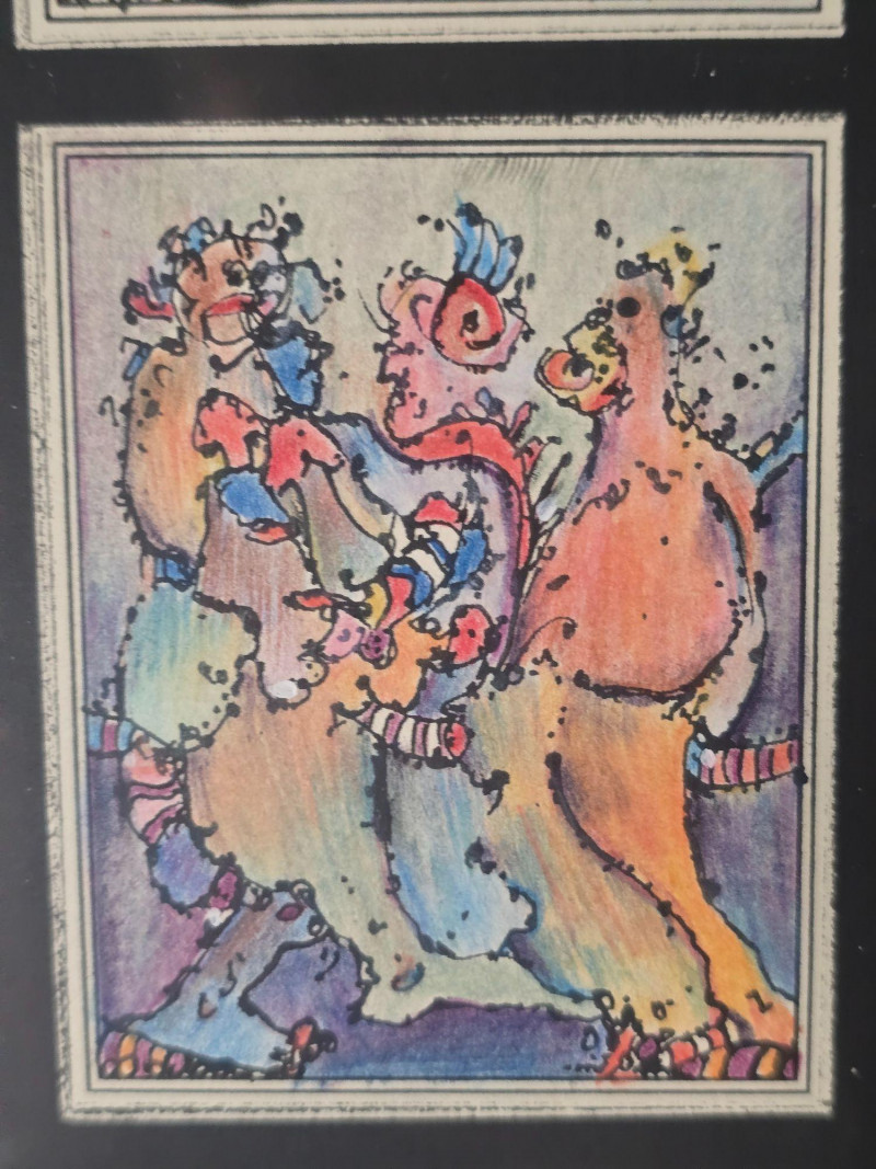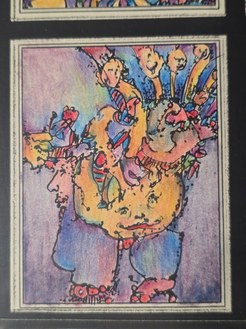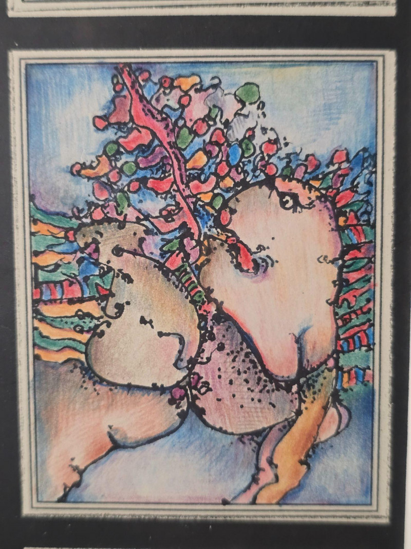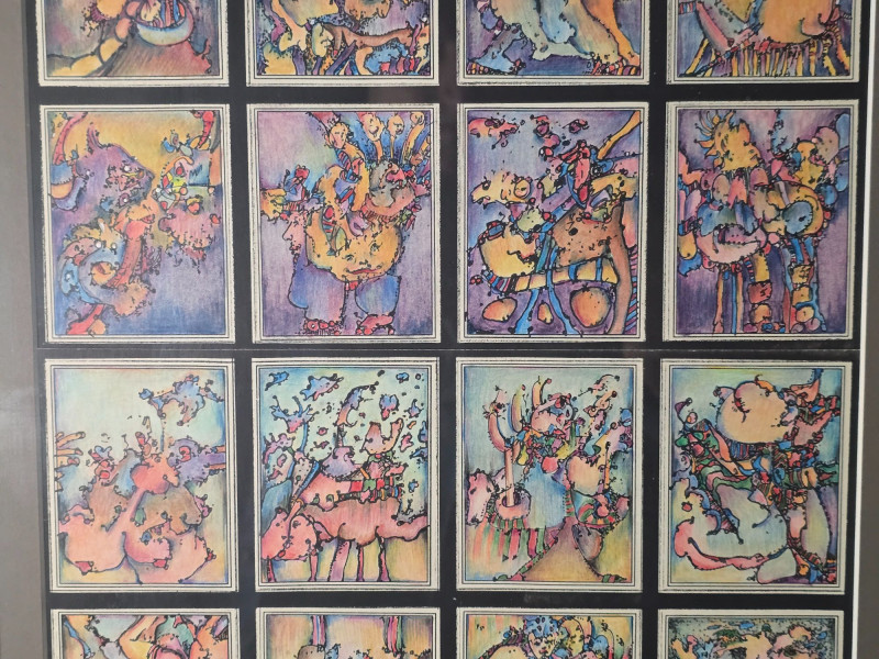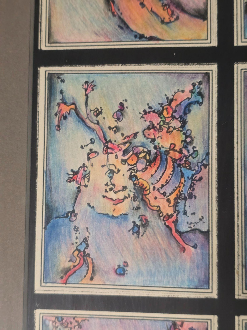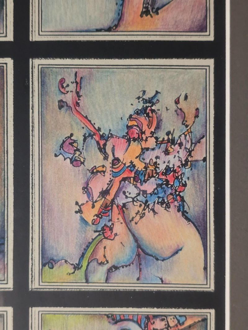 Vibrant original mixed media panel by Pacific Northwest artist Gerald Gedekes, signed and dated 1992. This dynamic work is composed of 40 individually rendered components, each contributing to a richly layered grid of abstract anatomical forms and expressive, color‑driven imagery. Gedekes blends gestural linework with saturated hues to create a rhythmic field of figures, symbols, and organic structures that shift between the bodily and the surreal. The result is a visually striking panel that rewards close study and carries strong presence in contemporary interiors. This piece was originally created as part of a four‑panel installation, unified in theme and execution. Each panel is being sold separately. Gerald Gedekes is a Washington‑based mixed‑media artist recognized for his modular panel constructions, intricate mark‑making, and expressive visual language. His work often merges drawing, collage, and layered materials to explore the human form through abstraction, incorporating anatomical suggestion, symbolic motifs, and vivid color relationships. Active throughout the late 20th century, Gedekes developed a distinctive practice rooted in repetition, narrative fragmentation, and the interplay between structure and spontaneity. His pieces are held in private collections across the Pacific Northwest and are valued for their craftsmanship, conceptual depth, and bold visual impact.Artist Biography: Gerald Gedekes