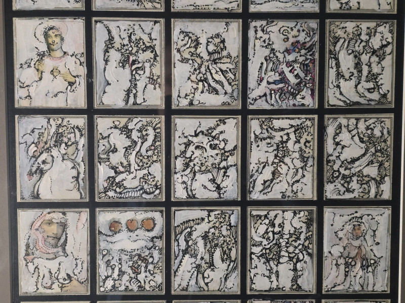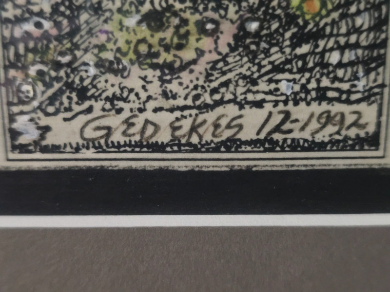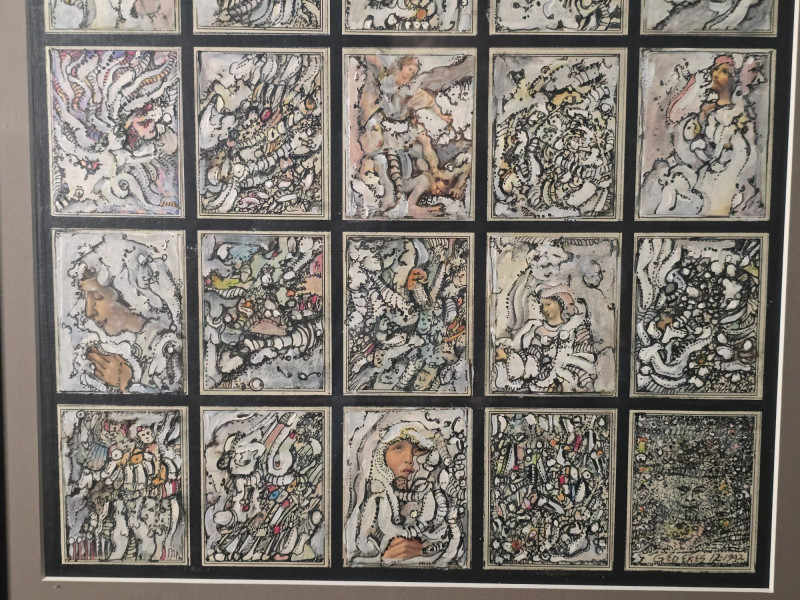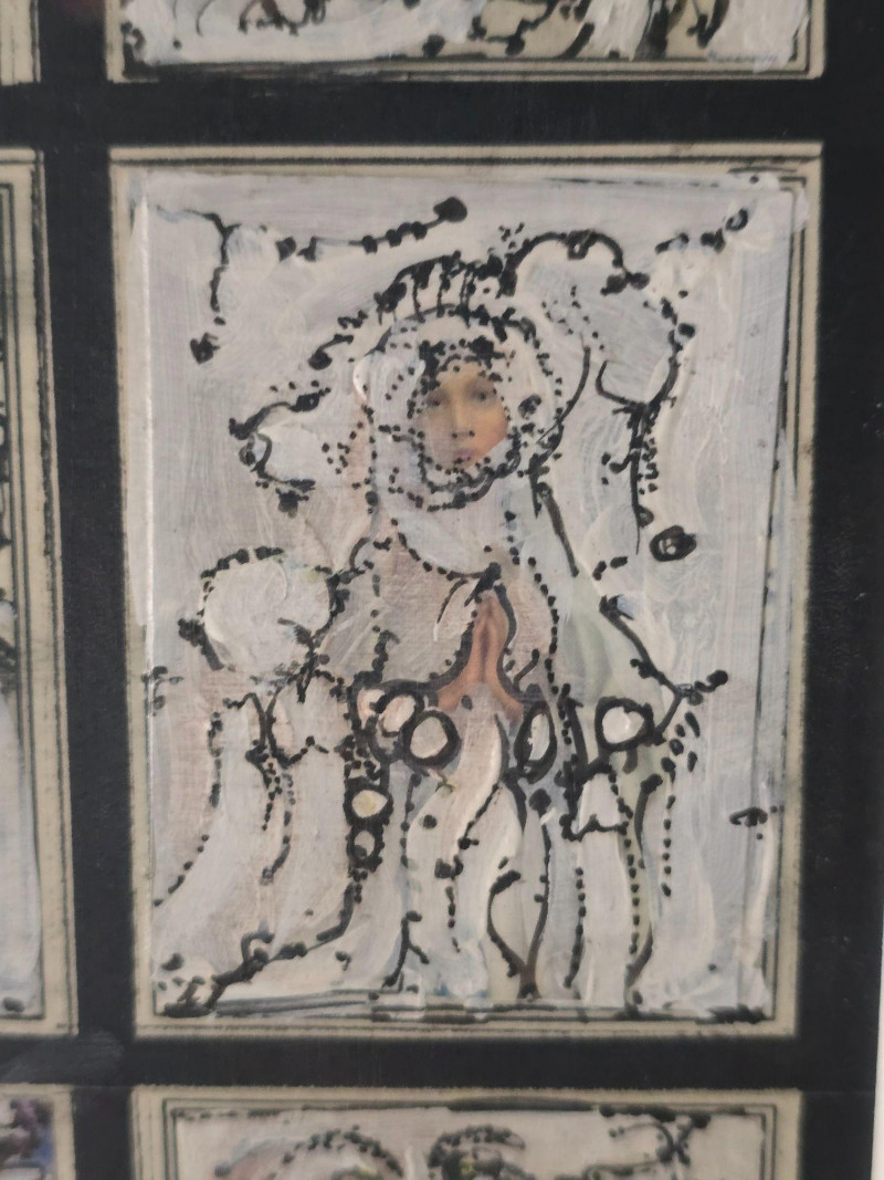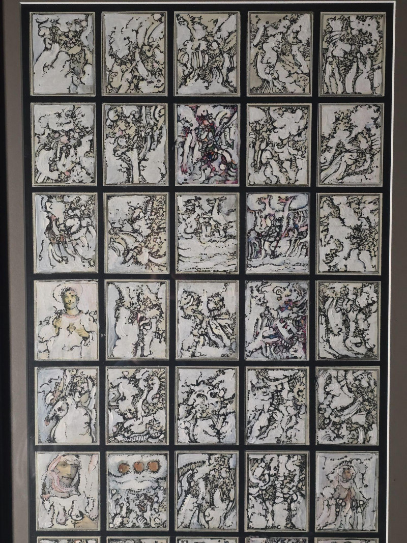 Compelling original mixed media panel by Pacific Northwest artist Gerald Gedekes, signed and dated 1992. This work consists of 60 individually rendered components, each executed with Gedekes’ distinctive blend of expressive linework, layered media, and symbolic abstraction. The imagery moves between anatomical studies and religious iconography, distilled into abstract forms that create a rhythmic, narrative‑driven grid. The result is a visually dense and conceptually layered panel that rewards close viewing. This piece was originally created as part of a four‑panel installation, unified in theme and structure. Each panel is being sold separately. This artist signature is incorporated into the last corner panel. Gerald Gedekes is a Washington‑based mixed‑media artist recognized for his modular panel constructions, intricate mark‑making, and symbolic visual language. Working throughout the late 20th century, Gedekes developed a practice that merges drawing, collage, and layered materials to explore the human body, spiritual motifs, and mythic narratives through abstraction. His work is known for its dense compositional structure, expressive immediacy, and the interplay between figurative suggestion and conceptual form. Gedekes’ pieces are held in private collections across the Pacific Northwest and are valued for their craftsmanship, thematic depth, and strong presence in contemporary interiors. Note: The artist bio in the photos is for information. it is not included in the sale.Artist Biography: Gerald Gedekes