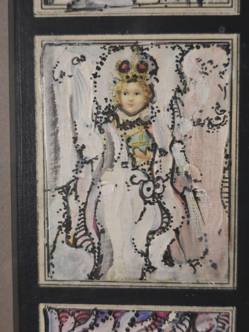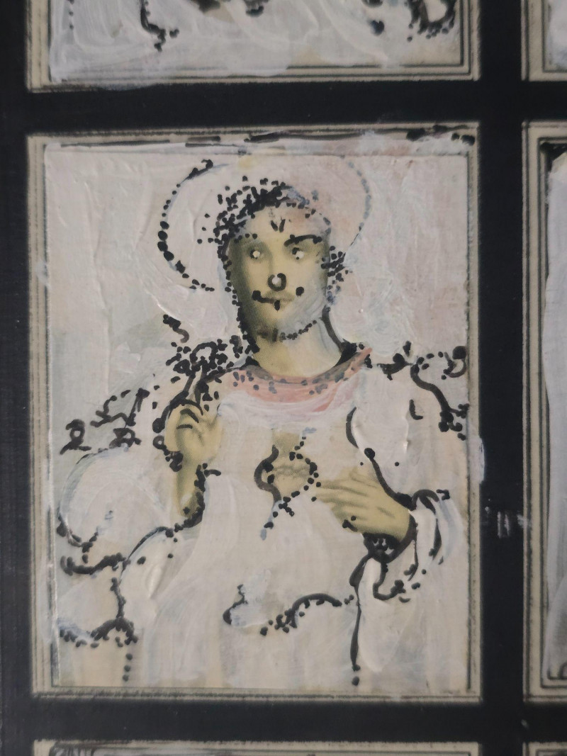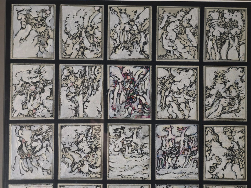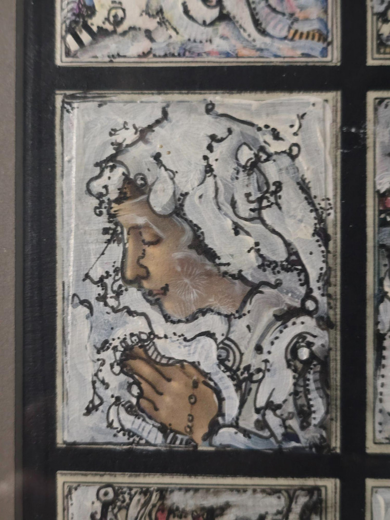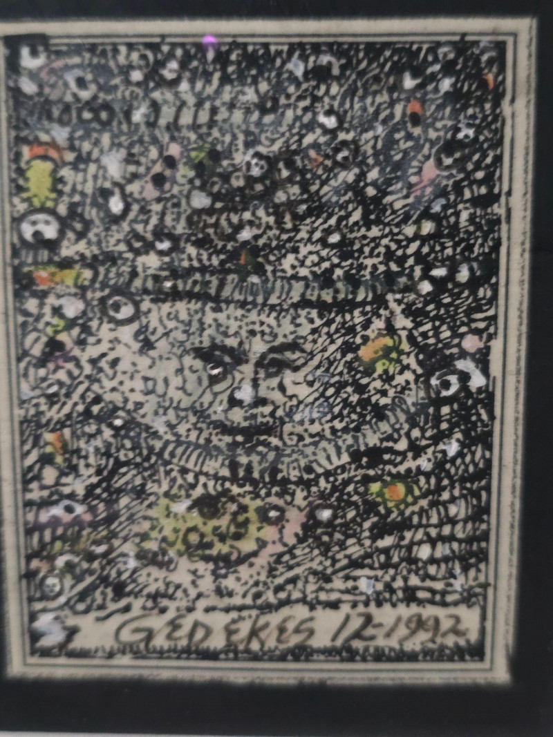 Compelling original mixed media panel by Pacific Northwest artist Gerald Gedekes, signed and dated 1992. This work consists of 60 individually rendered components, each executed with Gedekes’ distinctive blend of expressive linework, layered media, and symbolic abstraction. The imagery moves between anatomical studies and religious iconography, distilled into abstract forms that create a rhythmic, narrative‑driven grid. The result is a visually dense and conceptually layered panel that rewards close viewing. This piece was originally created as part of a four‑panel installation, unified in theme and structure. Each panel is being sold separately. This artist signature is incorporated into the last corner panel. Gerald Gedekes is a Washington‑based mixed‑media artist recognized for his modular panel constructions, intricate mark‑making, and symbolic visual language. Working throughout the late 20th century, Gedekes developed a practice that merges drawing, collage, and layered materials to explore the human body, spiritual motifs, and mythic narratives through abstraction. His work is known for its dense compositional structure, expressive immediacy, and the interplay between figurative suggestion and conceptual form. Gedekes’ pieces are held in private collections across the Pacific Northwest and are valued for their craftsmanship, thematic depth, and strong presence in contemporary interiors. Note: The artist bio in the photos is for information. it is not included in the sale.Artist Biography: Gerald Gedekes